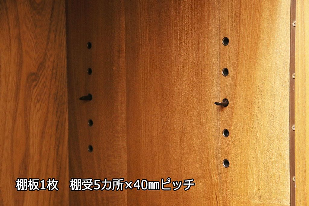 棚板は取り外しできます。左のみ棚板は1枚あります。棚受けは5ヶ所、40mmピッチで調整できます。棚幅サイズのものが1枚の作りです。