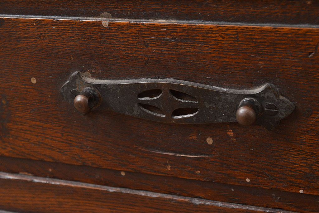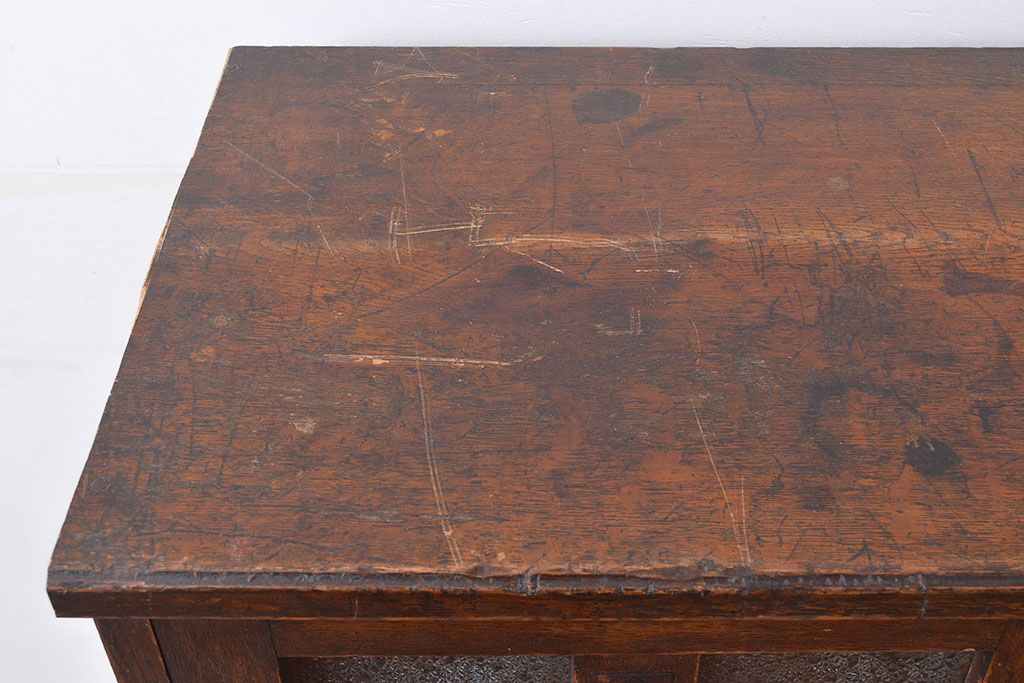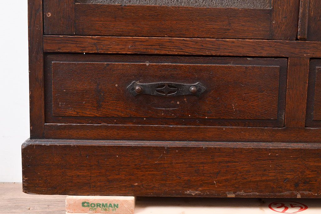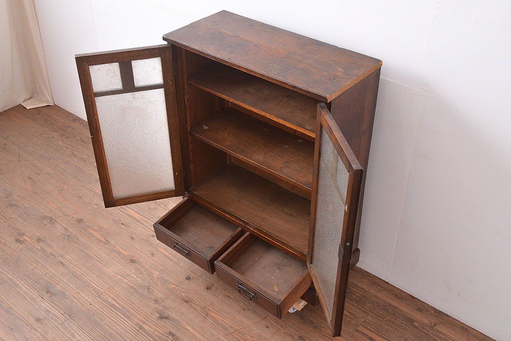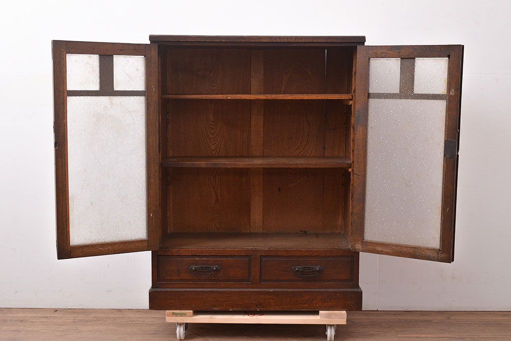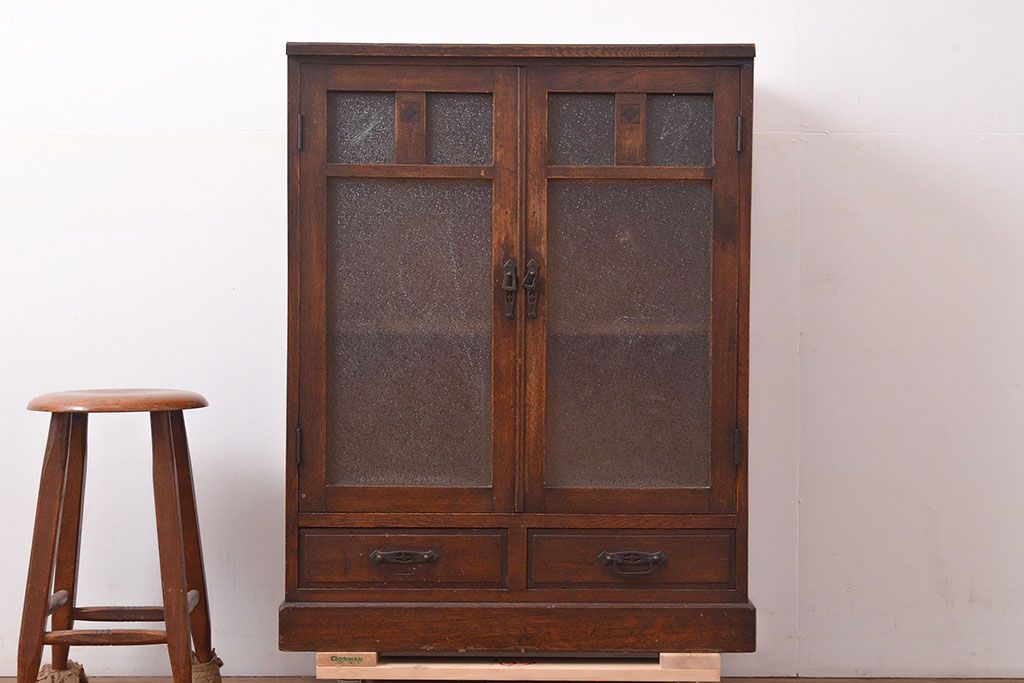 和製アンティーク ダイヤガラスがレトロな雰囲気を演出する栓材製ガラス戸棚(収納棚、キャビネット)(R-047390)