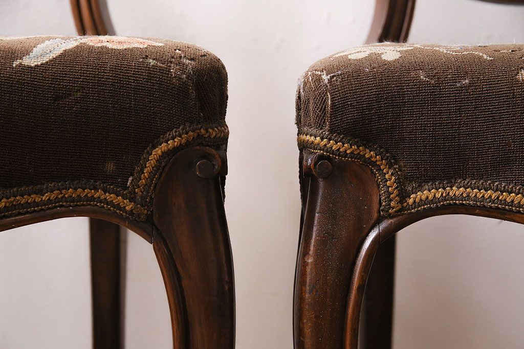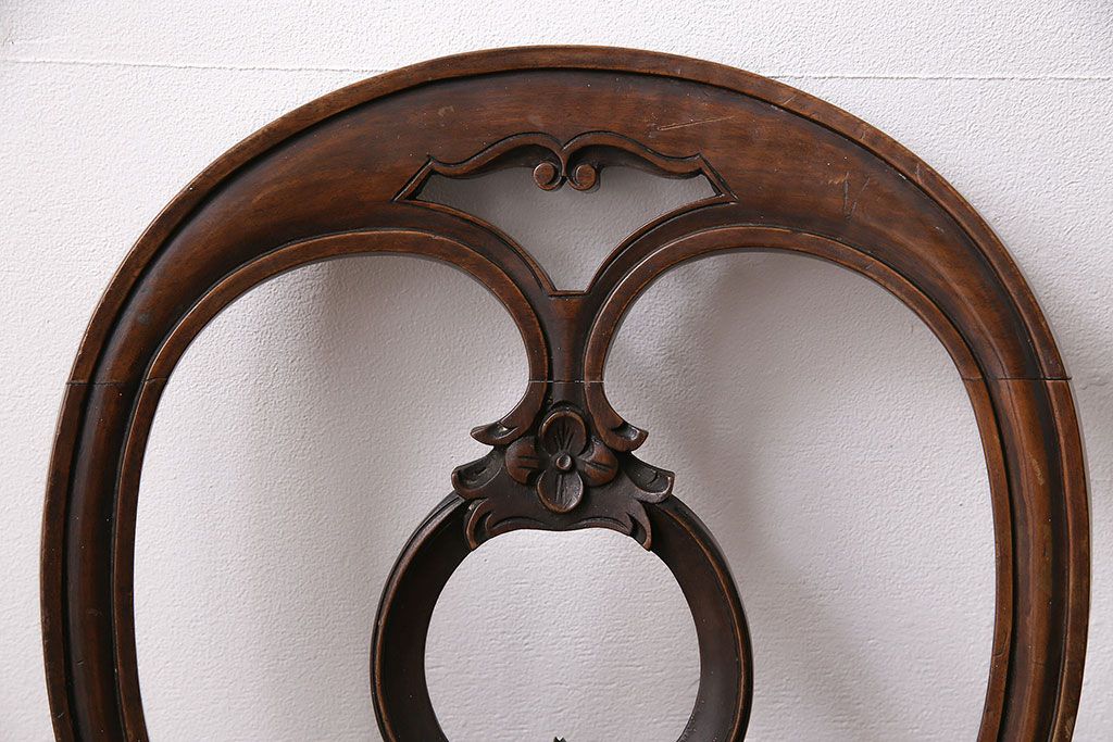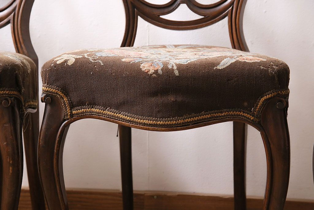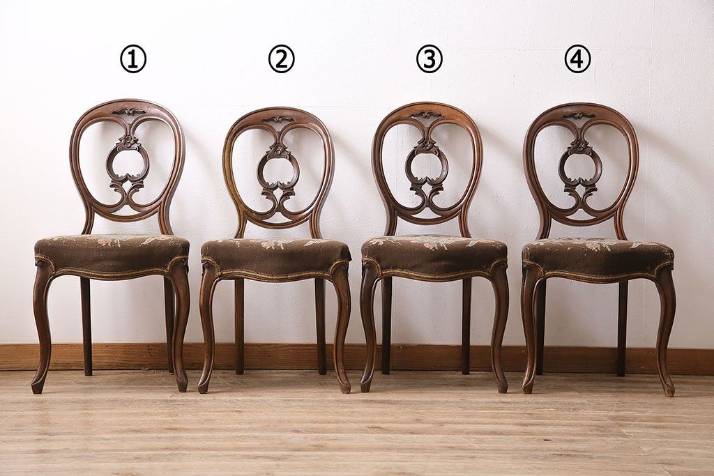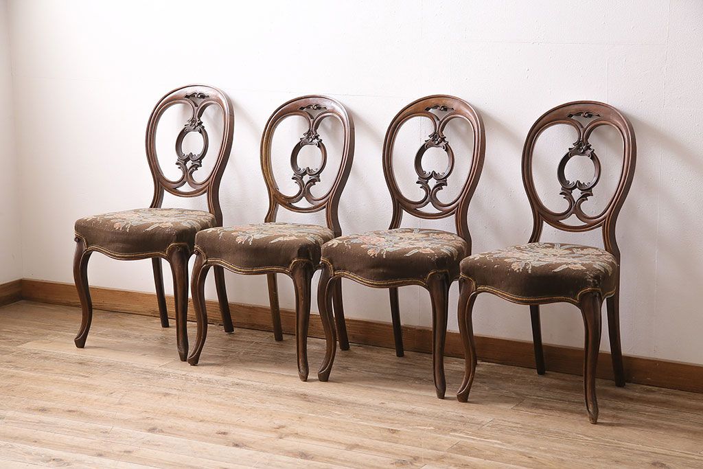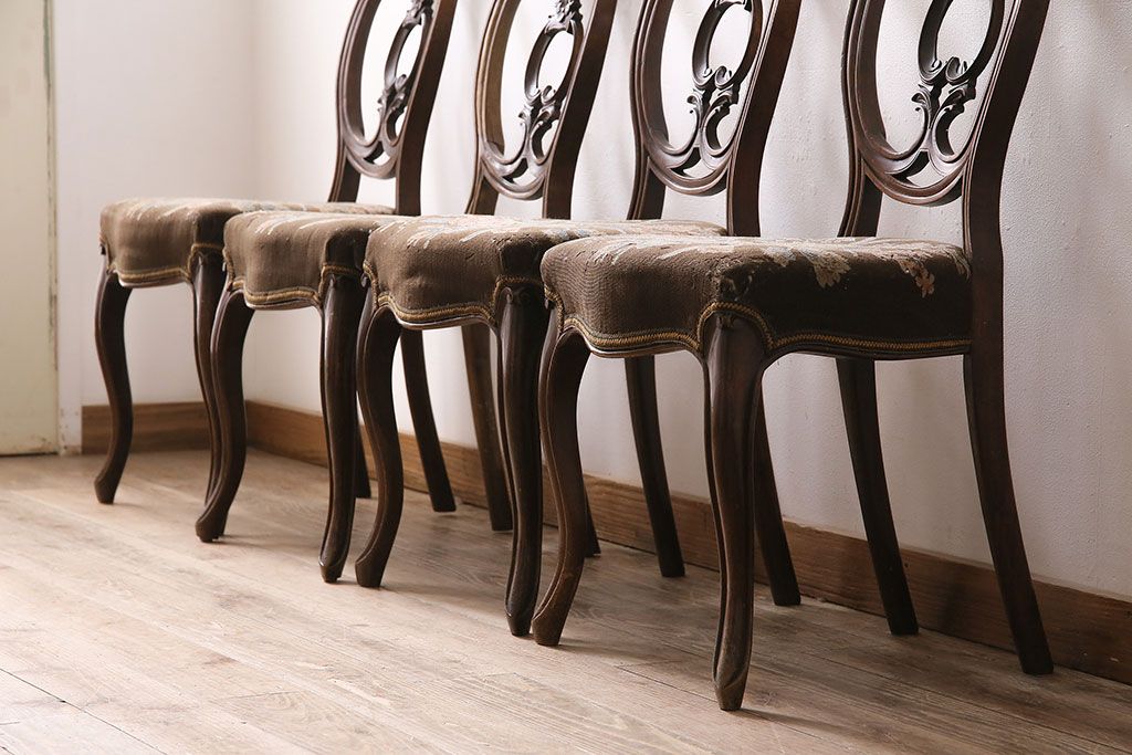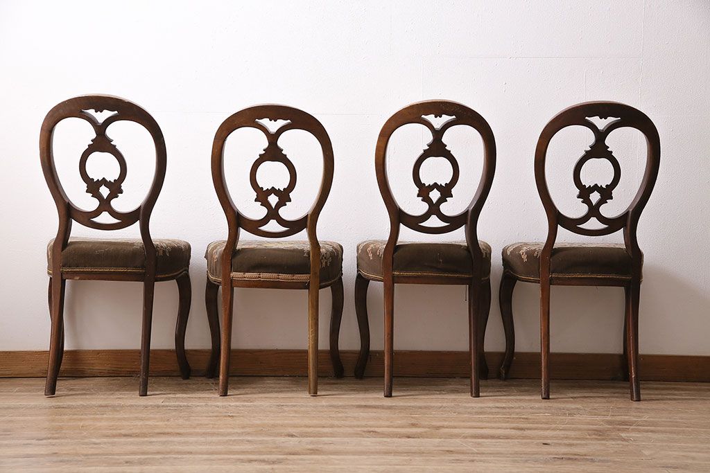 状態が気になる方には現状販売はおすすめできませんので、慎重なご検討をお願いいたします。フランスアンティーク マホガニー材 凝った彫りが優雅な雰囲気を醸し出すバルーンバックチェア4脚セット(ダイニングチェア、椅子)(R-047516)です。