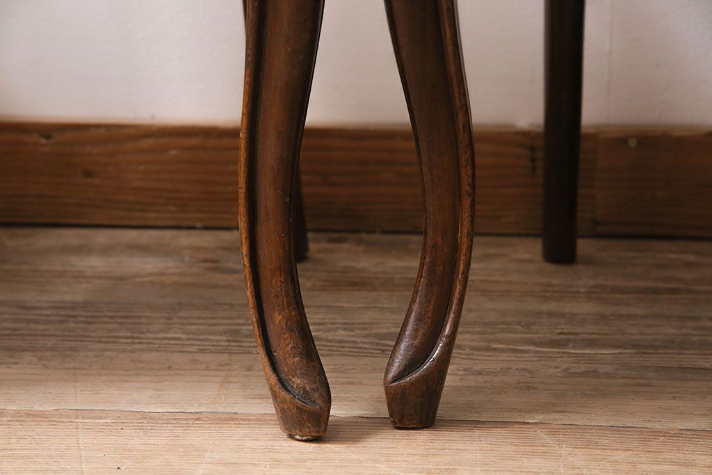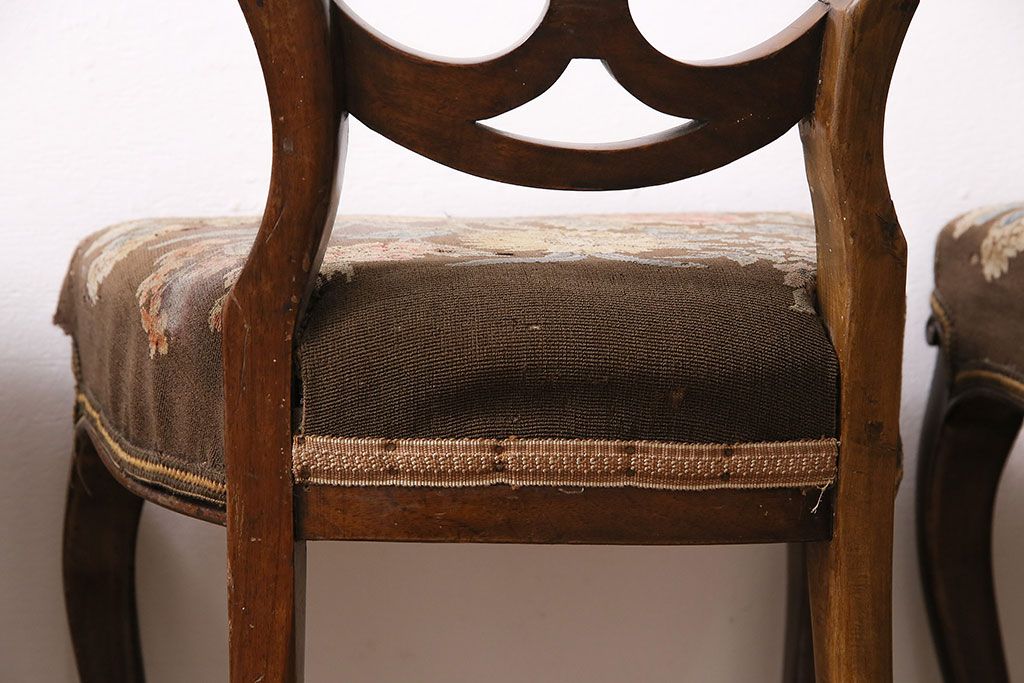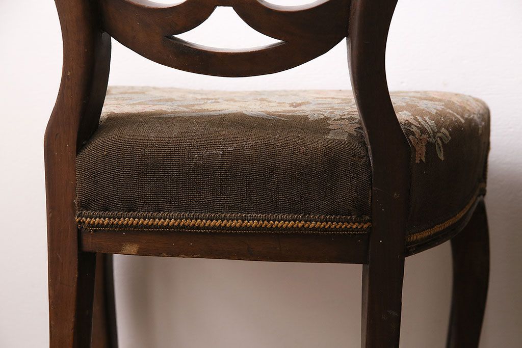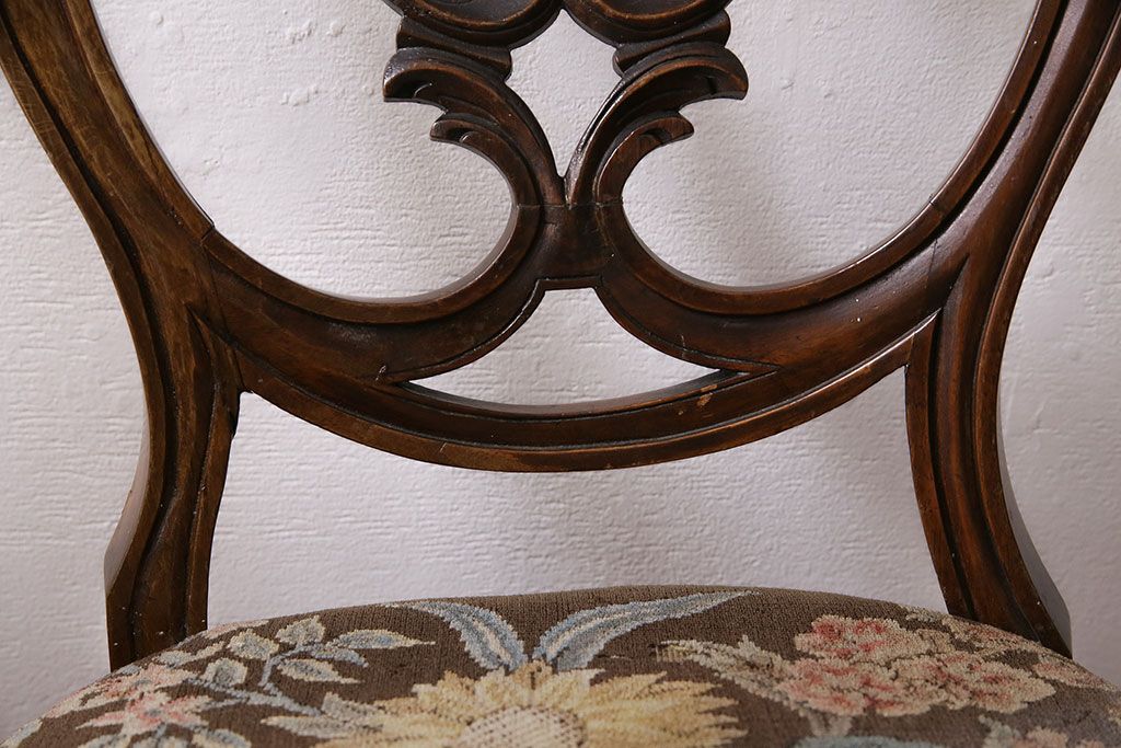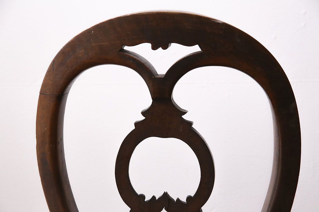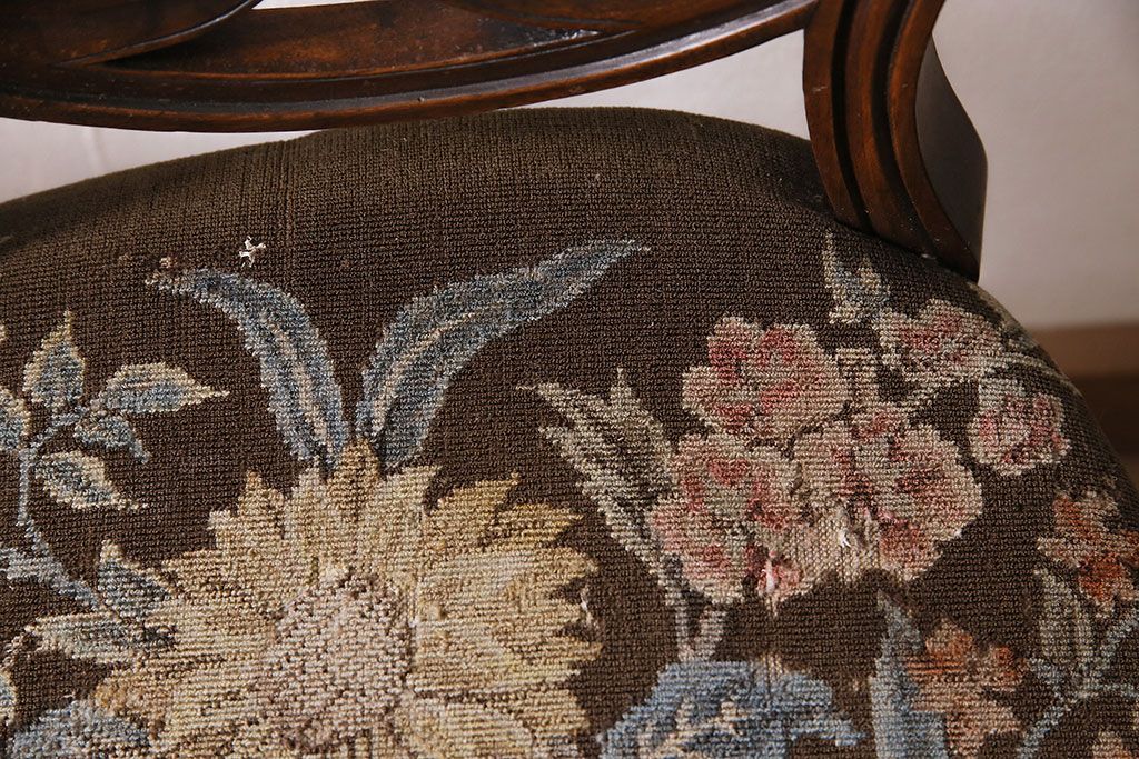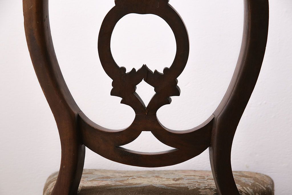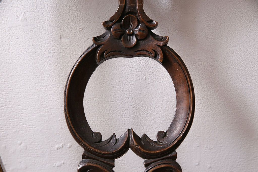 状態が気になる方には現状販売はおすすめできませんので、慎重なご検討をお願いいたします。フランスアンティーク マホガニー材 凝った彫りが優雅な雰囲気を醸し出すバルーンバックチェア4脚セット(ダイニングチェア、椅子)(R-047516)です。