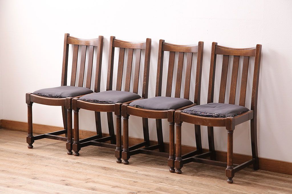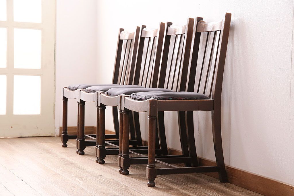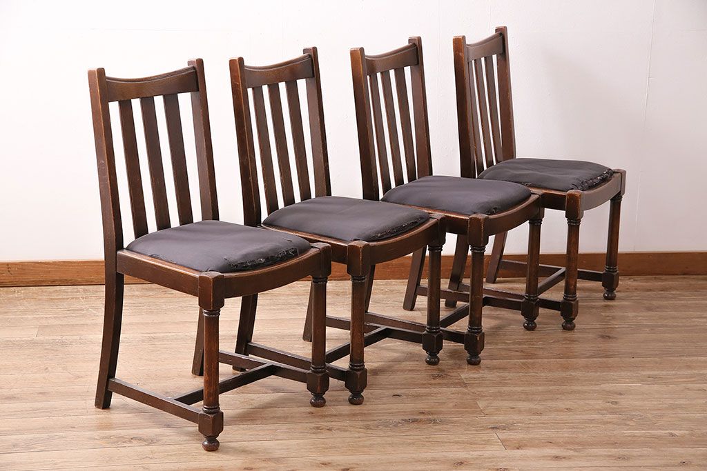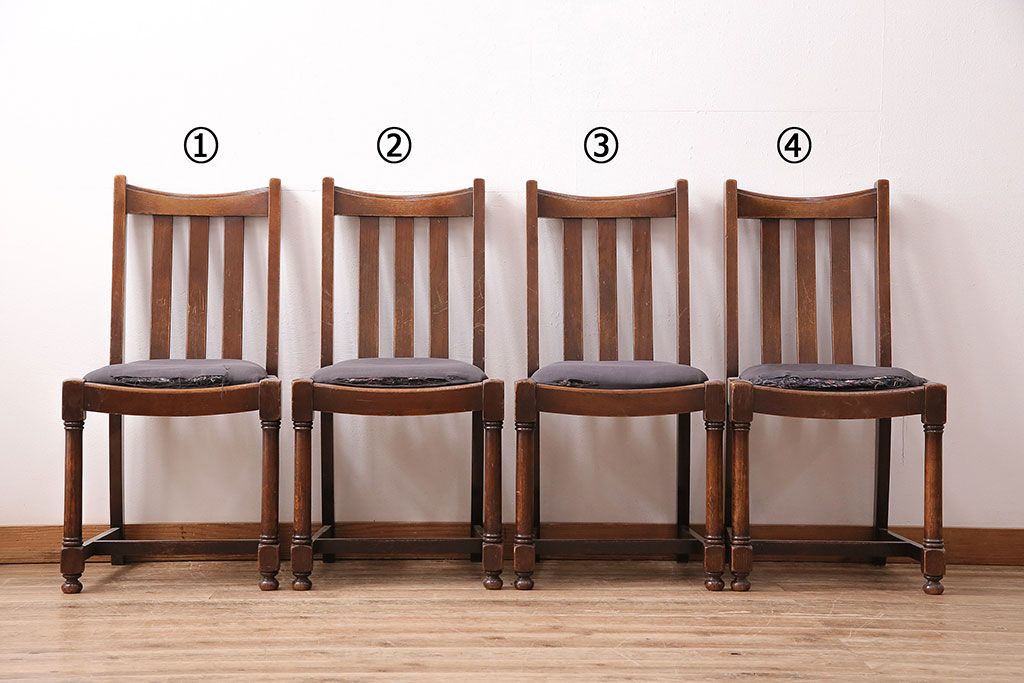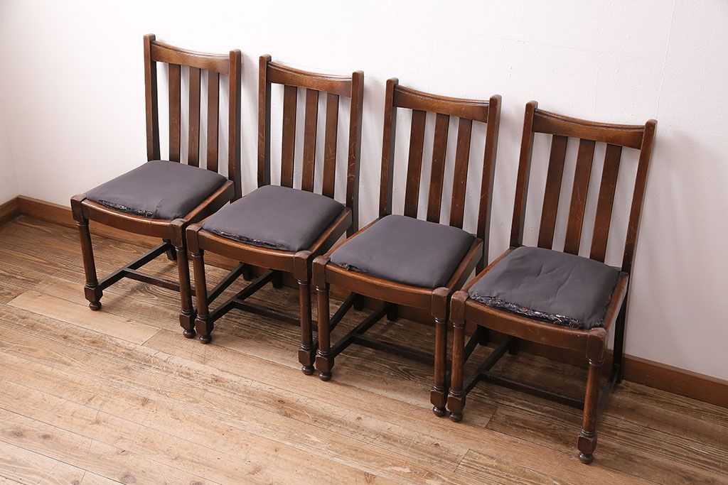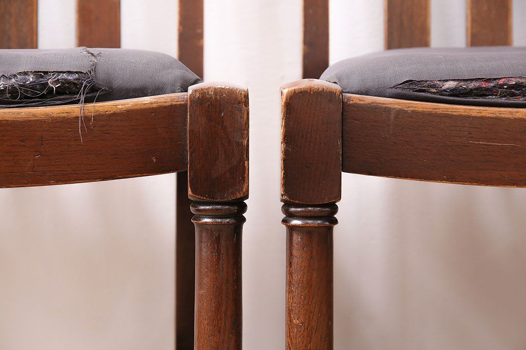 状態が気になる方には現状販売はおすすめできませんので、慎重なご検討をお願いいたします。イギリスアンティーク オーク材 落ち着いた雰囲気が魅力のシンプルなチェア4脚セット(ダイニングチェア、椅子)(R-047809)です。