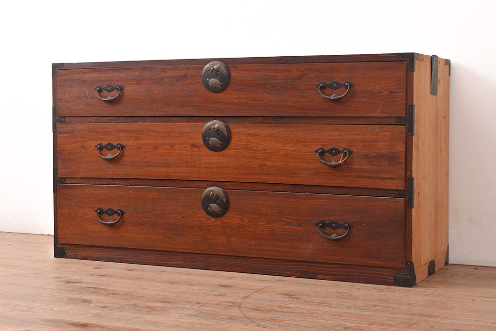 和箪笥> 衣装箪笥 > 和製アンティーク 前面ケヤキ材 鶴亀金具 時代の風情が漂う二本松箪笥のローボード(衣装箪笥、整理箪笥、引き出し、リビングボード)(R-047856)