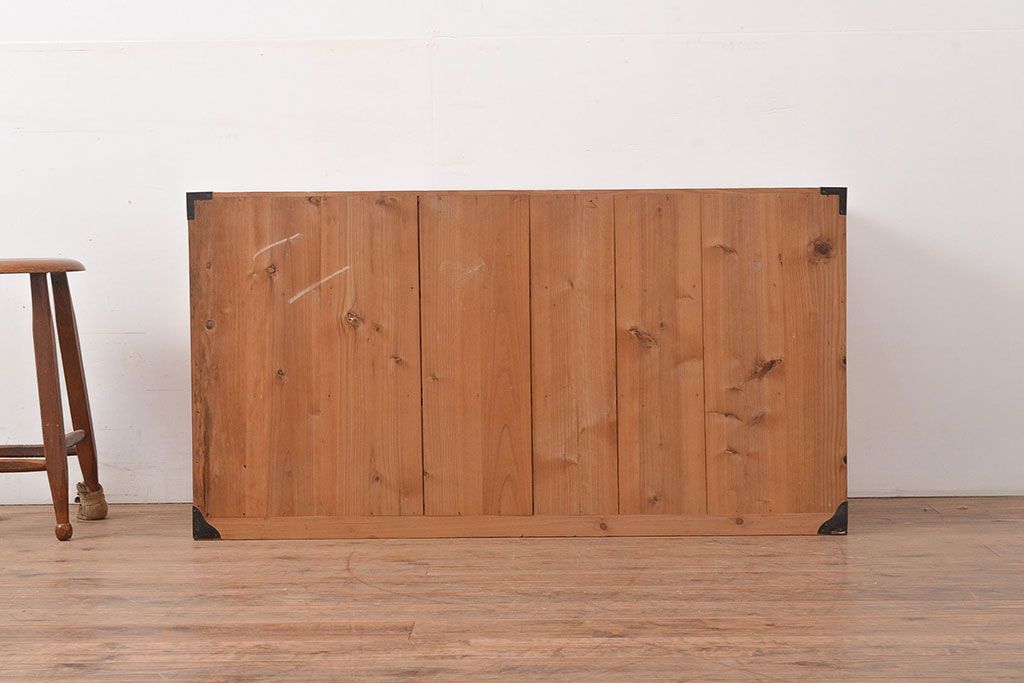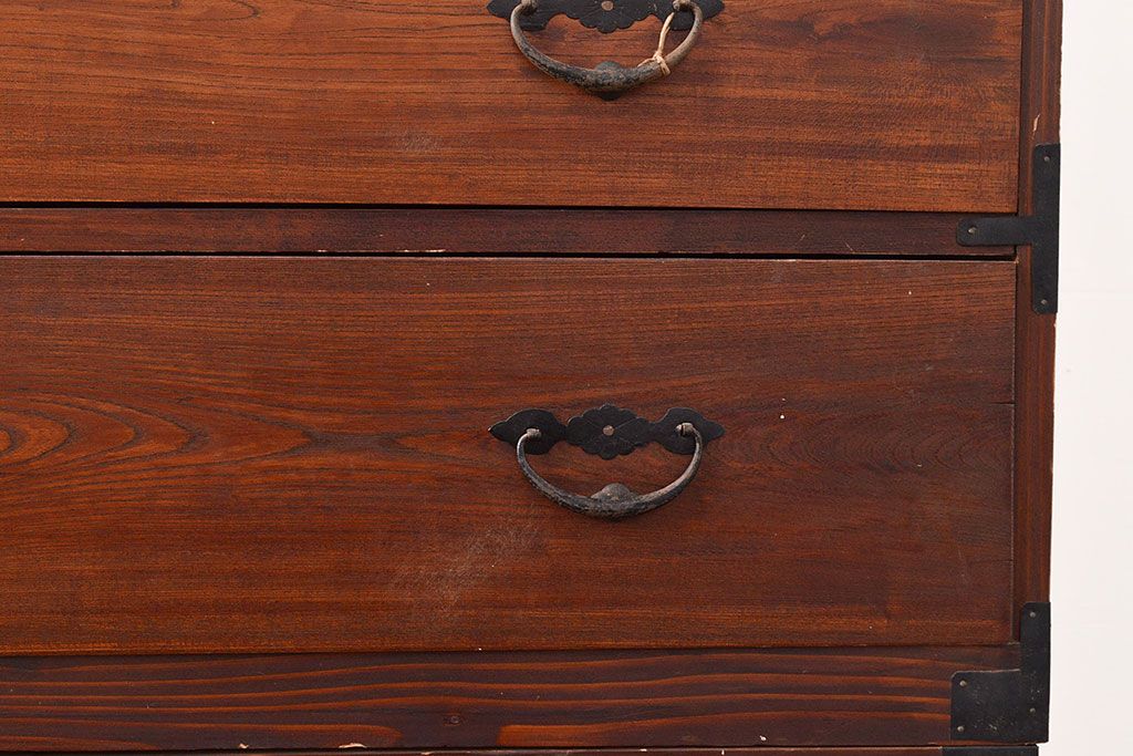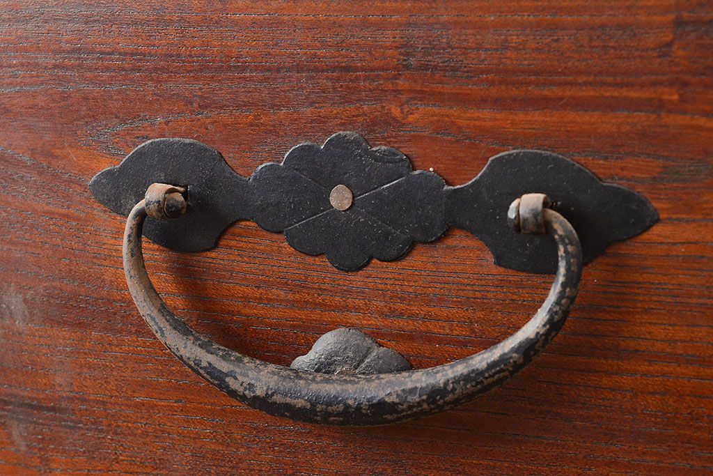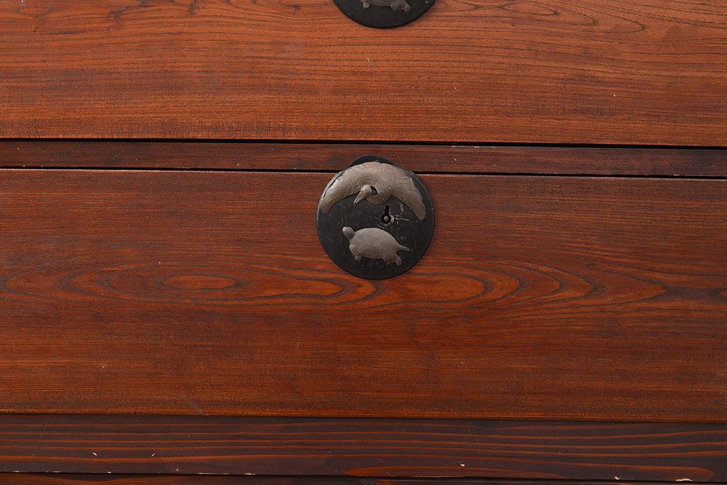 和箪笥 > 和製アンティーク 前面ケヤキ材 鶴亀金具 時代の風情が漂う二本松箪笥のローボード(衣装箪笥、整理箪笥、引き出し、リビングボード)(R-047856)