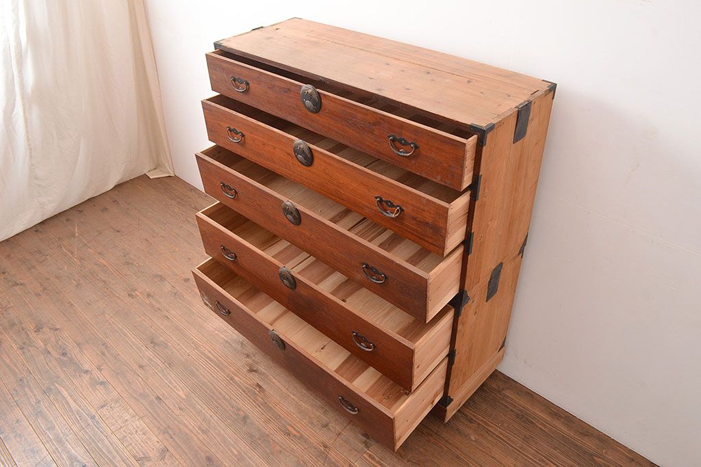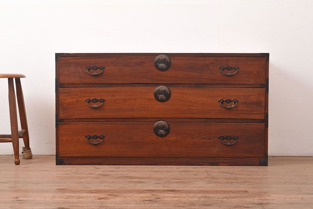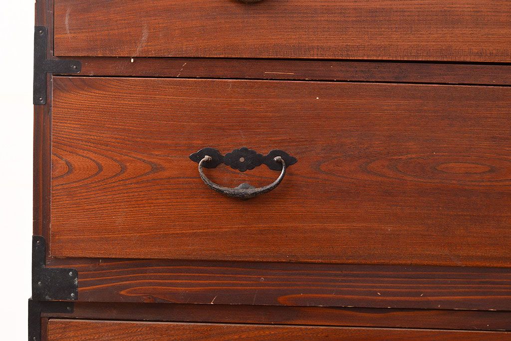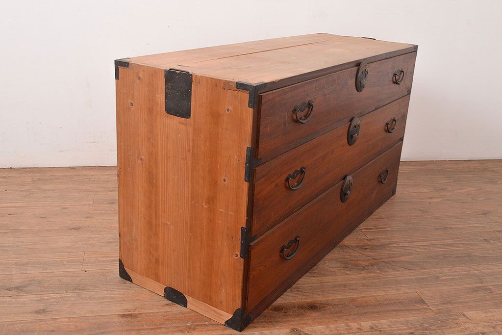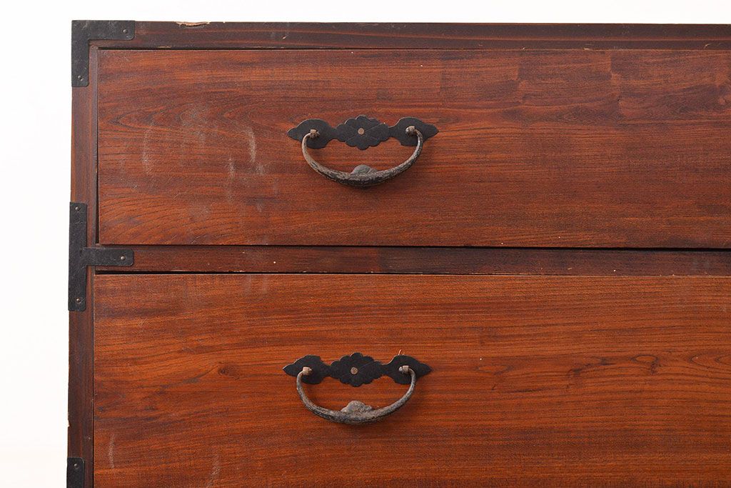 和箪笥 > 和製アンティーク 前面ケヤキ材 鶴亀金具 時代の風情が漂う二本松箪笥のローボード(衣装箪笥、整理箪笥、引き出し、リビングボード)(R-047856)