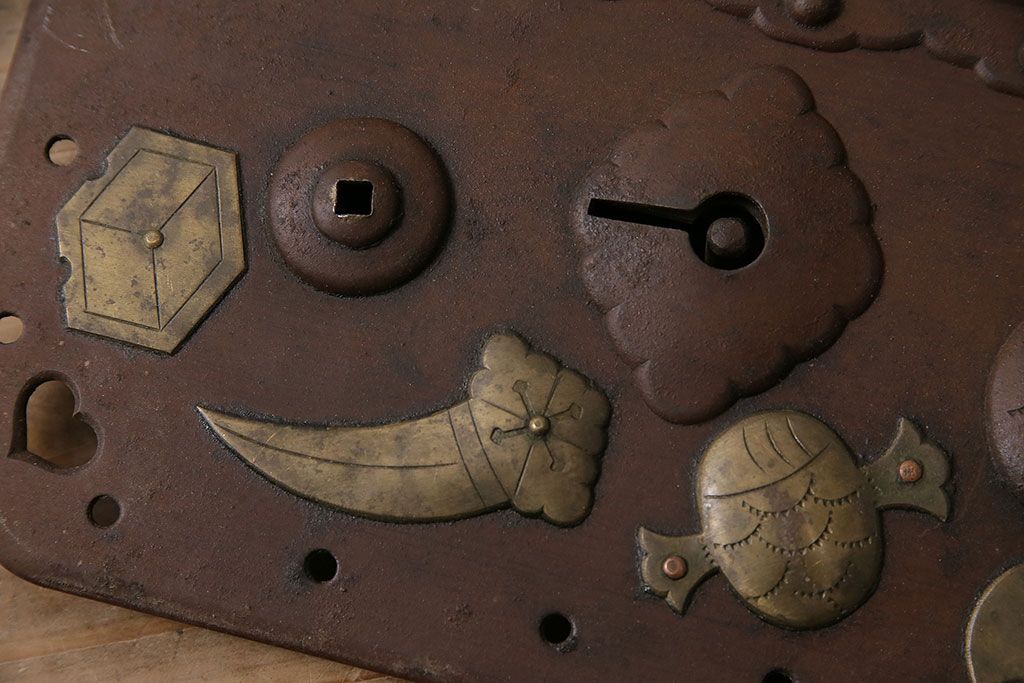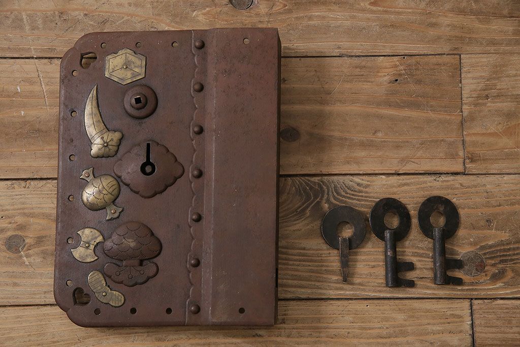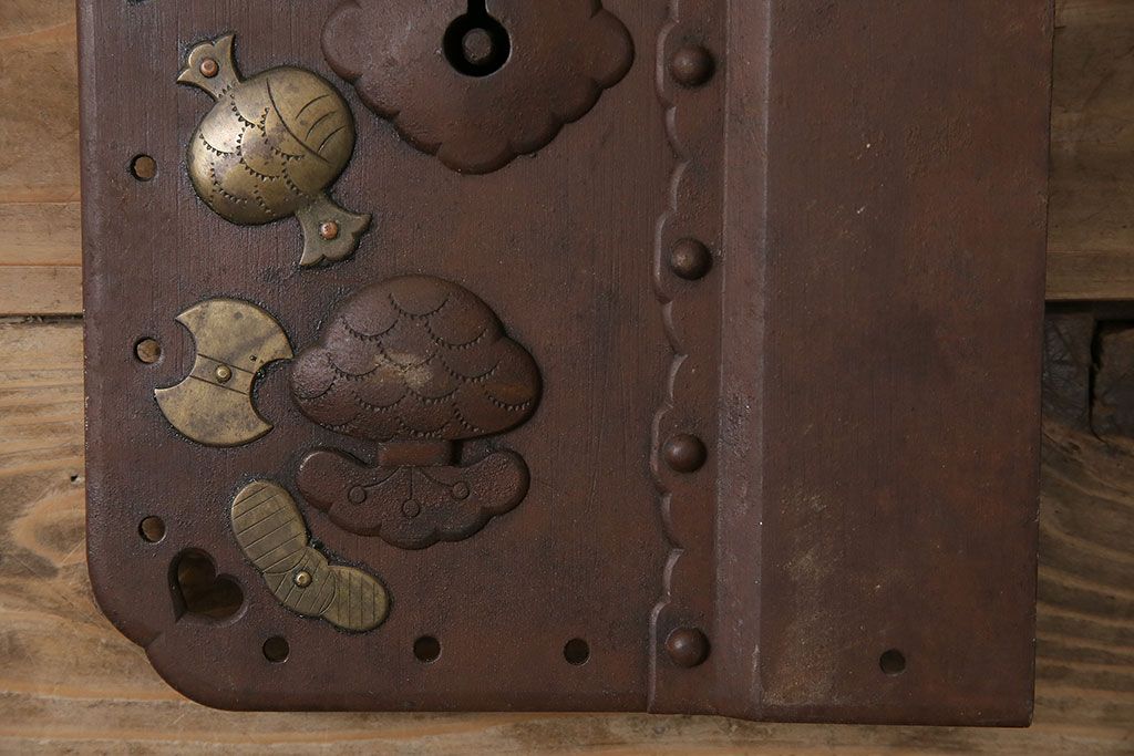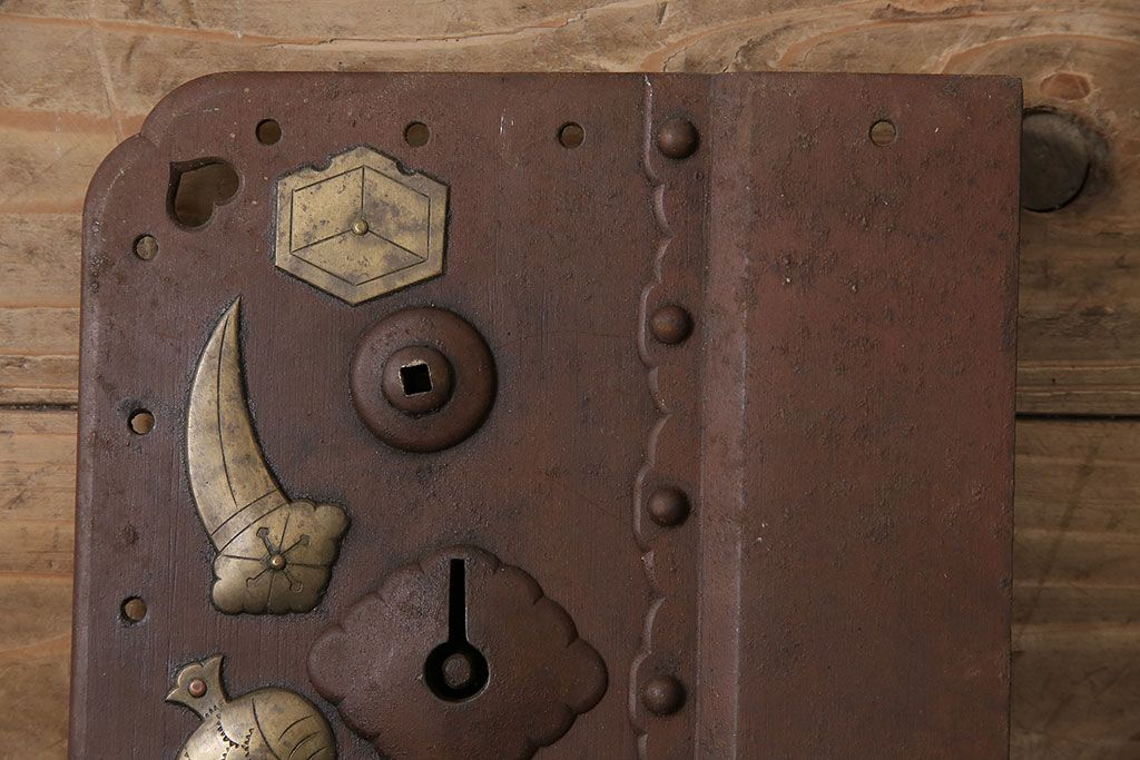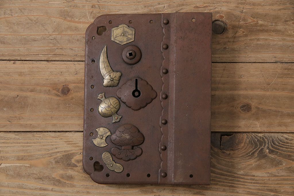 アンティーク雑貨 鉄・真鍮製 縁起物の意匠がぱっと目を引く蔵戸の錠前金具(ディスプレイ雑貨、蔵戸パーツ)(R-047491)