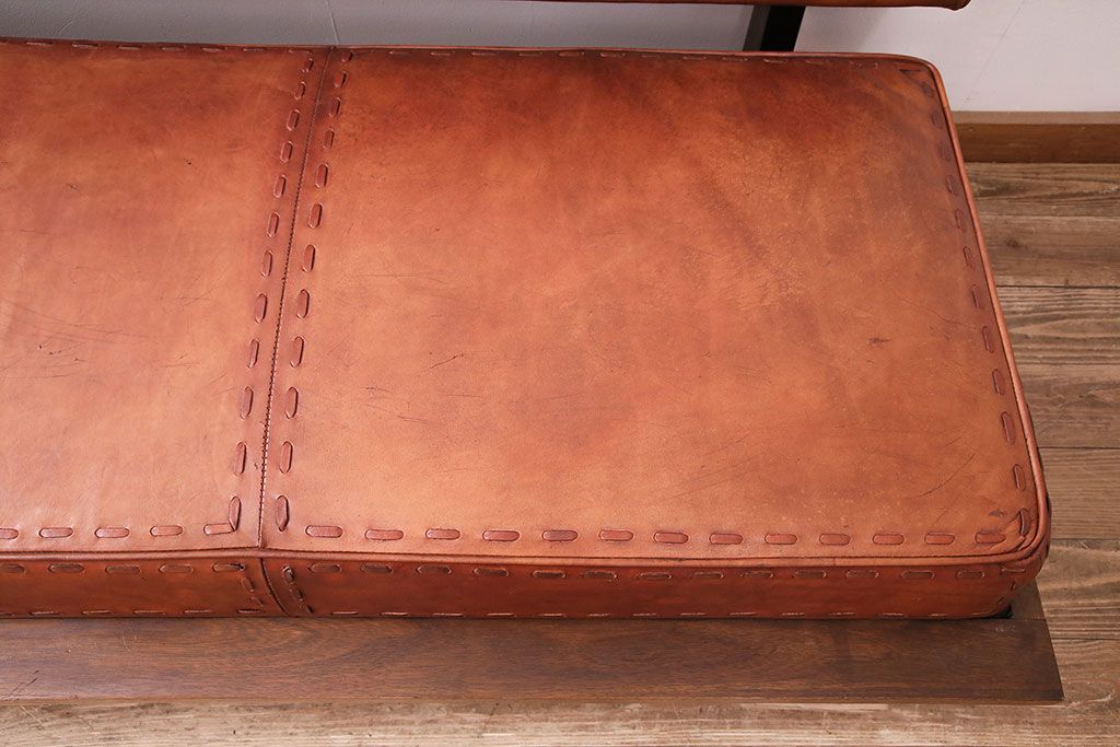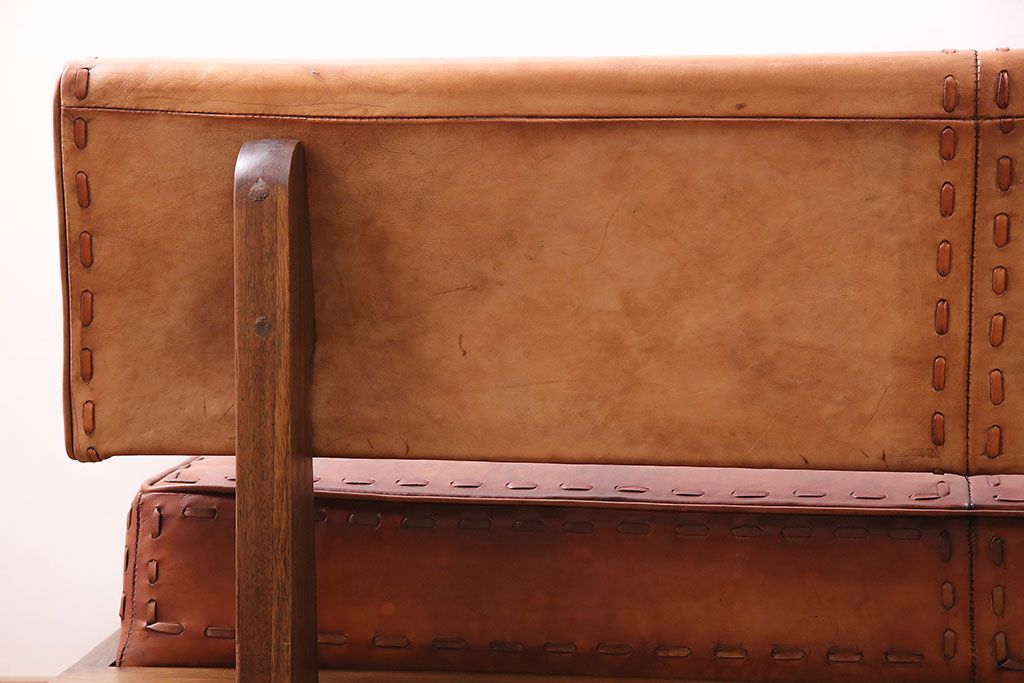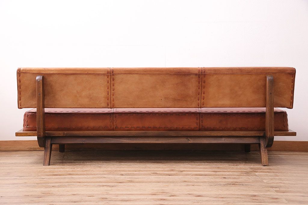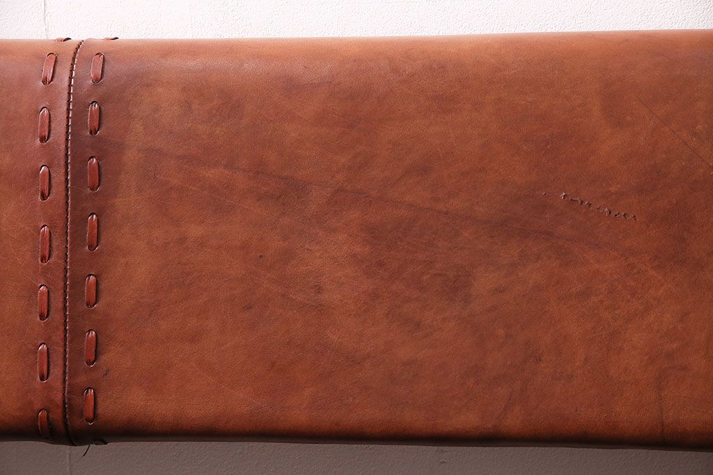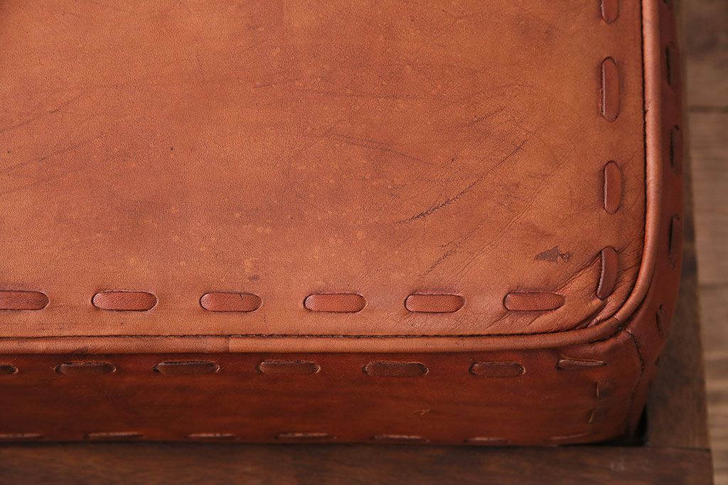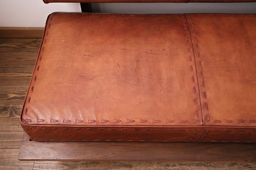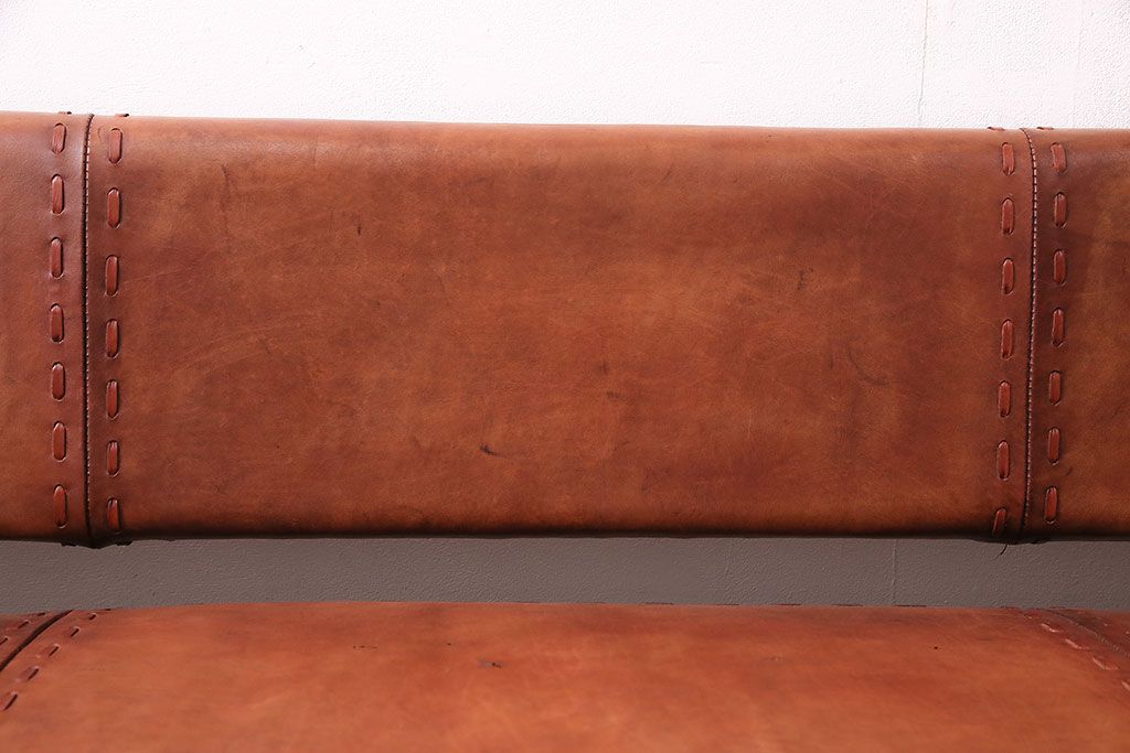 中古 海外 輸入家具 ステッチがお洒落な本革の3人掛けソファ(三人掛けソファ、トリプルソファ)(R-047883)です。 本革特有のしっとりとした質感が魅力の 3人掛けソファです。 革と木のフレームの組み合わせが あたたかな雰囲気を醸し出しています。 明るいオレンジがかったブラウンのお色は、 これからご使用していただく中で さらに味わいが増し、 いつまでも変化をお楽しみいただけますよ。 随所に施されたステッチは アクセントになってお洒落ですね。 ヴィンテージスタイルやレトロテイストの 空間づくりにいかがでしょうか。  【椅子の座り心地について】(身長161cmの女性スタッフの場合) クッションの硬さ:硬い 座面の高さ:丁度いい 背もたれの位置:腰と肩甲骨の中間 座面までの高さは座っていない状態の一番高い部分を測定しています。 多少の使用感はありますが、目立つ傷・ダメージはなく、状態良好です。 使用上問題のあるダメージはありません。 ■座面までの高さ 380mm ■重量 約34kg