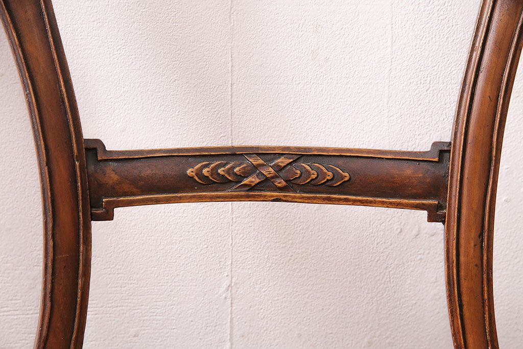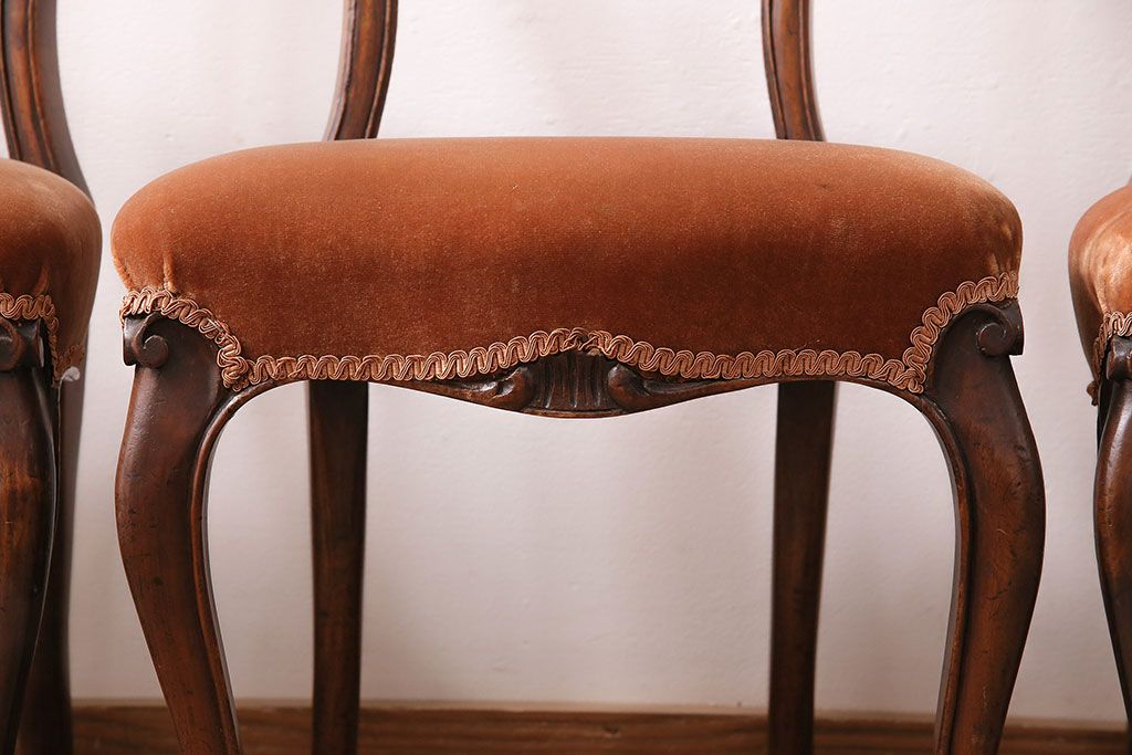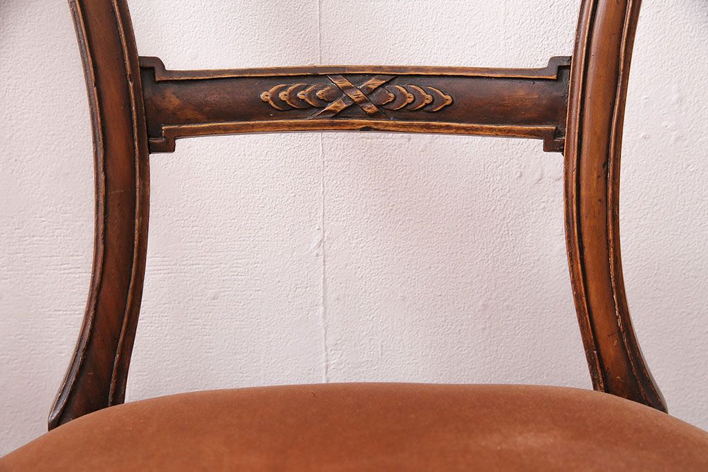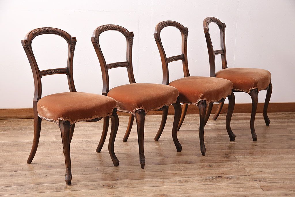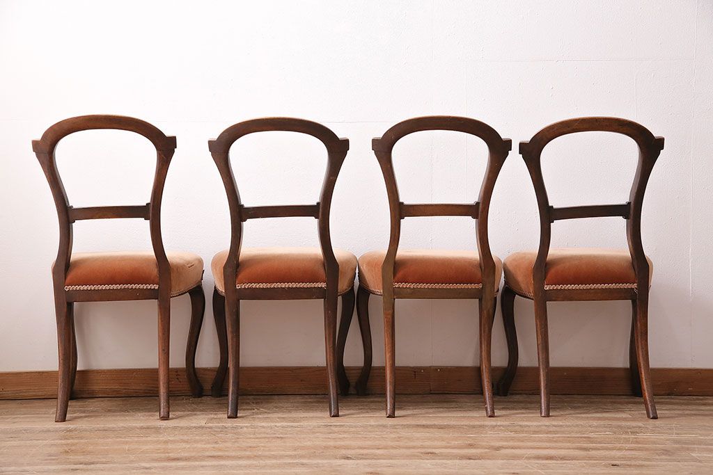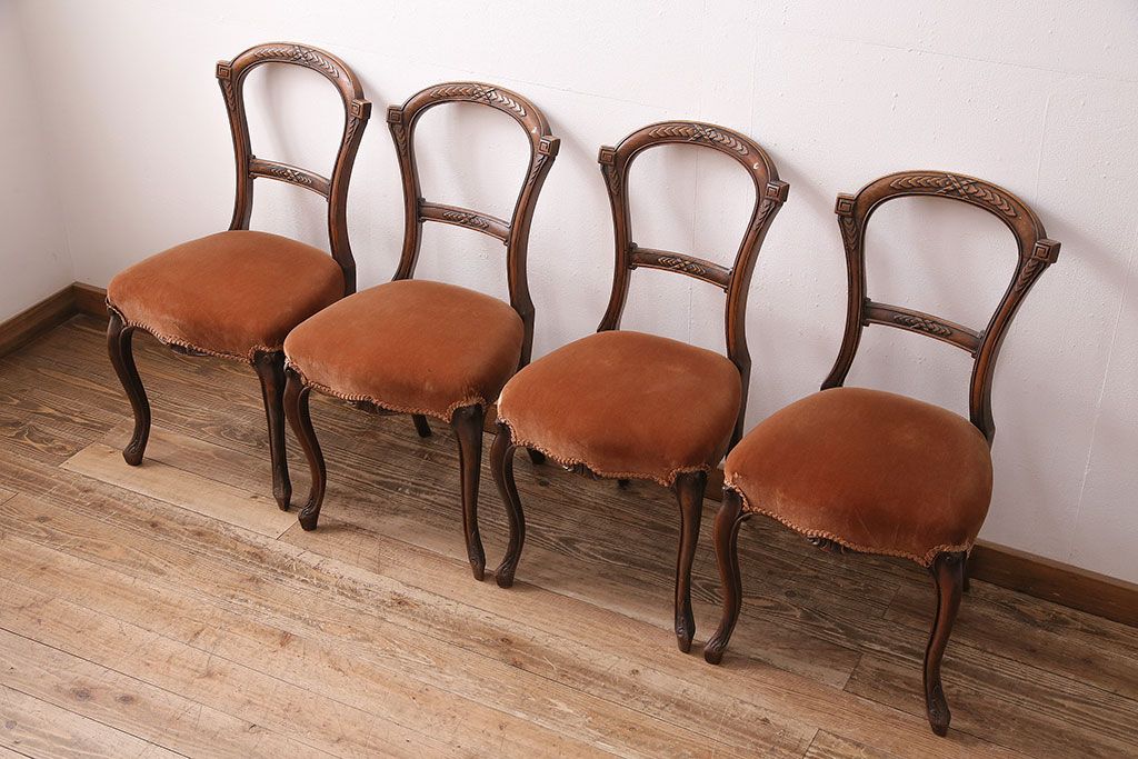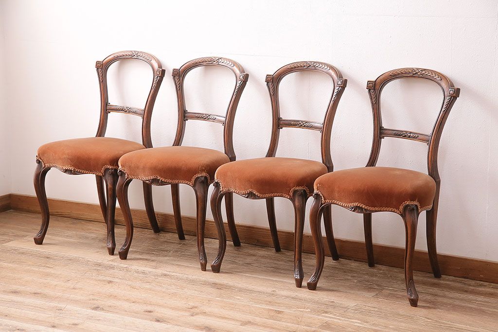 状態が気になる方には現状販売はおすすめできませんので、慎重なご検討をお願いいたします。イギリスアンティーク 彫りがアクセントになったマホガニー材製のバルーンバックチェア4脚セット(ダイニングチェア、椅子)(R-047833)です。
