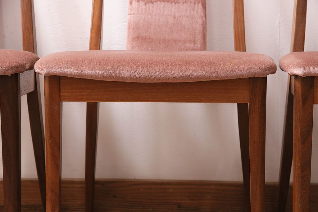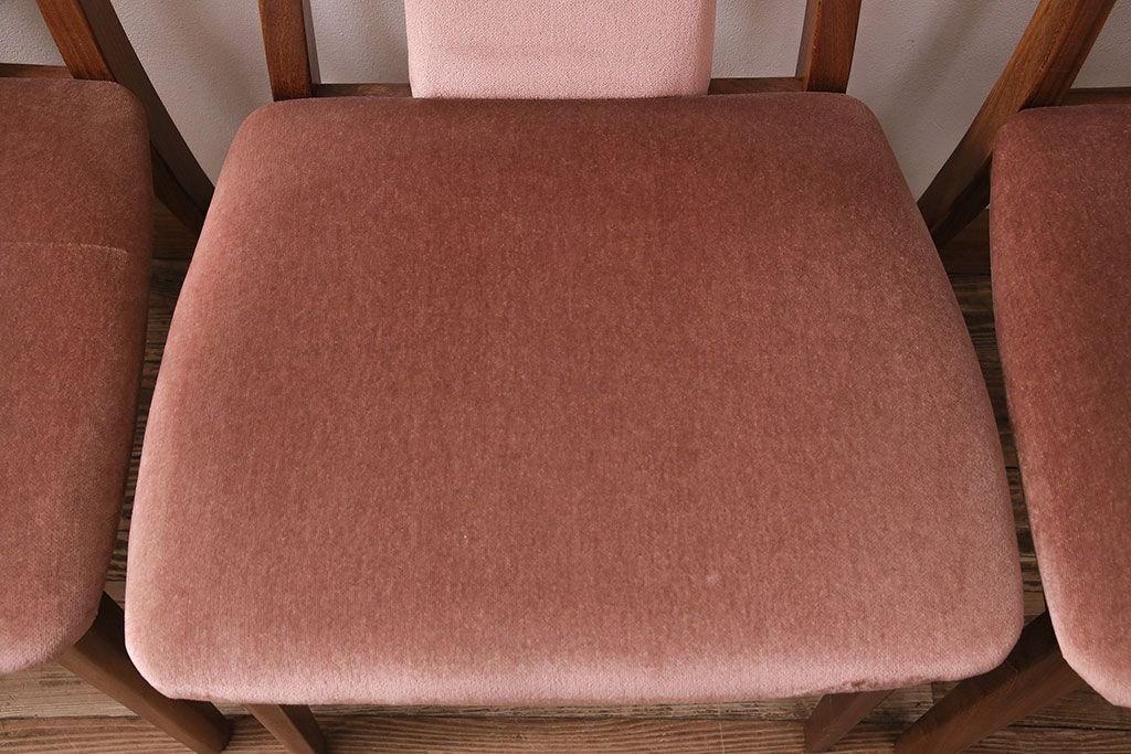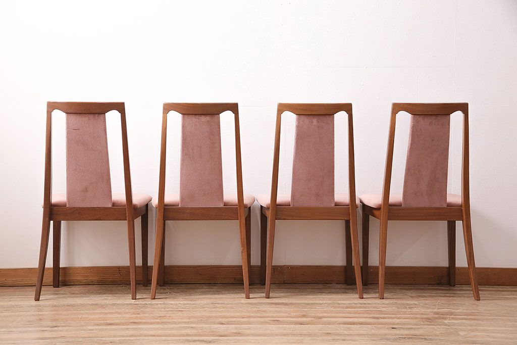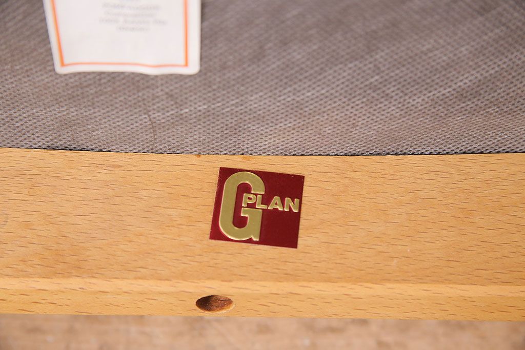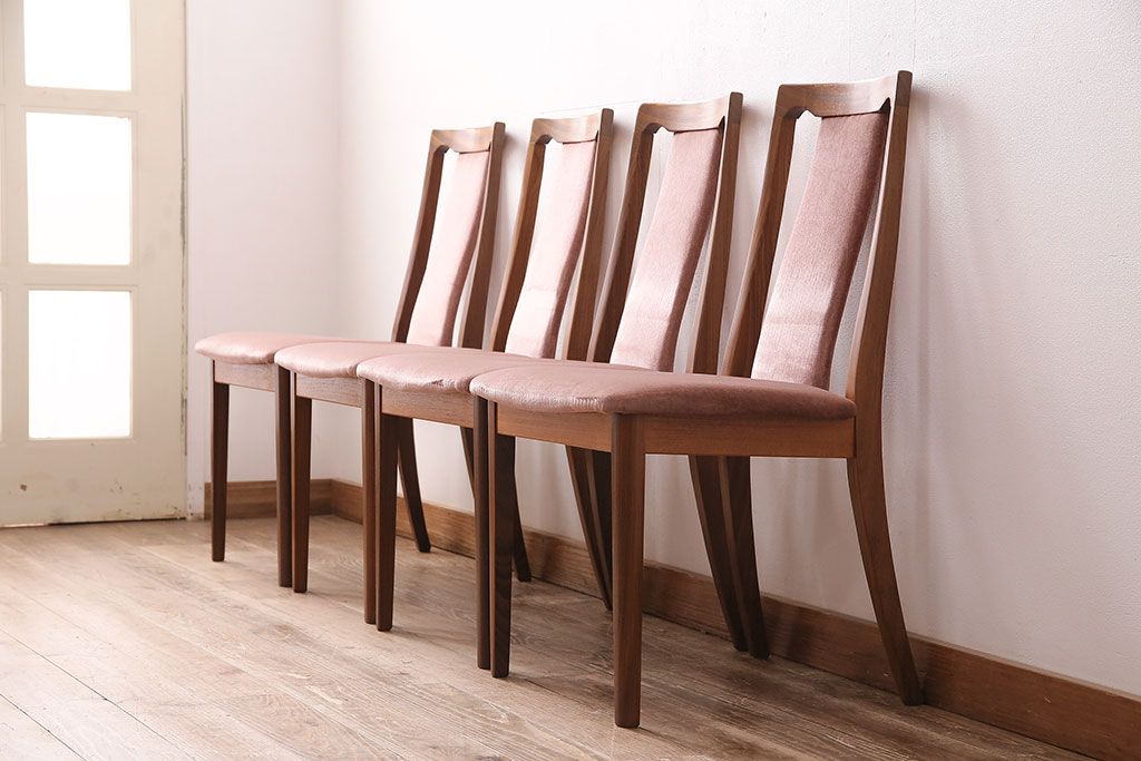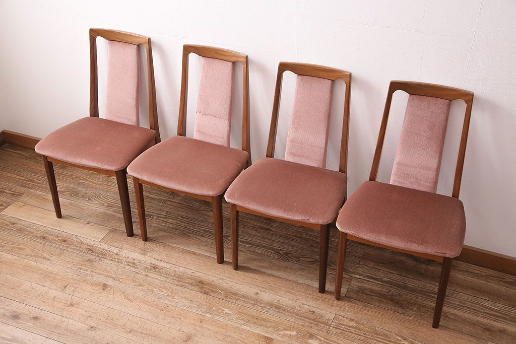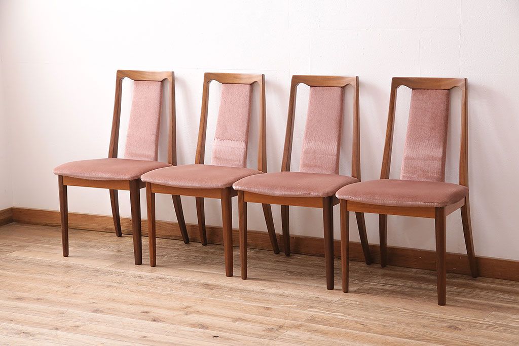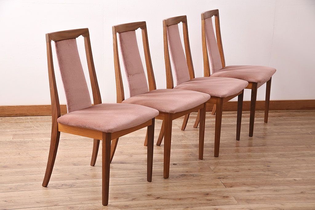 状態が気になる方には現状販売はおすすめできませんので、慎重なご検討をお願いいたします。イギリスビンテージ 人気のG-PLAN!背もたれにもファブリックが使われている、珍しいデザインのチェア4脚セット(ダイニングチェア、椅子)(R-047835)です。