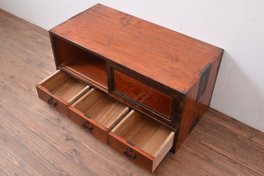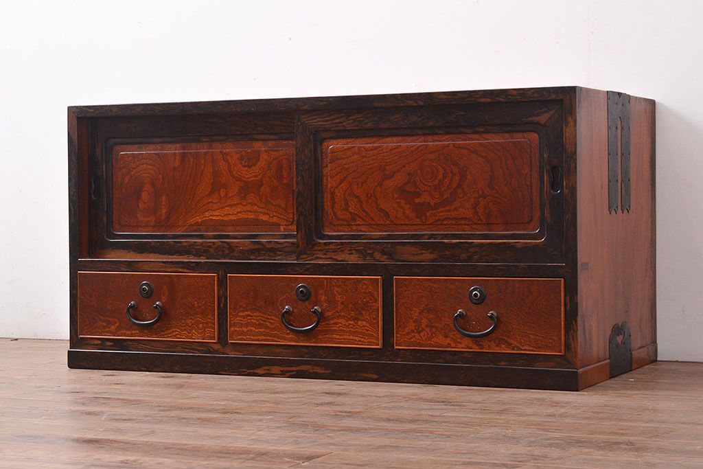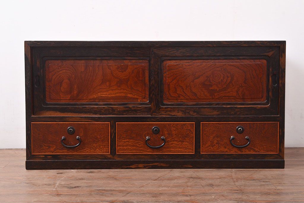 アンティーク 極美品 前面(黒柿孔雀杢・ケヤキ玉杢) 中(桐) 天板・側面(楠木) 漆塗り 群馬県の織物問屋から出てきました!!最高級のローボード(収納棚、テレビ台、テレビボード)(R-047347)です。