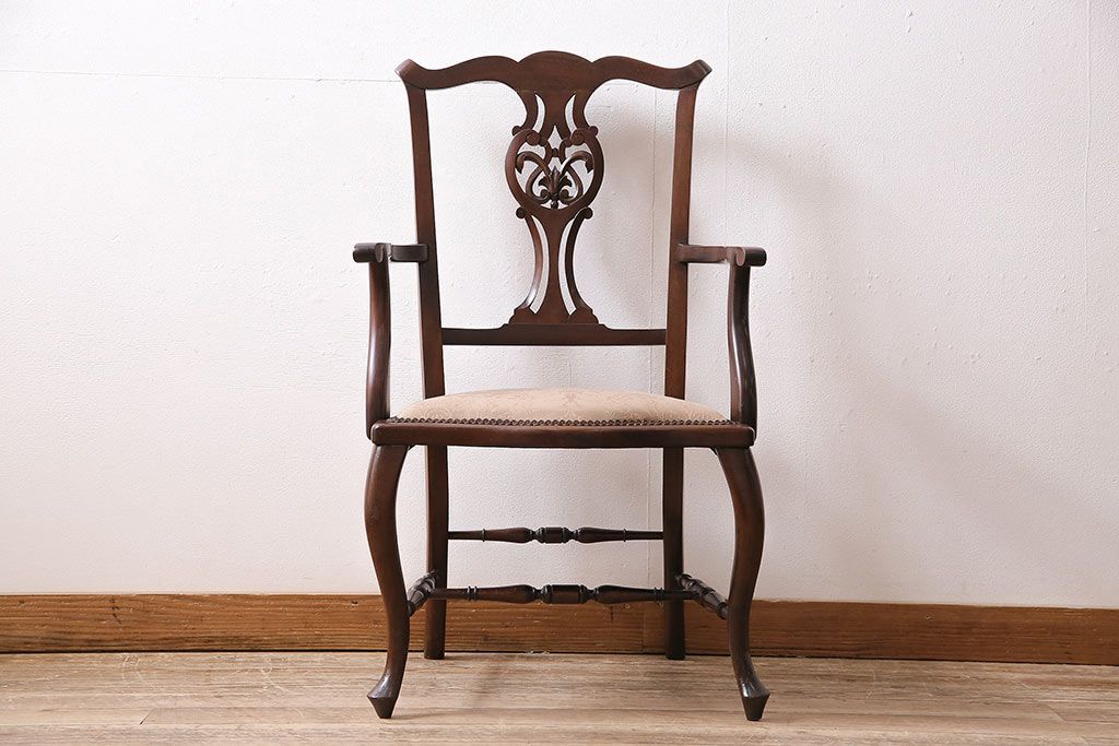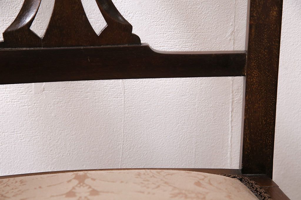 椅子・ベンチ> サロンチェア > フランスアンティーク マホガニー材 高級品!華奢なシルエットと背もたれの意匠が美しいチェア(サロンチェア、アームチェア、椅子)(R-047110)