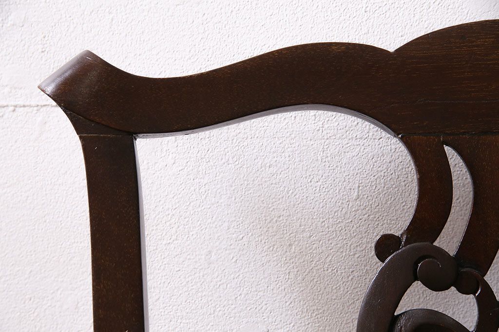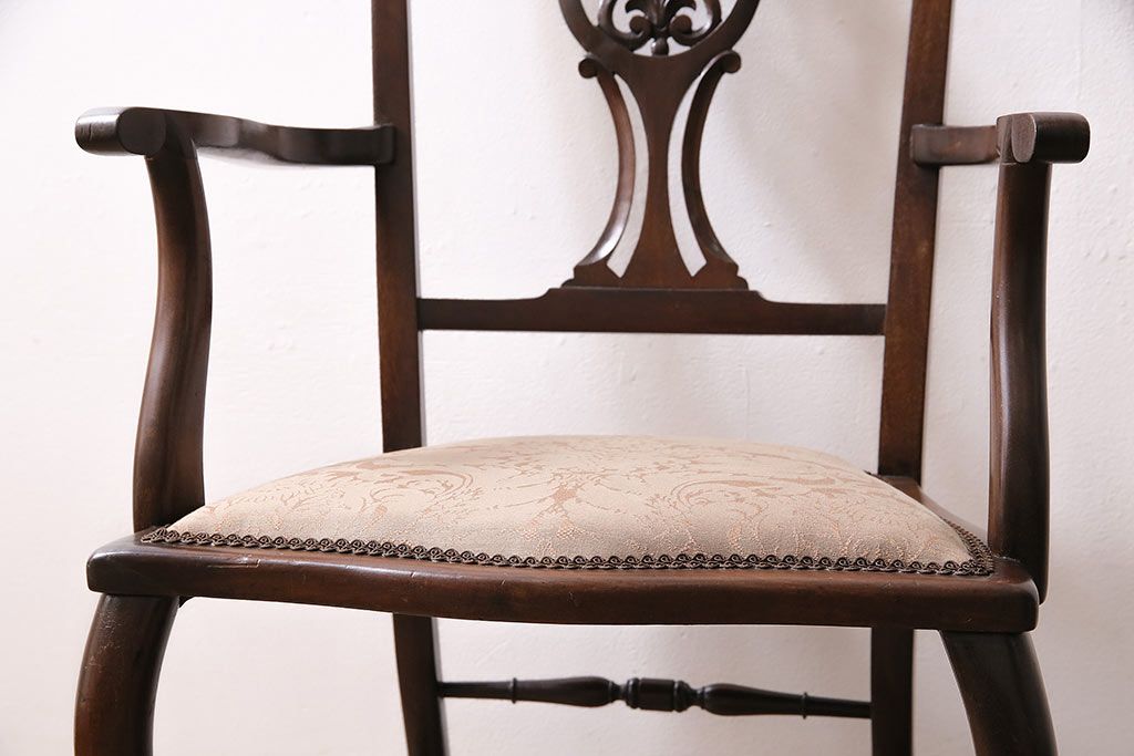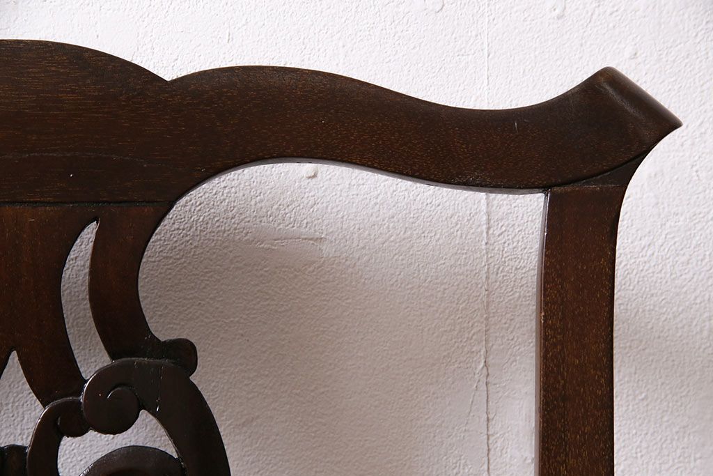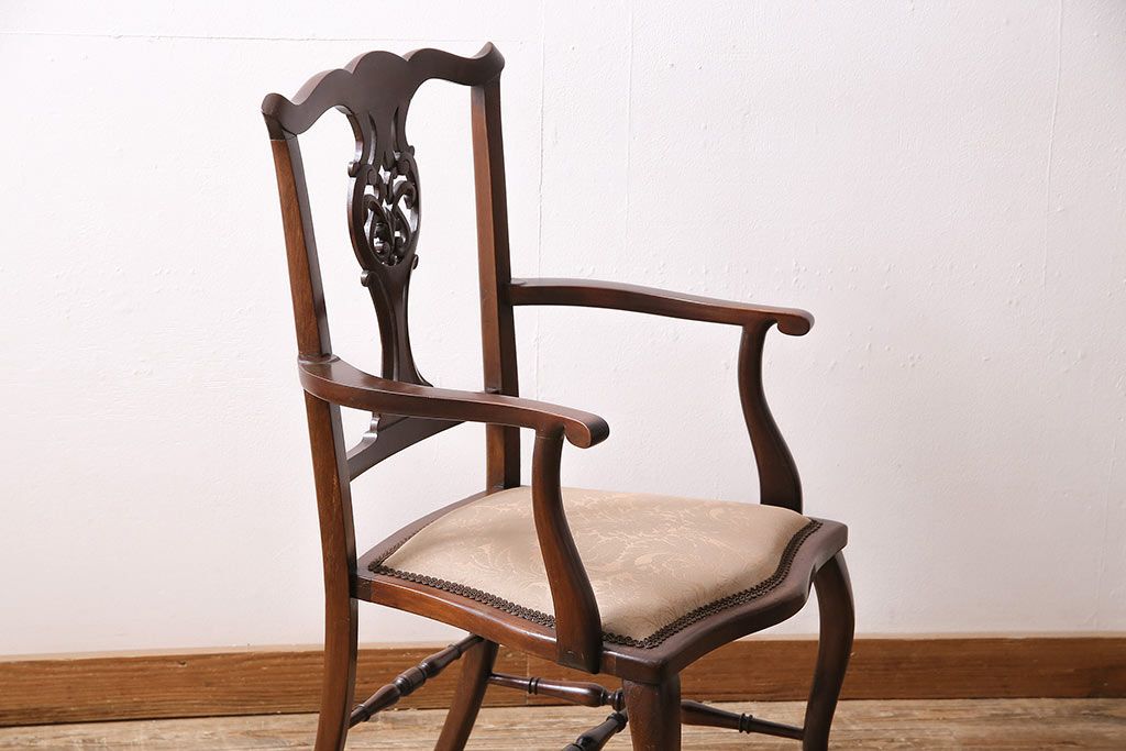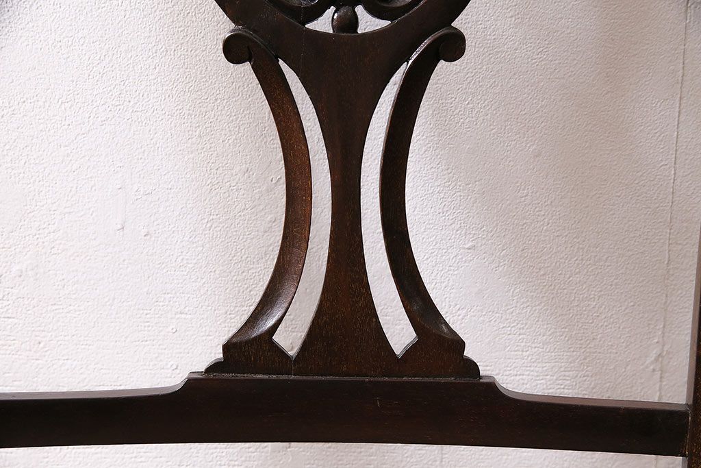 椅子・ベンチ> ダイニングチェア > フランスアンティーク マホガニー材 高級品!華奢なシルエットと背もたれの意匠が美しいチェア(サロンチェア、アームチェア、椅子)(R-047110)