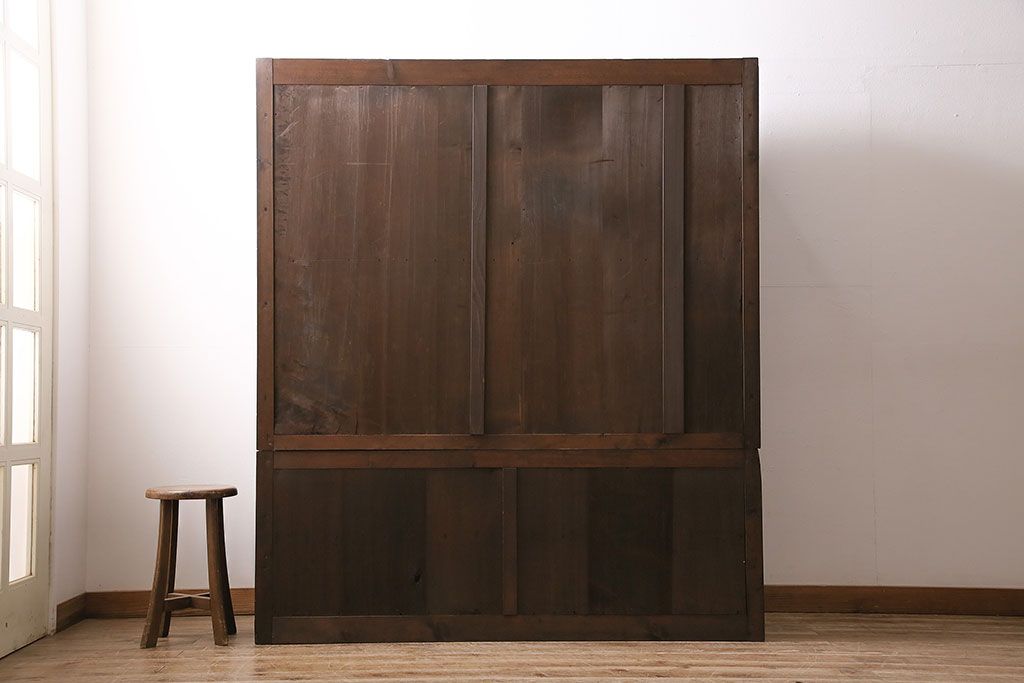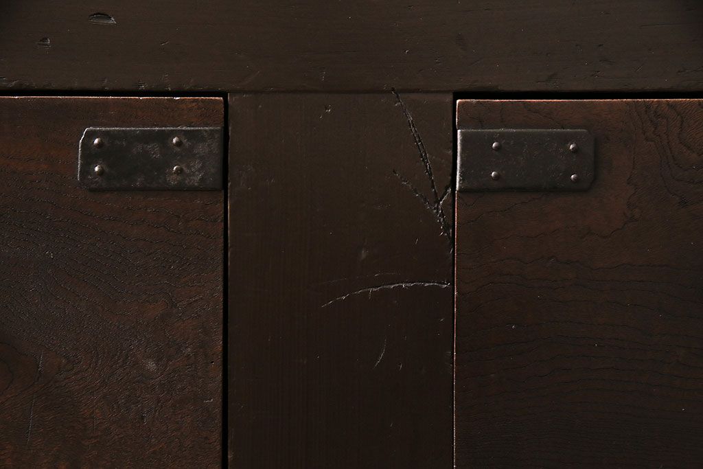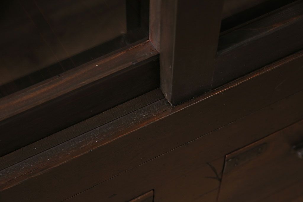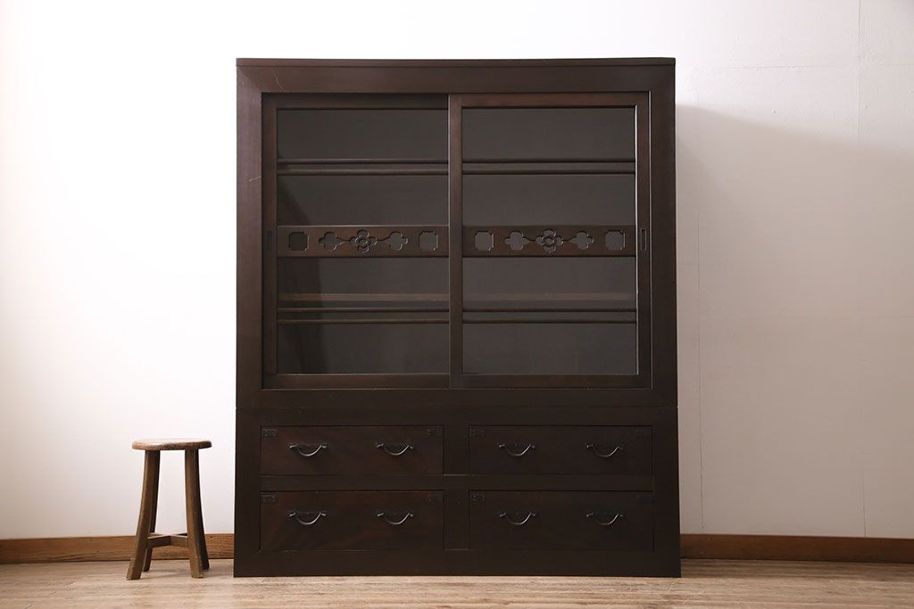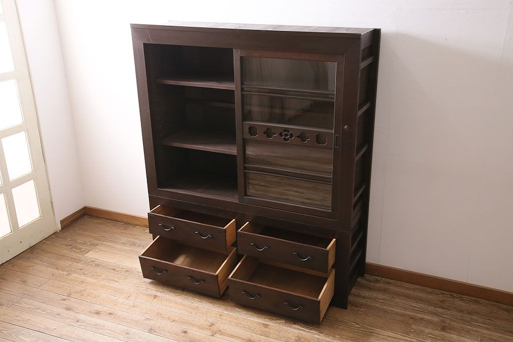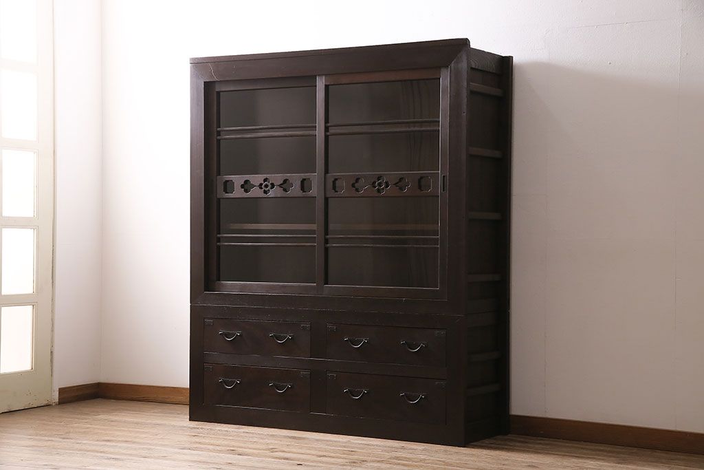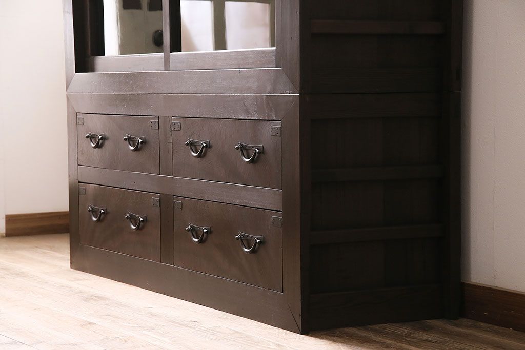 キャビネット・戸棚> 食器棚・カップボード > 五尺収納箪笥キャビネットをリペア&カスタム!戸板をゆらゆらガラスへ変更。引き手を取り付け。可動式の棚板を設置。濃い茶色で着色し仕上げ。(水屋箪笥、収納棚、戸棚、キャビネット)