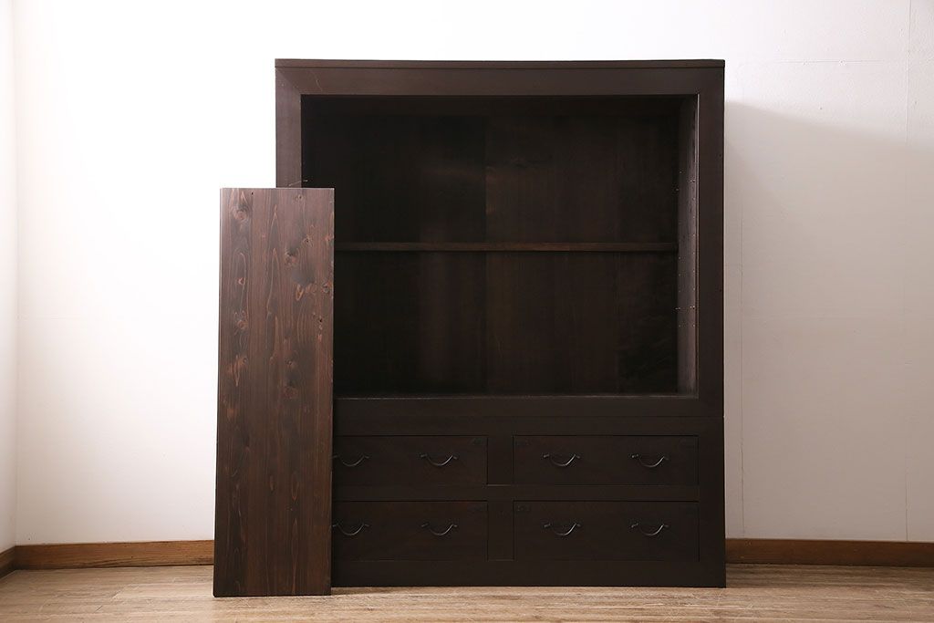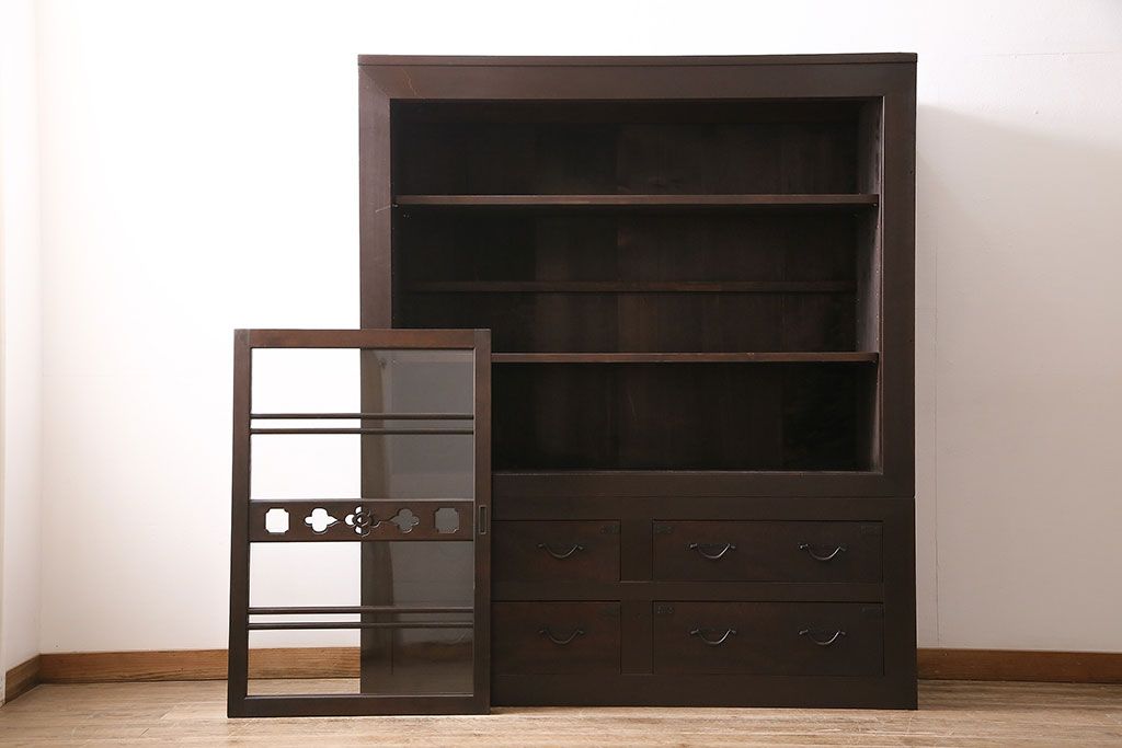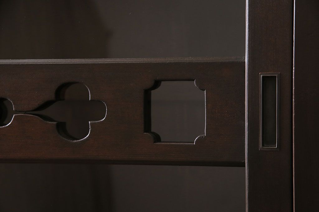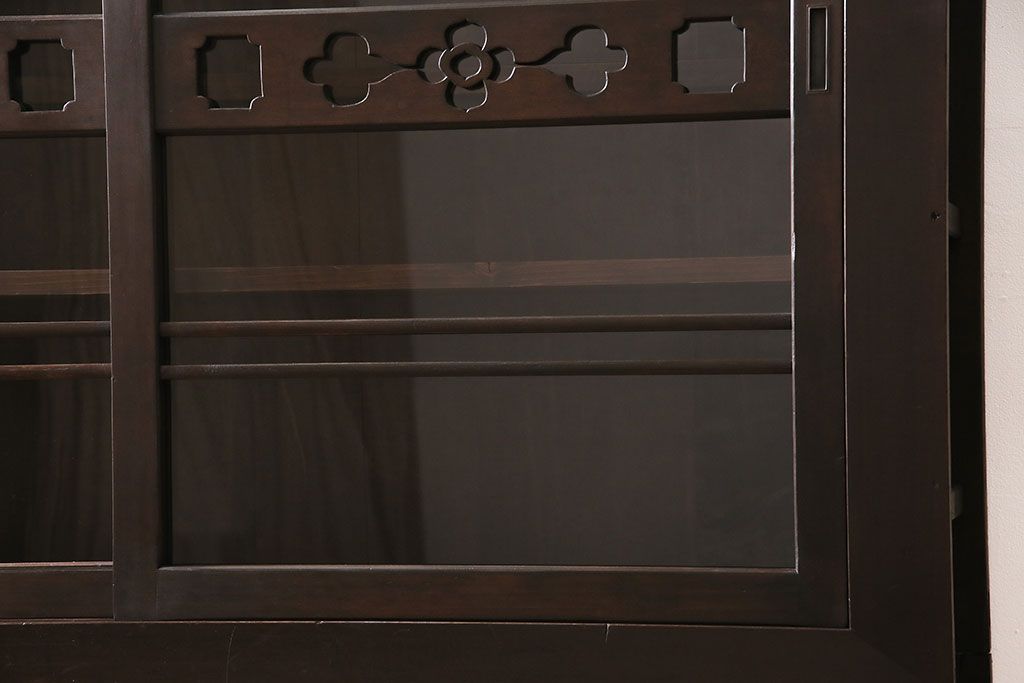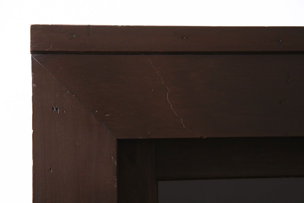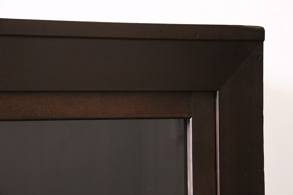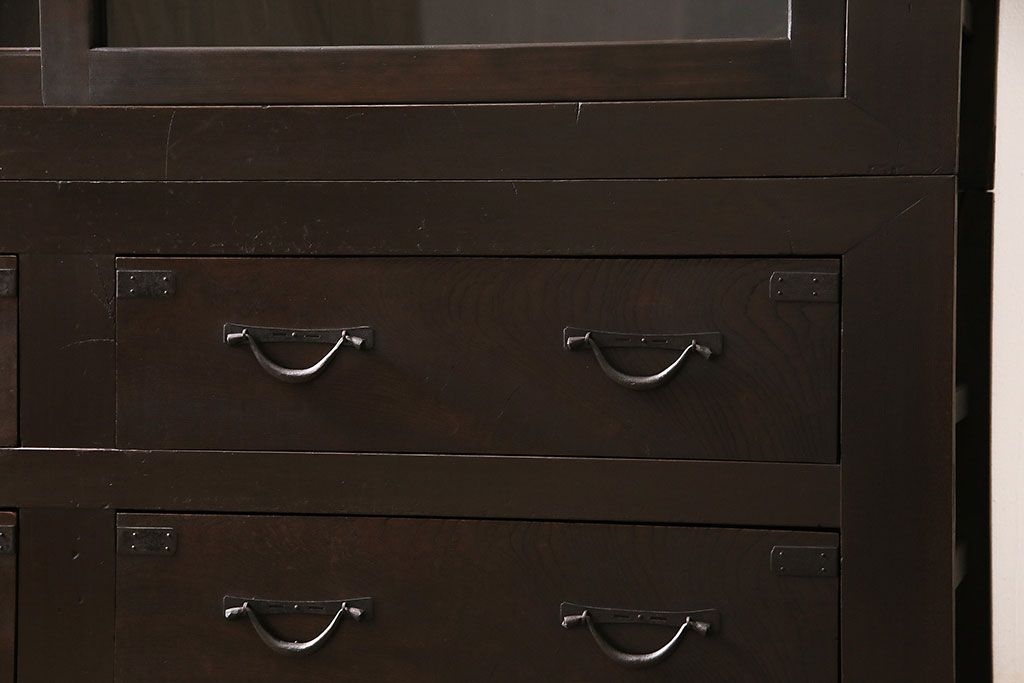 セミオーダー家具実績 > 五尺収納箪笥キャビネットをリペア&カスタム!戸板をゆらゆらガラスへ変更。引き手を取り付け。可動式の棚板を設置。濃い茶色で着色し仕上げ。(水屋箪笥、収納棚、戸棚、キャビネット)