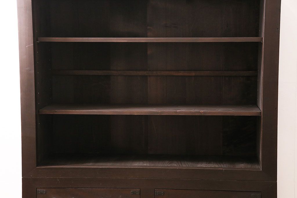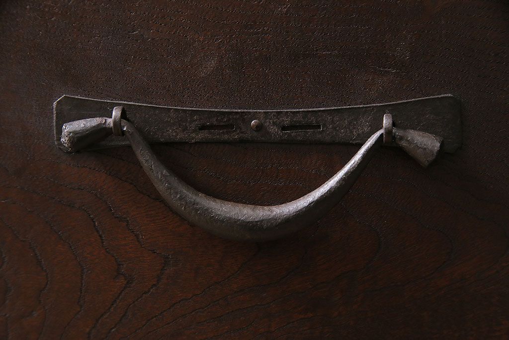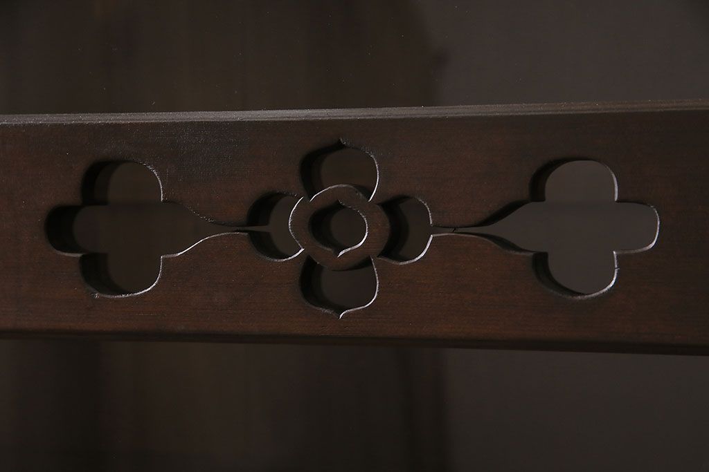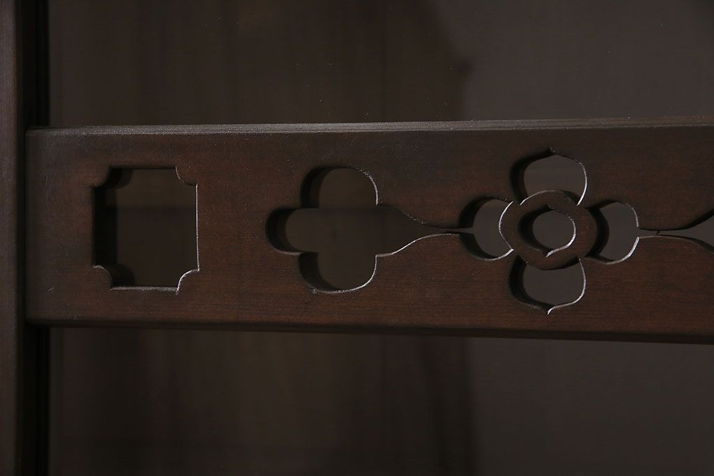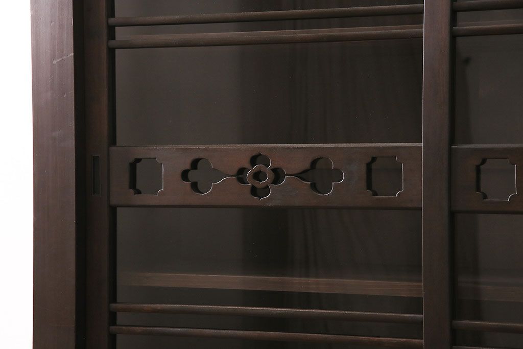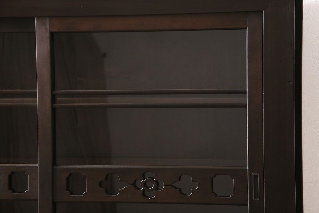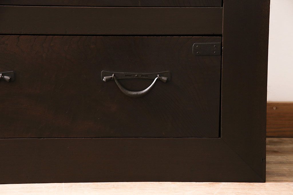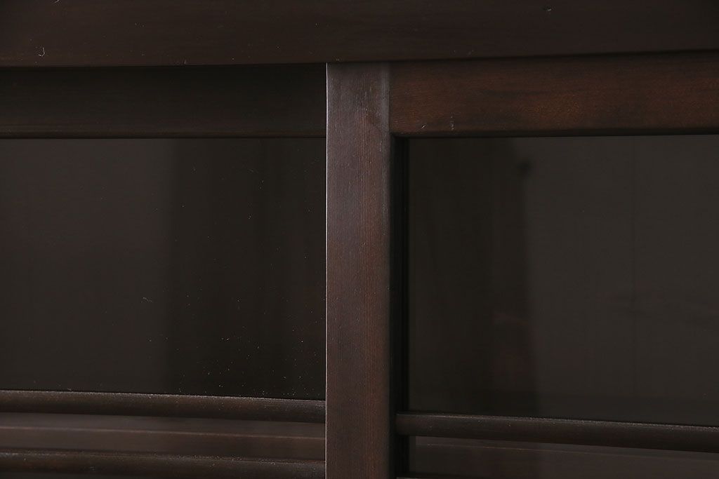 セミオーダー家具実績 > 五尺収納箪笥キャビネットをリペア&カスタム!戸板をゆらゆらガラスへ変更。引き手を取り付け。可動式の棚板を設置。濃い茶色で着色し仕上げ。(水屋箪笥、収納棚、戸棚、キャビネット)