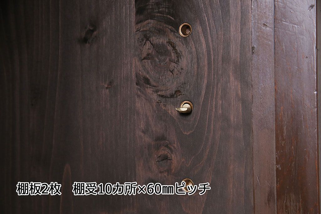 棚板は取り外しできます。棚板は2枚あります。棚受けは10ヶ所、60mmピッチで調整できます。棚幅サイズのものが1枚の作りです。