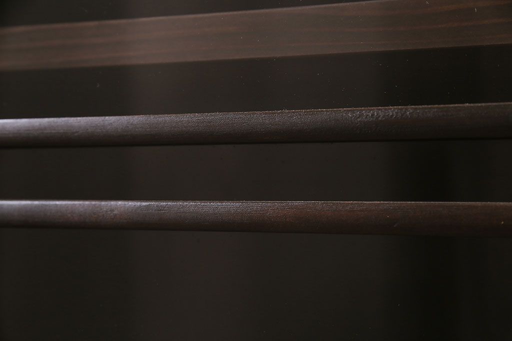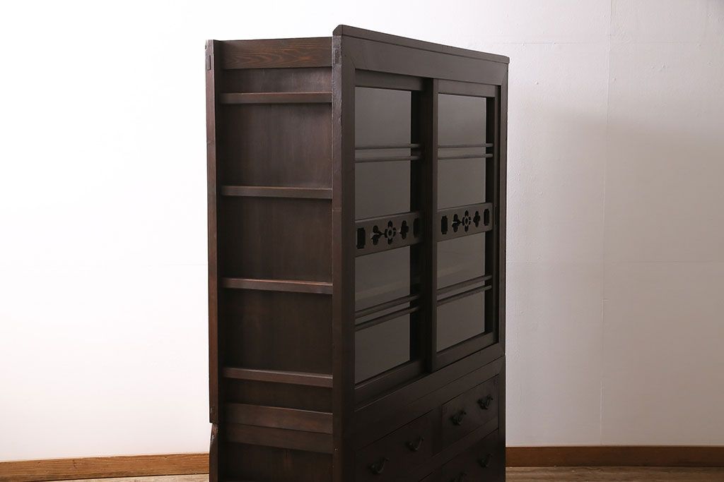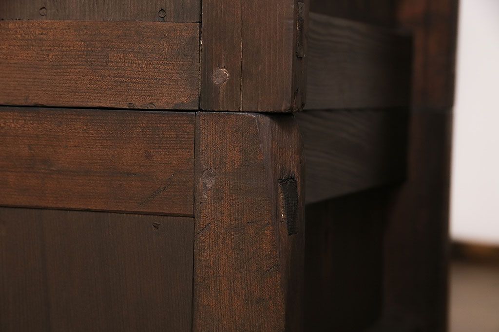 和箪笥> 水屋箪笥 > 五尺収納箪笥キャビネットをリペア&カスタム!戸板をゆらゆらガラスへ変更。引き手を取り付け。可動式の棚板を設置。濃い茶色で着色し仕上げ。(水屋箪笥、収納棚、戸棚、キャビネット)