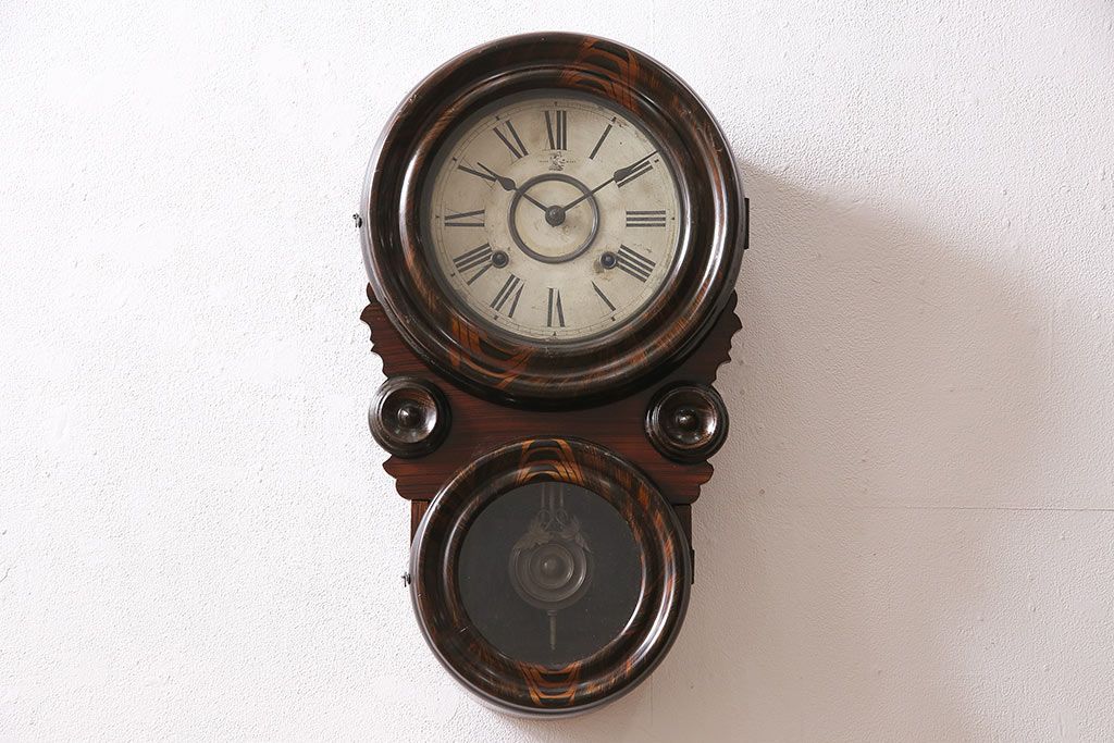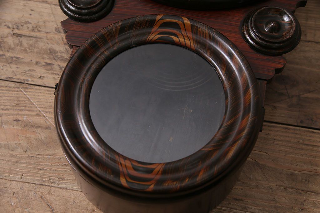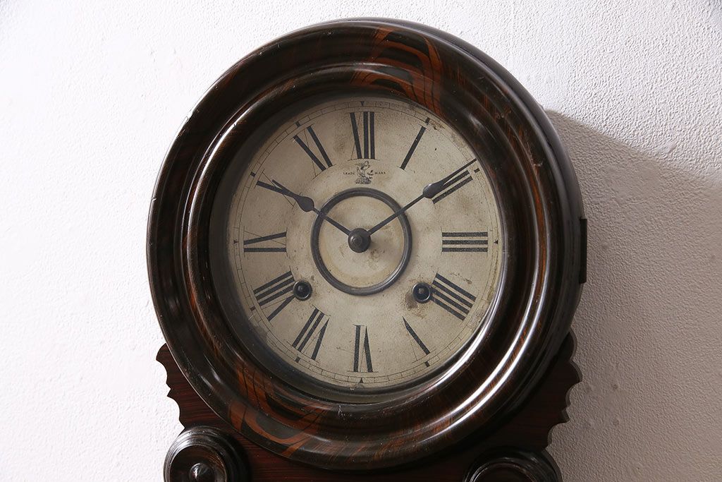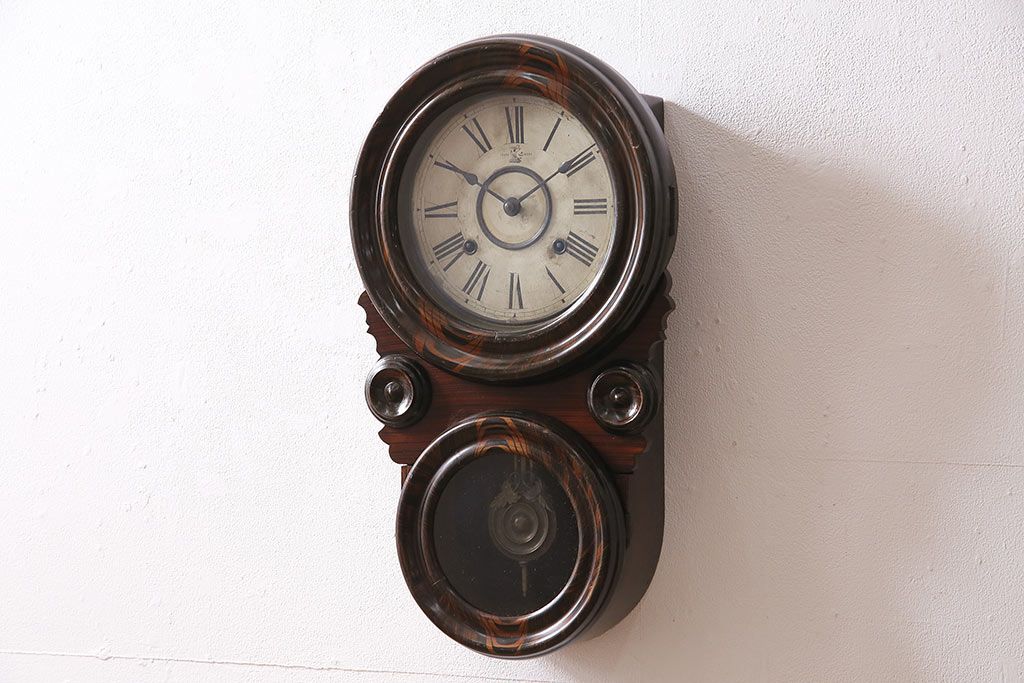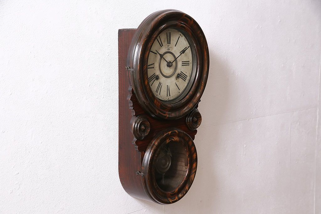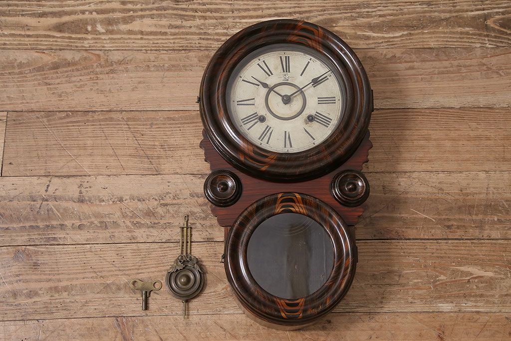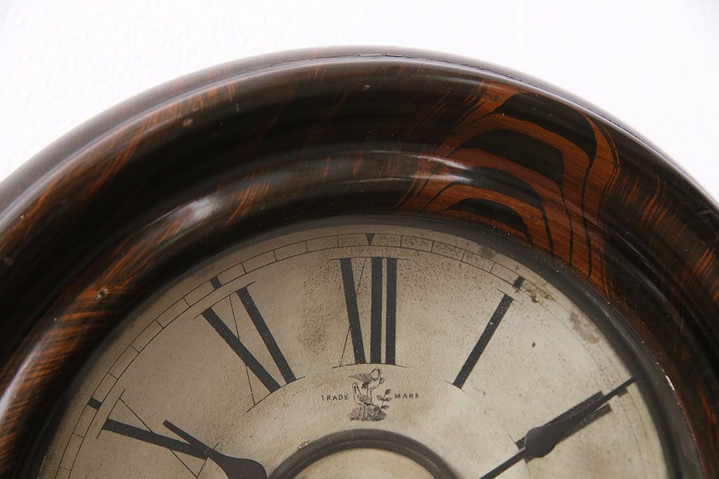 アンティーク時計 ホースマーク マーブル模様の木目が味わい深い!四つ丸が特徴のゼンマイ式だるま時計(掛時計、柱時計、振り子時計)(R-047247)