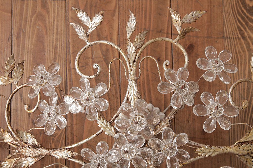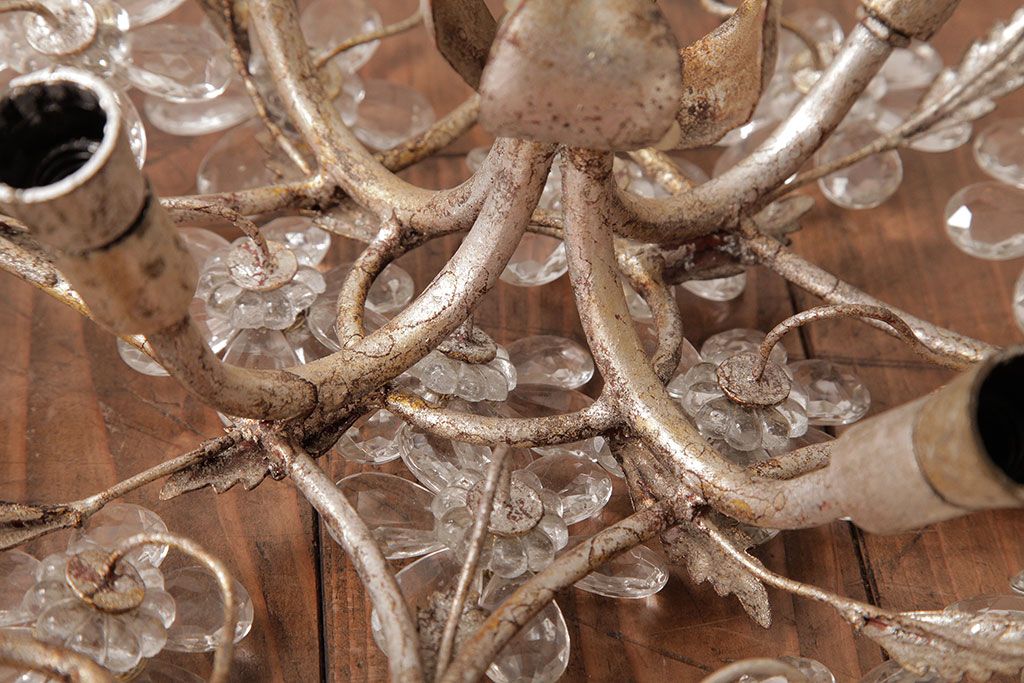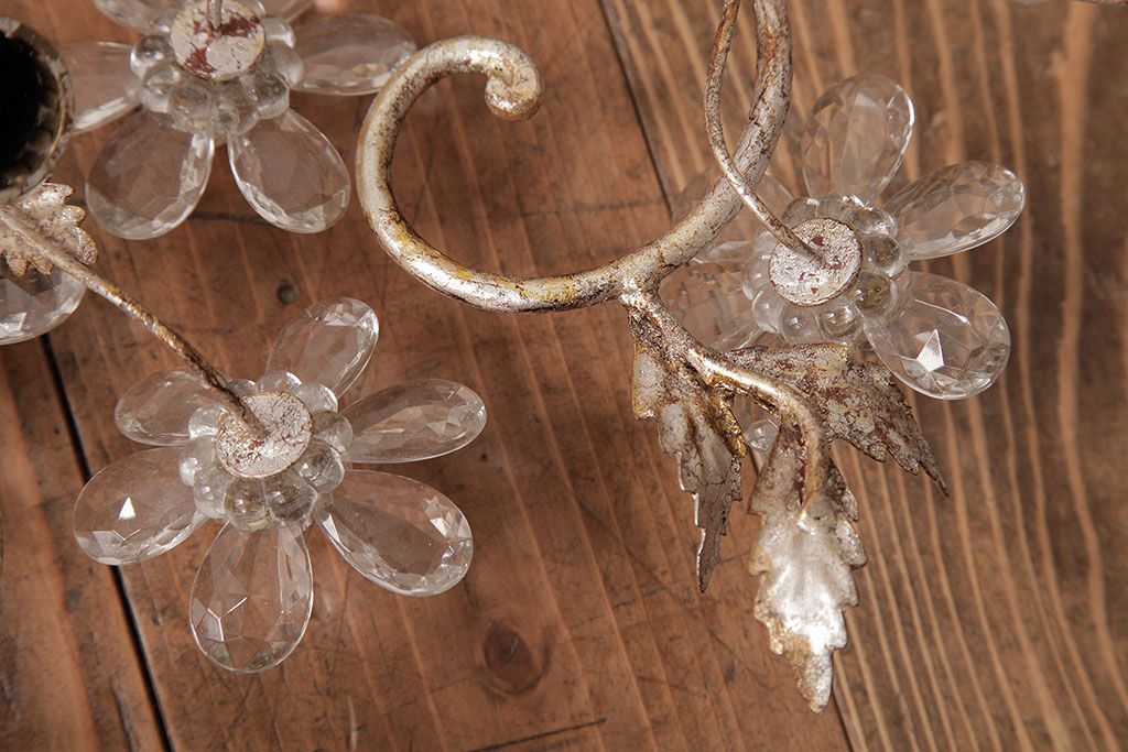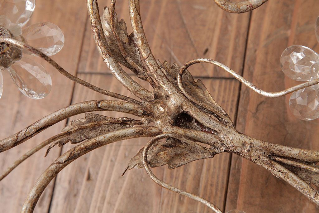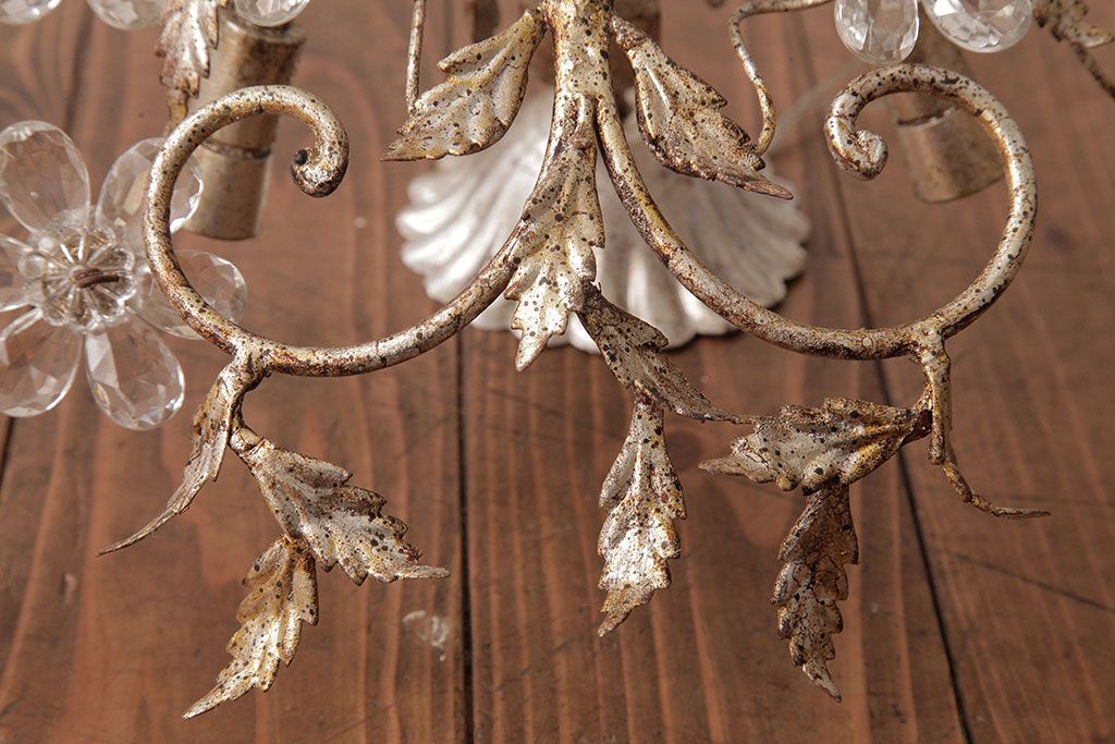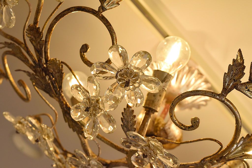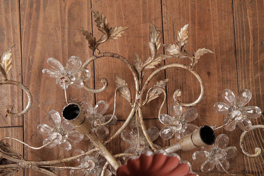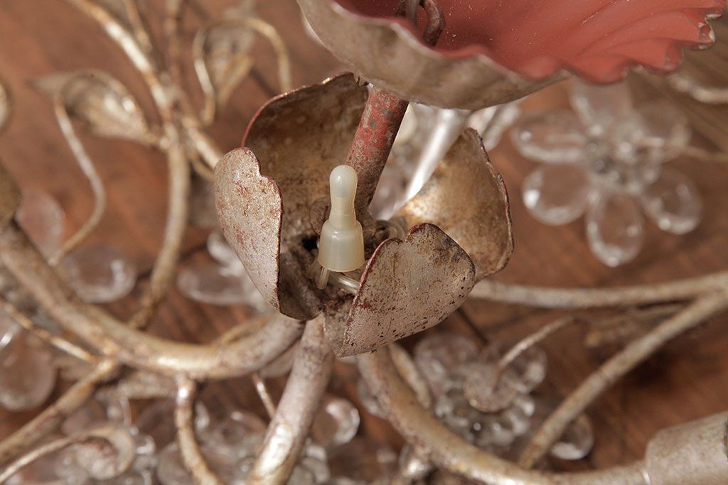照明・ランプ> シャンデリア > フランスヴィンテージ 鉄製 フラワーモチーフのガラスが可憐な印象を与える4灯シャンデリア(天井照明、吊り下げ照明、ビンテージ)(R-047985)