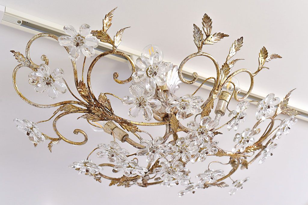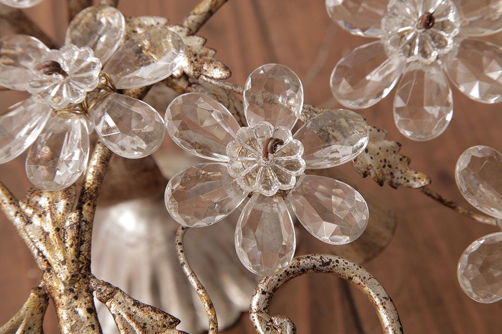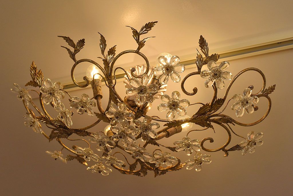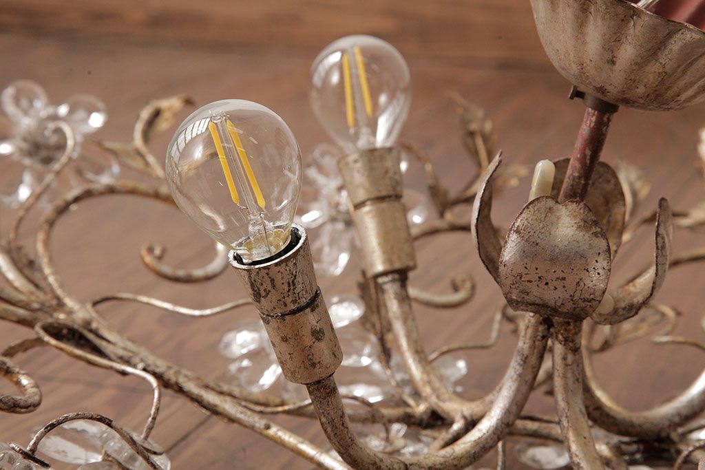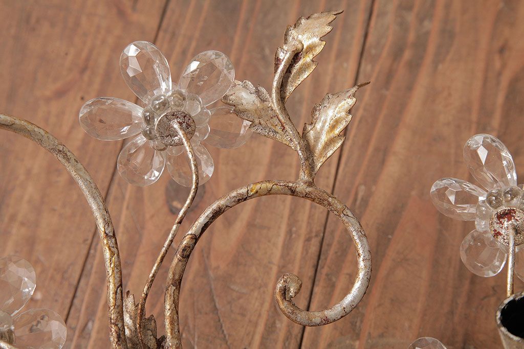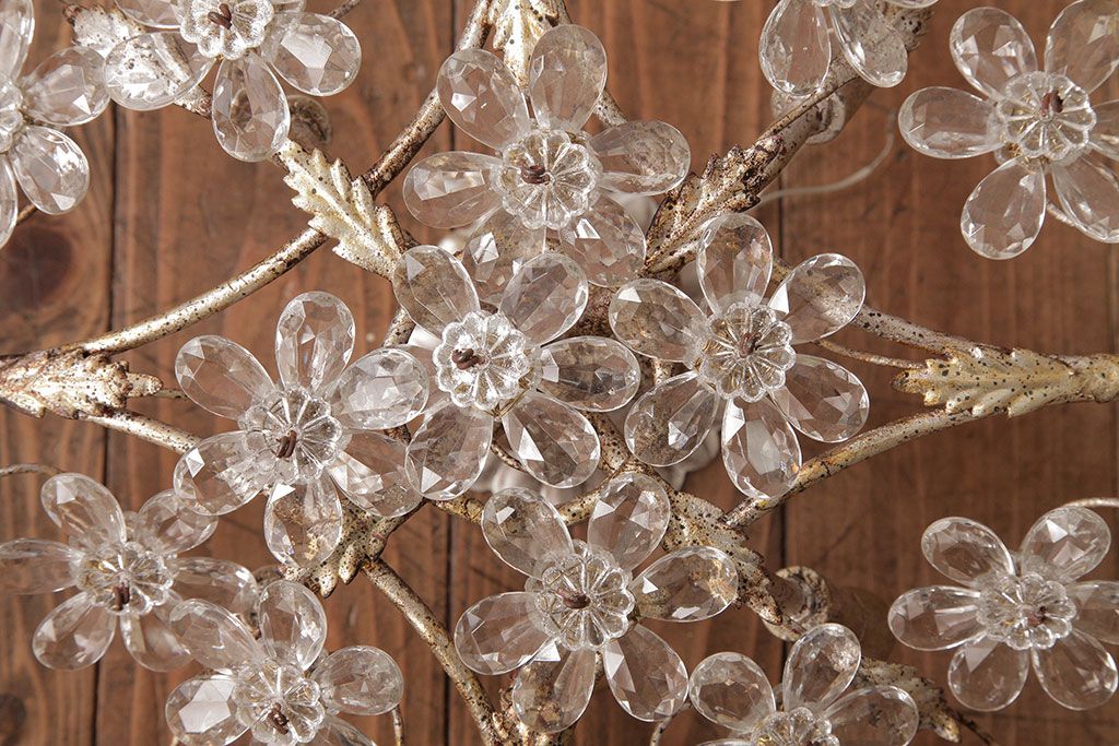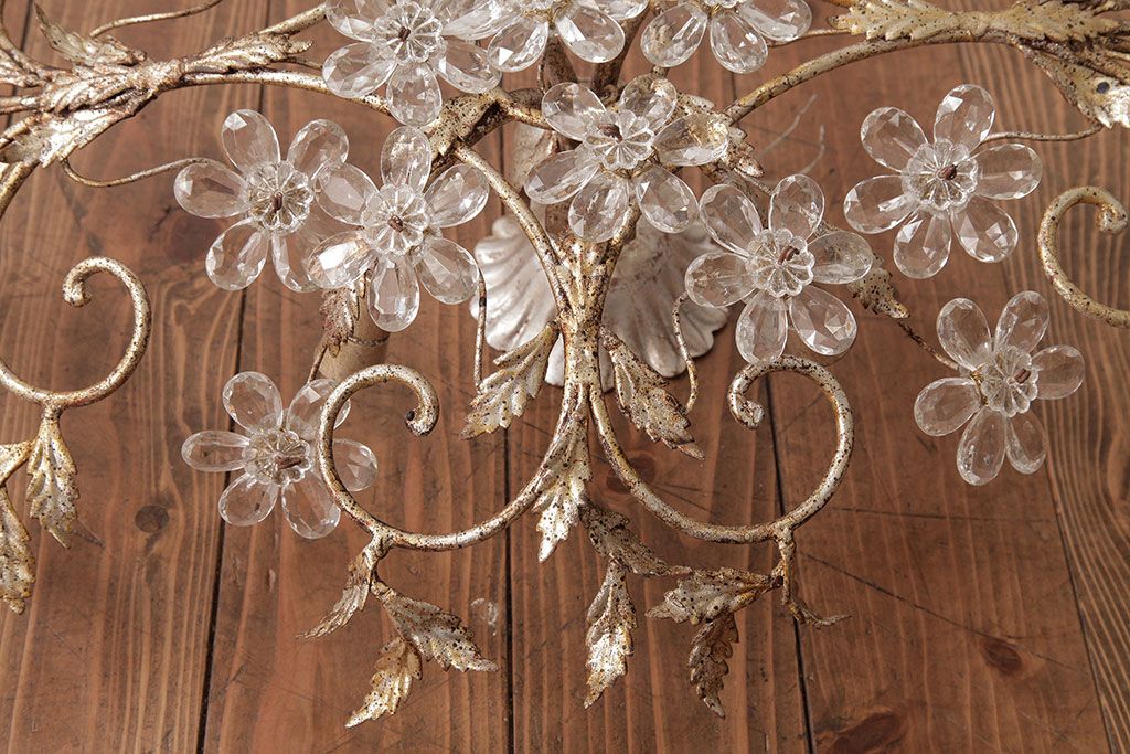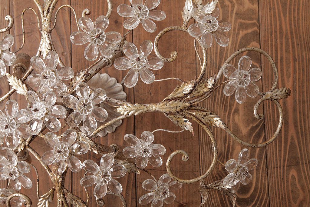 照明・ランプ> シャンデリア > フランスヴィンテージ 鉄製 フラワーモチーフのガラスが可憐な印象を与える4灯シャンデリア(天井照明、吊り下げ照明、ビンテージ)(R-047985)