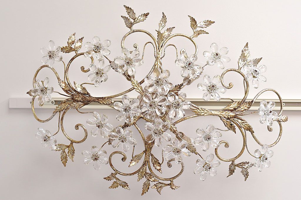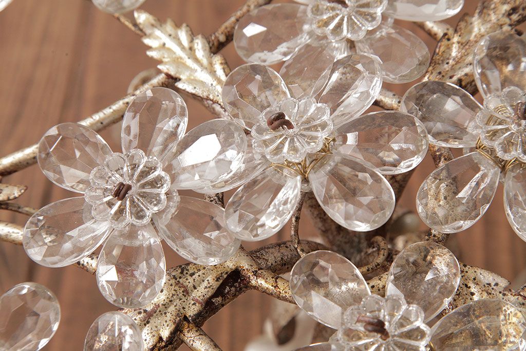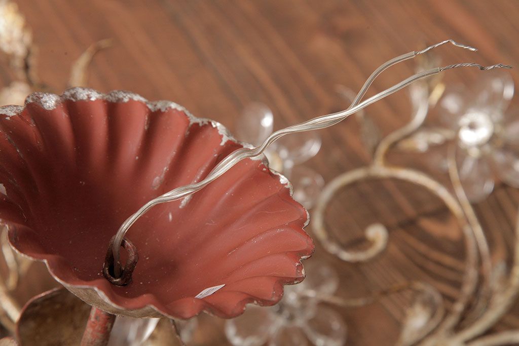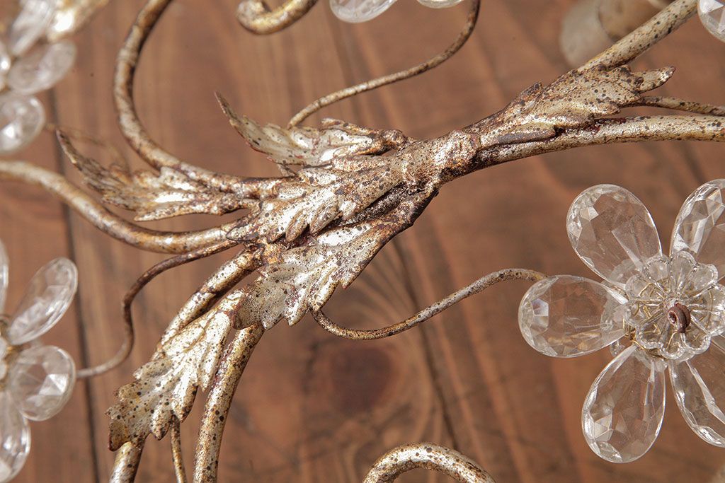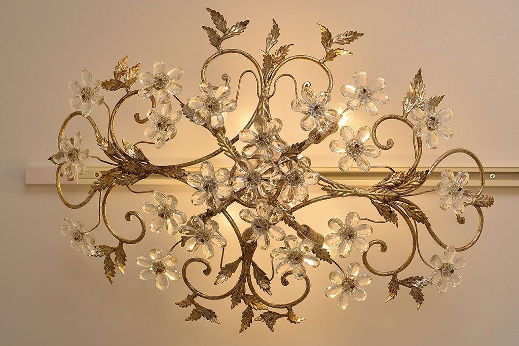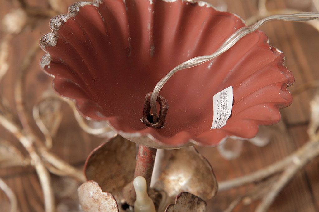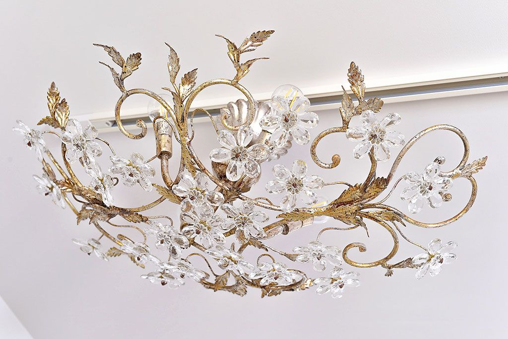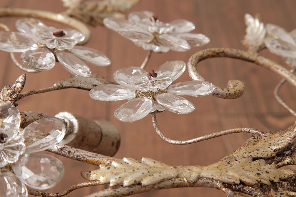 照明・ランプ> シャンデリア > フランスヴィンテージ 鉄製 フラワーモチーフのガラスが可憐な印象を与える4灯シャンデリア(天井照明、吊り下げ照明、ビンテージ)(R-047985)