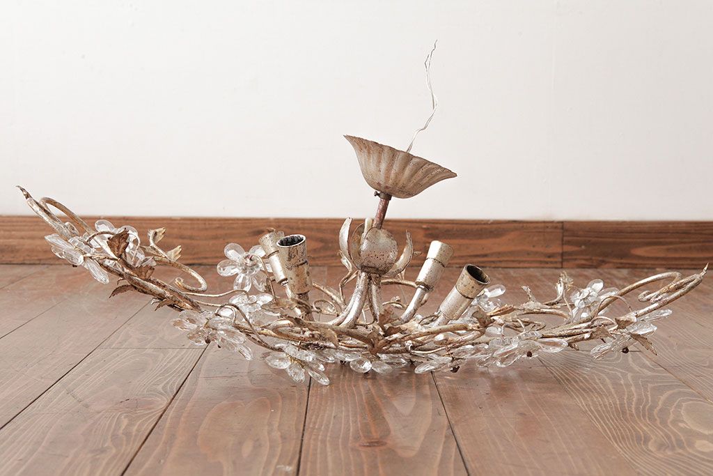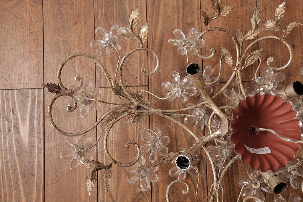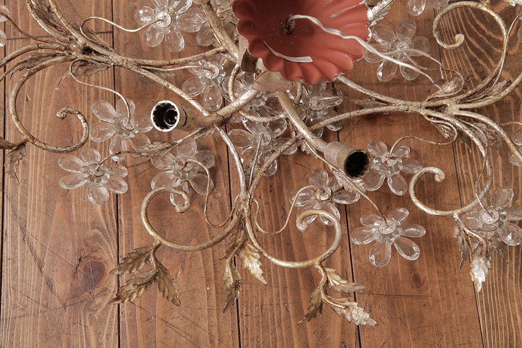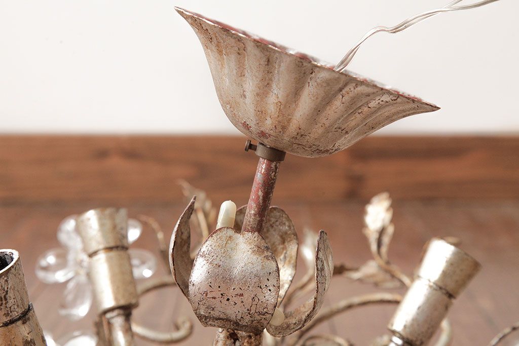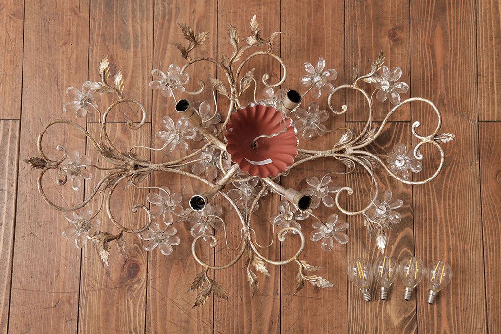 フランスヴィンテージ 鉄製 フラワーモチーフのガラスが可憐な印象を与える4灯シャンデリア(天井照明、吊り下げ照明)(R-047985)です。