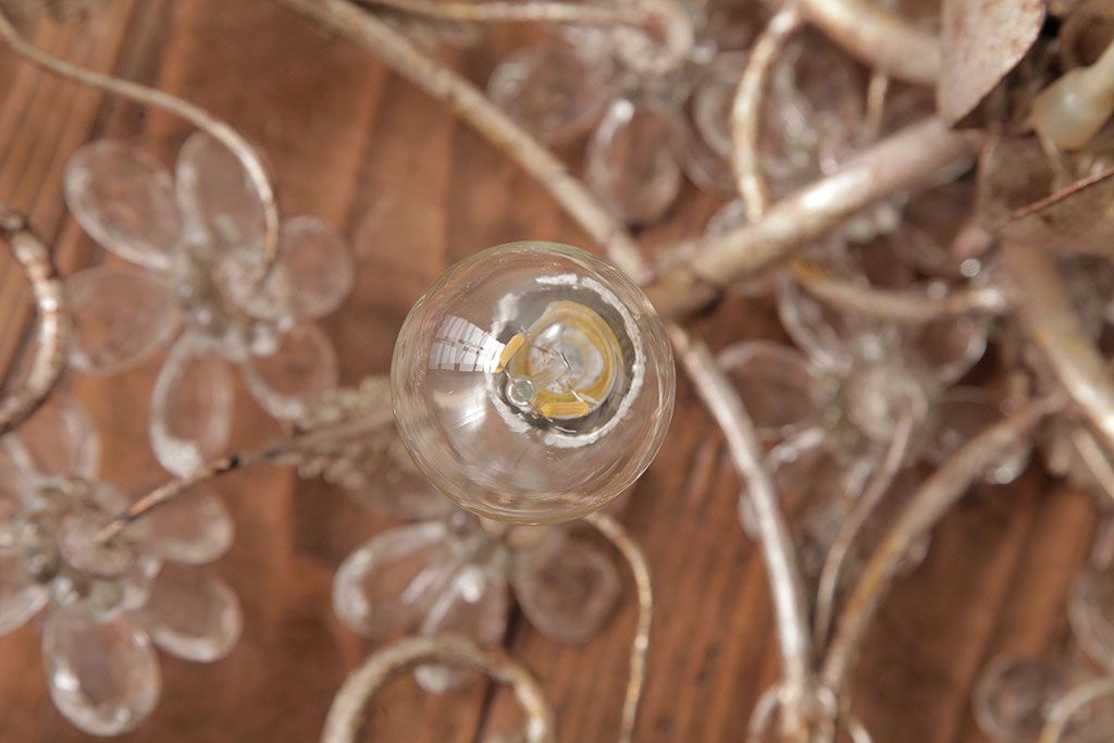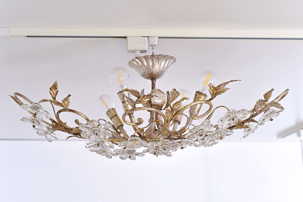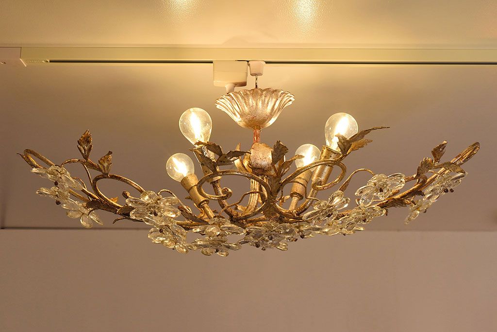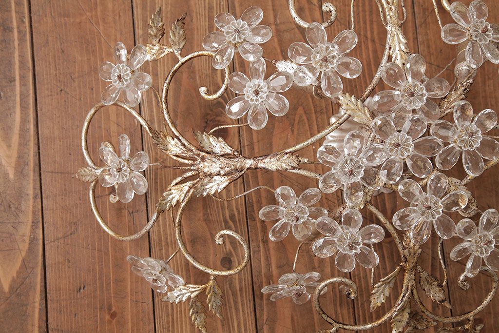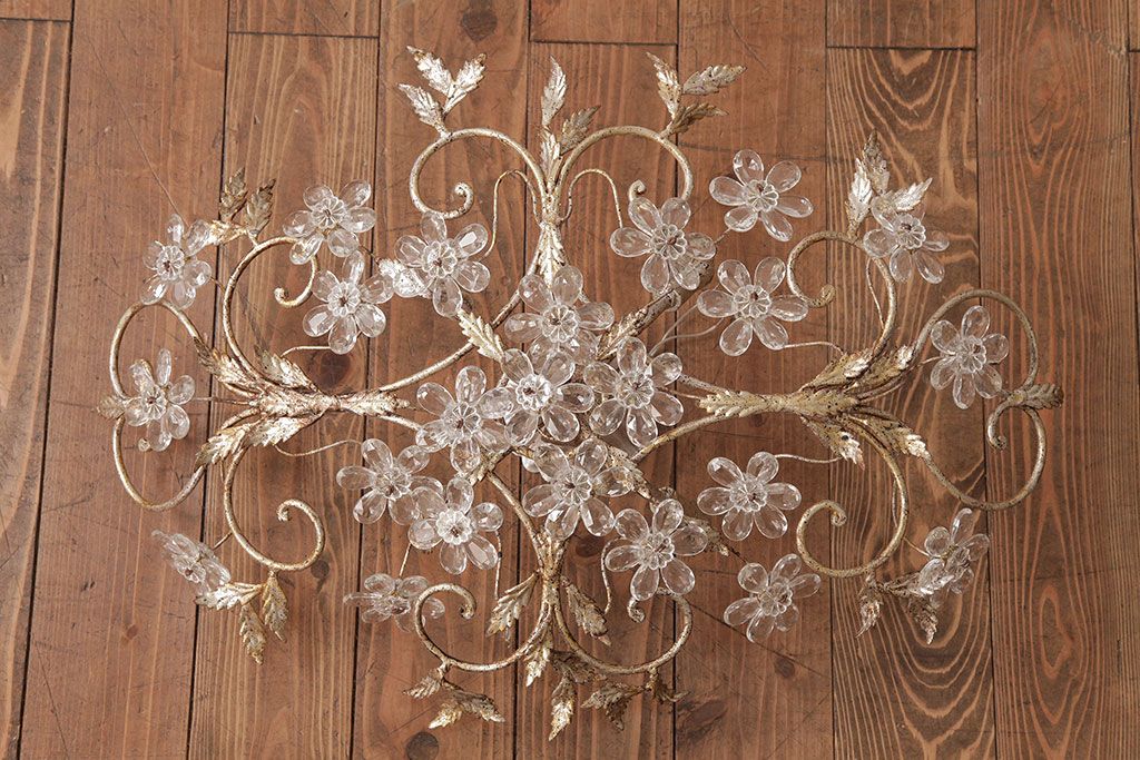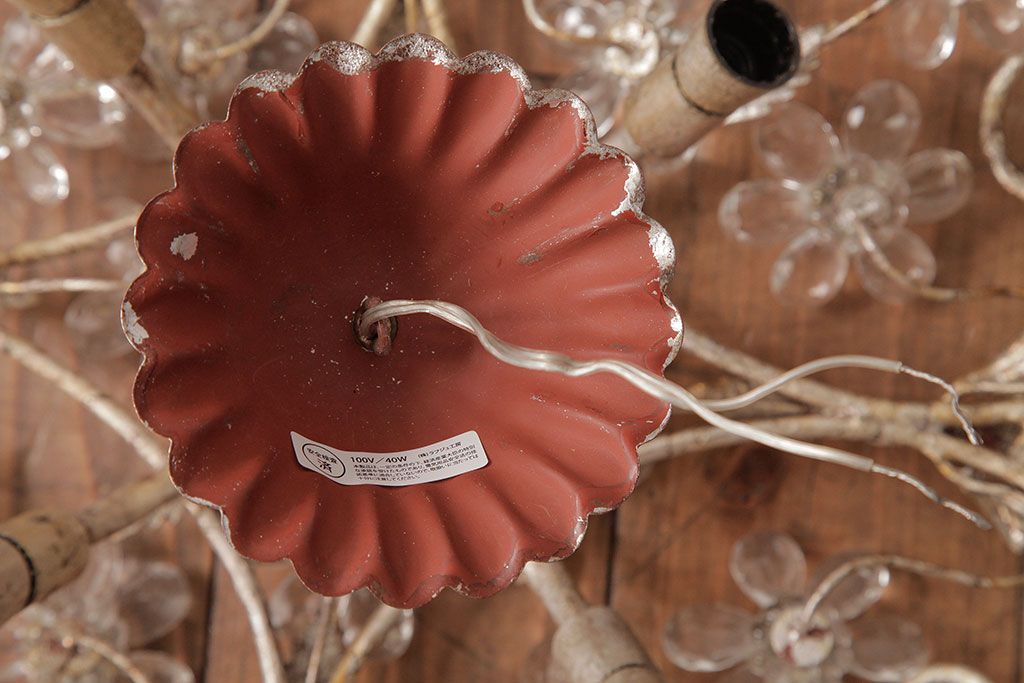 フランスヴィンテージ 鉄製 フラワーモチーフのガラスが可憐な印象を与える4灯シャンデリア(天井照明、吊り下げ照明)(R-047985)です。
