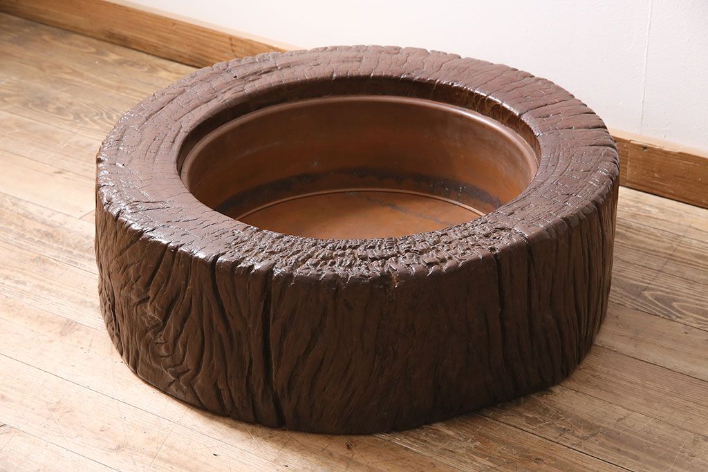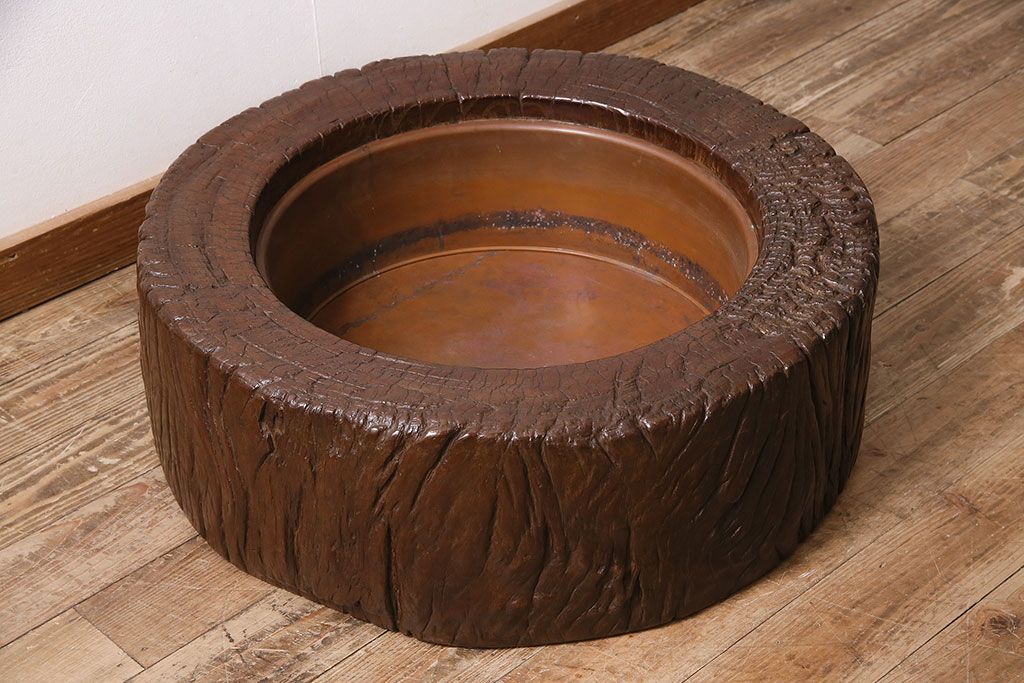 アンティーク雑貨 総ケヤキ材 経年による独特の風合いがお楽しみいただけるくり貫き火鉢(くりぬき火鉢、鉢カバー)(R-047270)