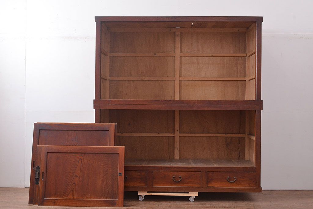 和箪笥> 水屋箪笥 > 和製アンティーク 前面ケヤキ材 重厚感のある佇まいが魅力的な重ね収納棚(水屋箪笥、収納箪笥、キャビネット)(R-040762)
