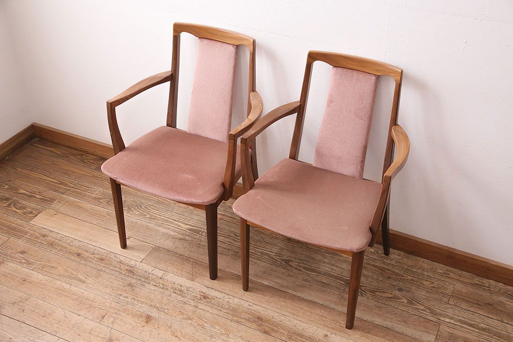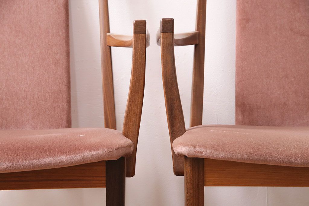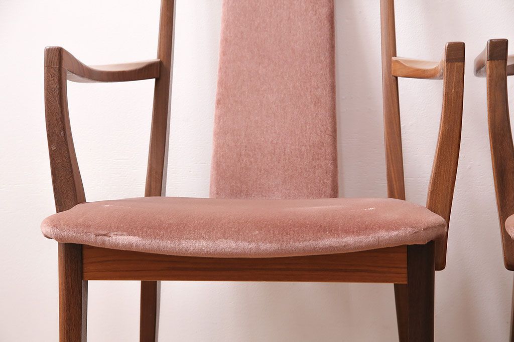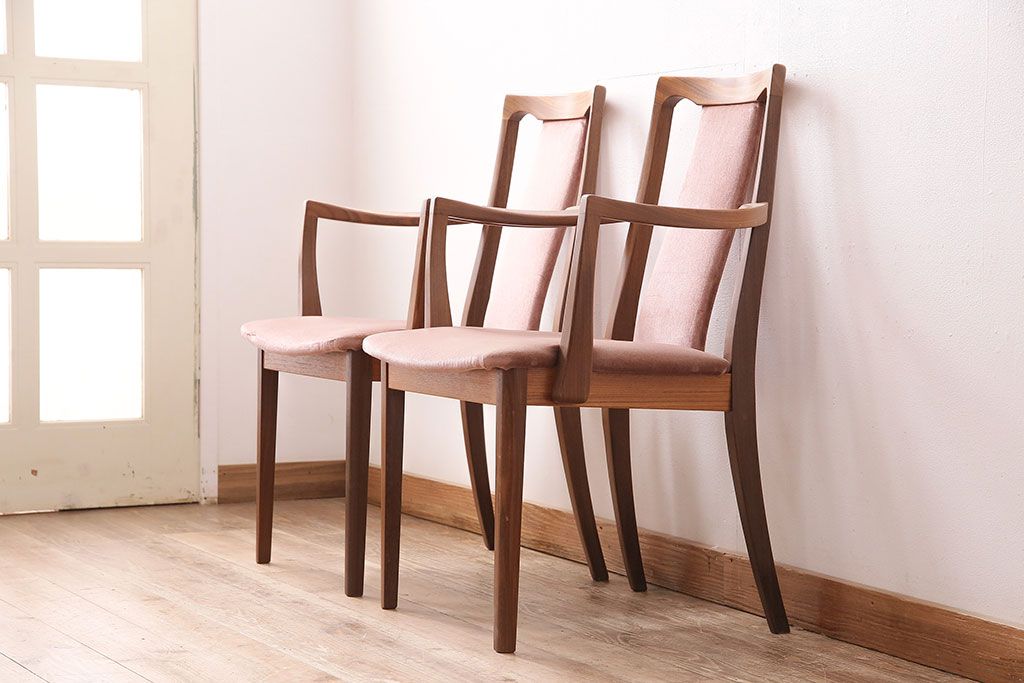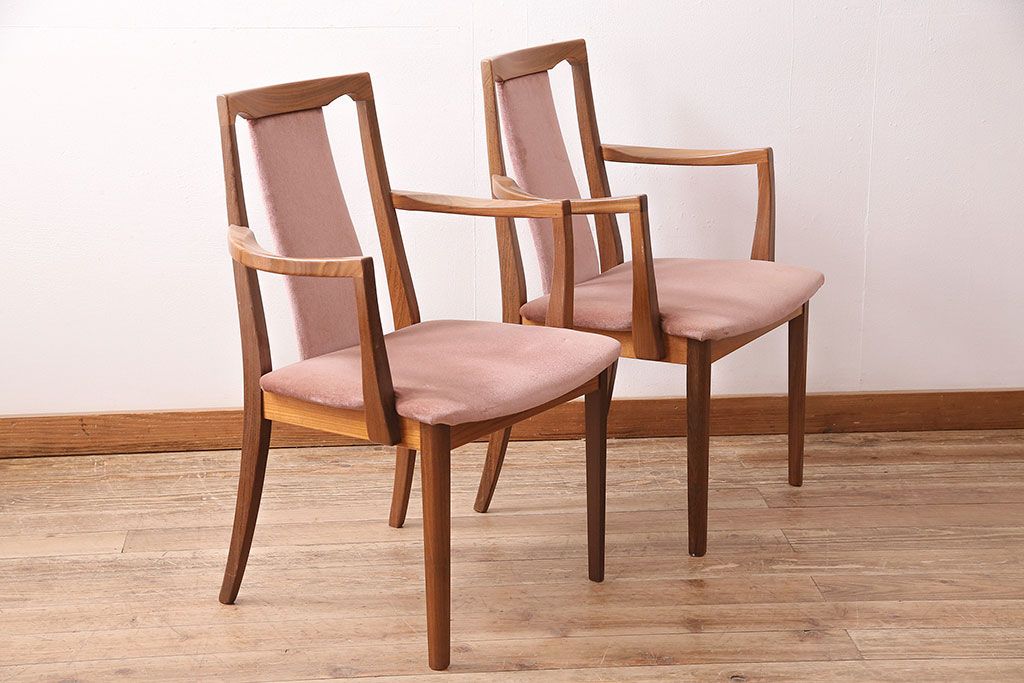 状態が気になる方には現状販売はおすすめできませんので、慎重なご検討をお願いいたします。イギリスビンテージ 人気のG-PLAN!背もたれにもファブリックが使われている、アーム付きのチェア2脚セット(ダイニングチェア、椅子、アームチェア、バラ売り可能)(R-047846)です。
