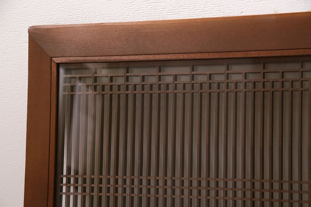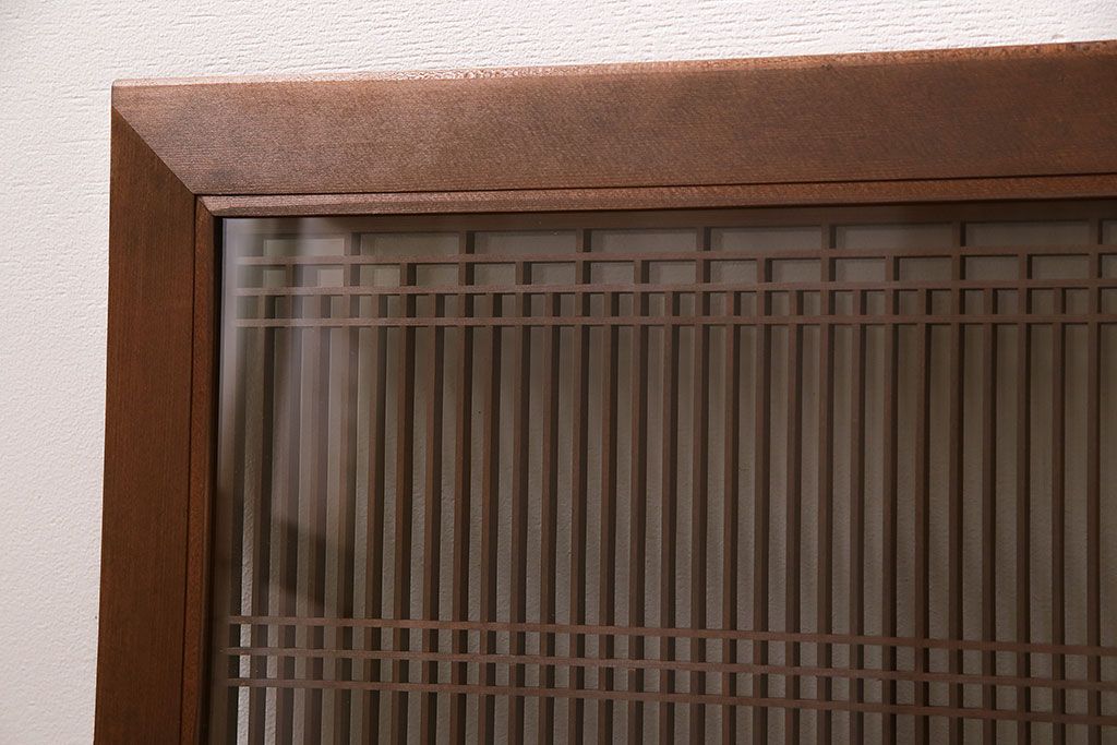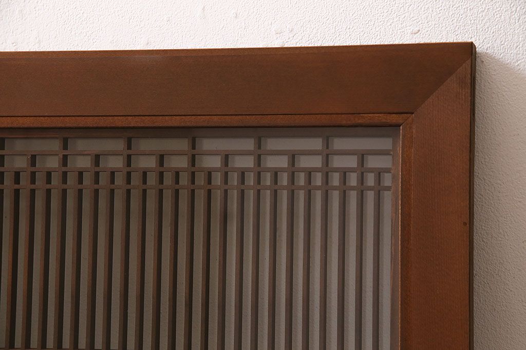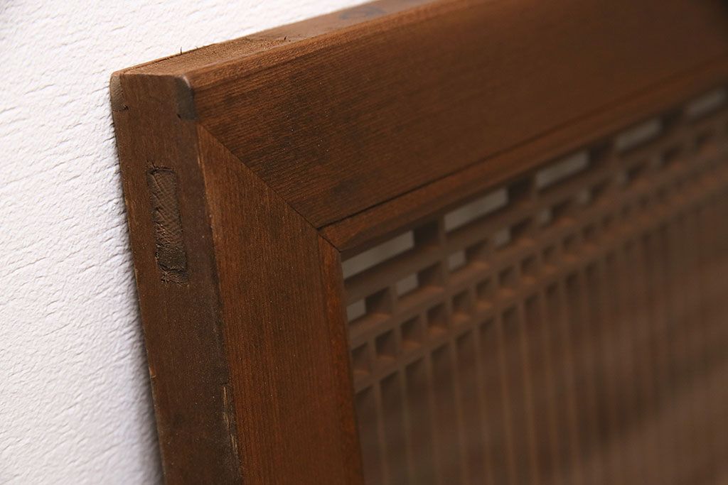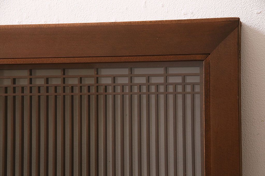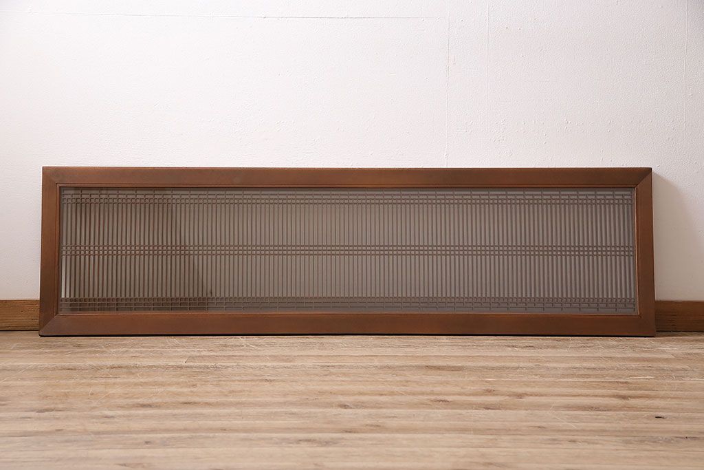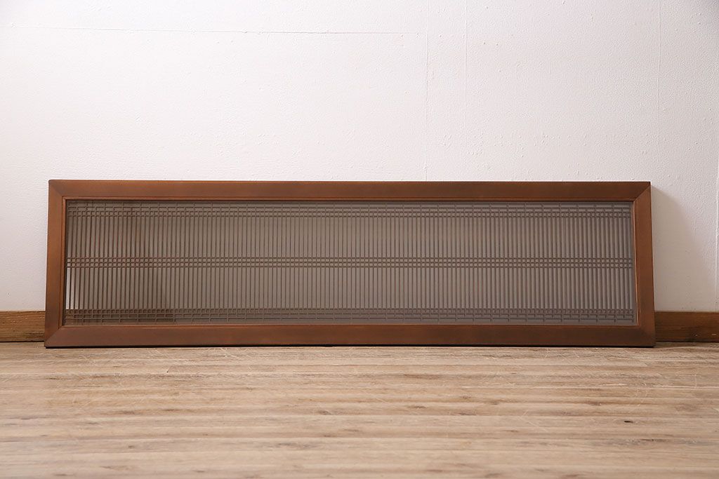 アンティーク建具 シンプルでモダンな意匠の筬欄間(オサランマ、明り取り、建具)(R-047280)です。 昭和中期につくられた シンプルなデザインが魅力的な筬(おさ)欄間です。 整然と並んだ桟と深みのある色味が 上品で、落ち着いた和の空間づくりに 活躍してくれます。 和モダンなお部屋や店舗に いかがでしょうか。 こちらのお品は両面クリアガラスです。 ダメージが少なく、アンティーク品として高品質なお品です。 使用上問題のあるダメージはありません。 ■框サイズ 上45mm/左40mm/右40mm/下45mm ■重量 約11kg
