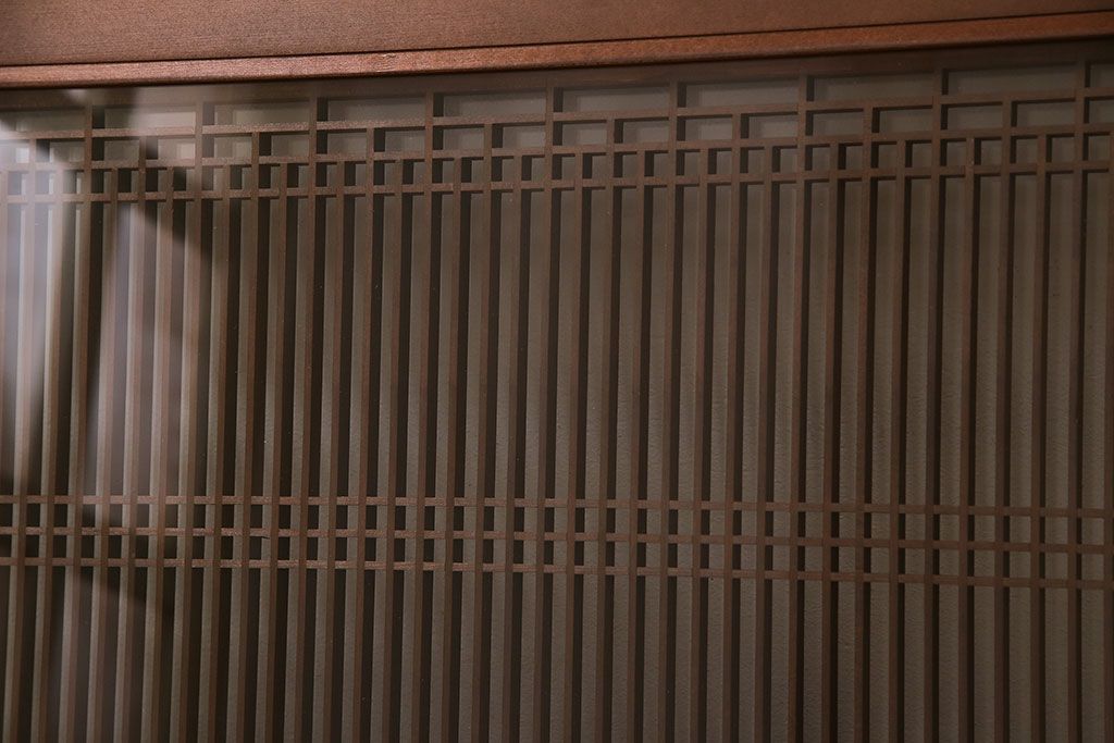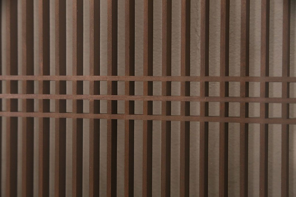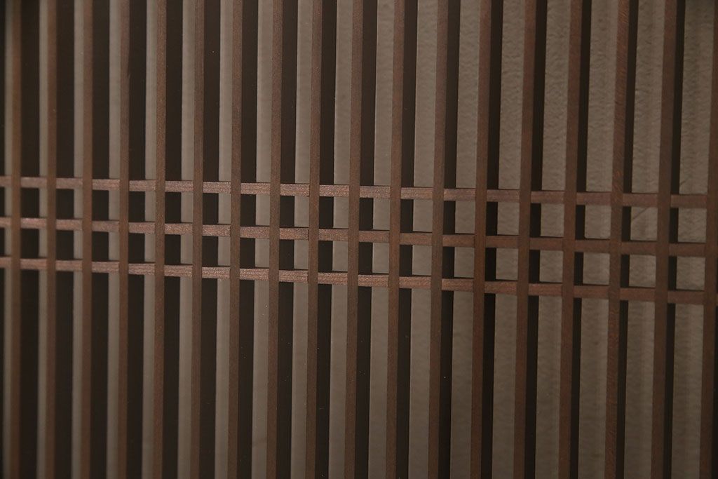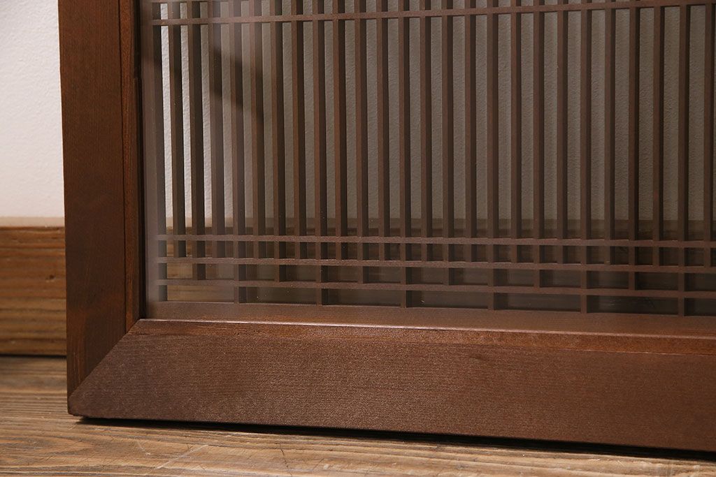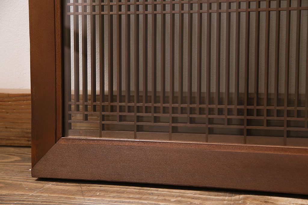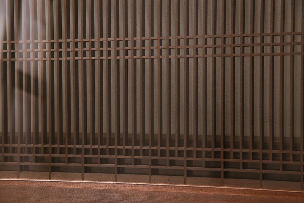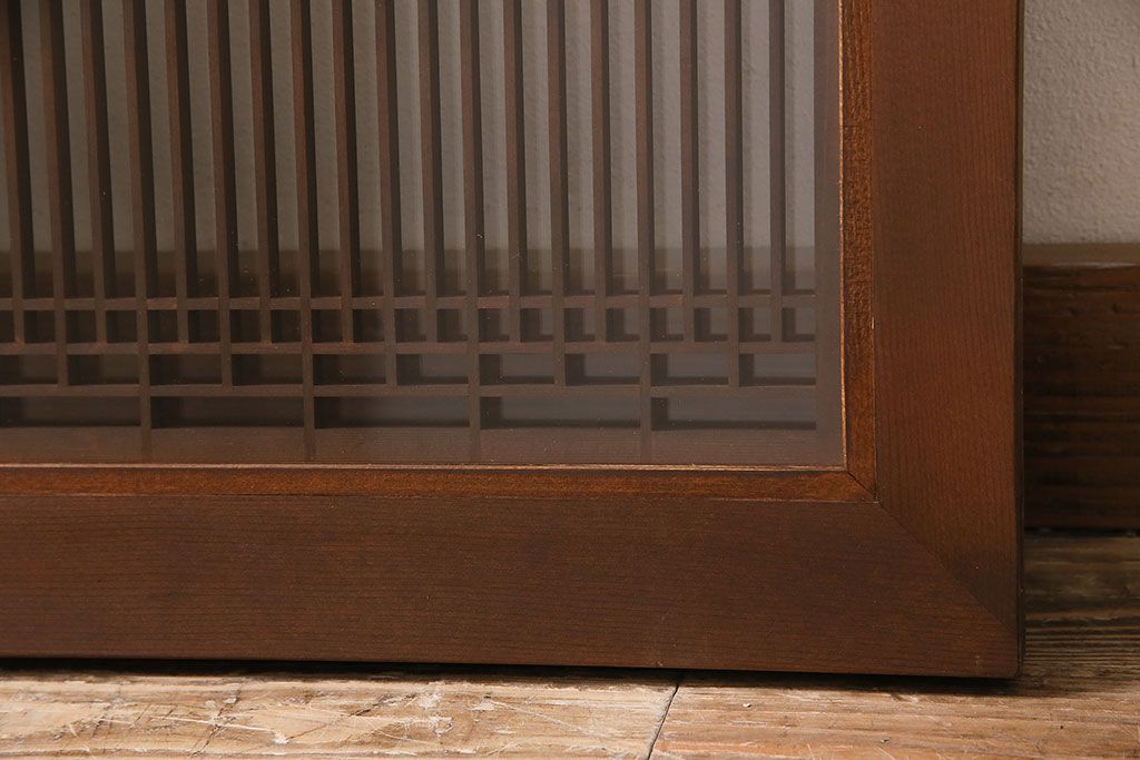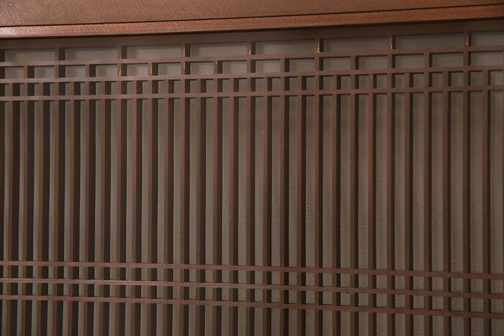 アンティーク建具 シンプルでモダンな意匠の筬欄間(オサランマ、明り取り、建具)(R-047280)です。 昭和中期につくられた シンプルなデザインが魅力的な筬(おさ)欄間です。 整然と並んだ桟と深みのある色味が 上品で、落ち着いた和の空間づくりに 活躍してくれます。 和モダンなお部屋や店舗に いかがでしょうか。 こちらのお品は両面クリアガラスです。 ダメージが少なく、アンティーク品として高品質なお品です。 使用上問題のあるダメージはありません。 ■框サイズ 上45mm/左40mm/右40mm/下45mm ■重量 約11kg