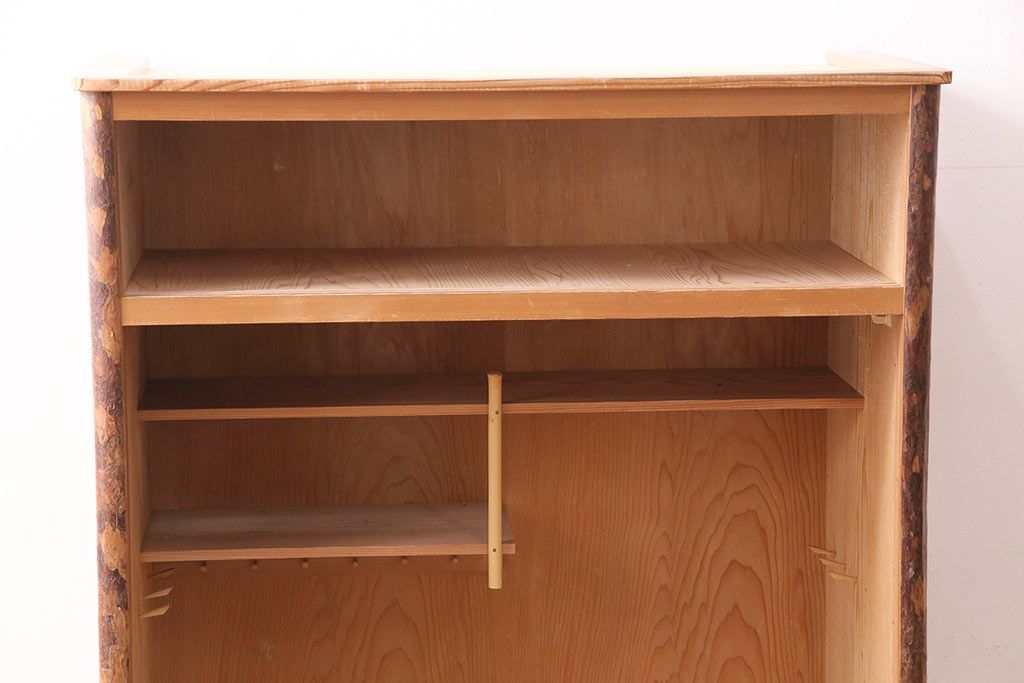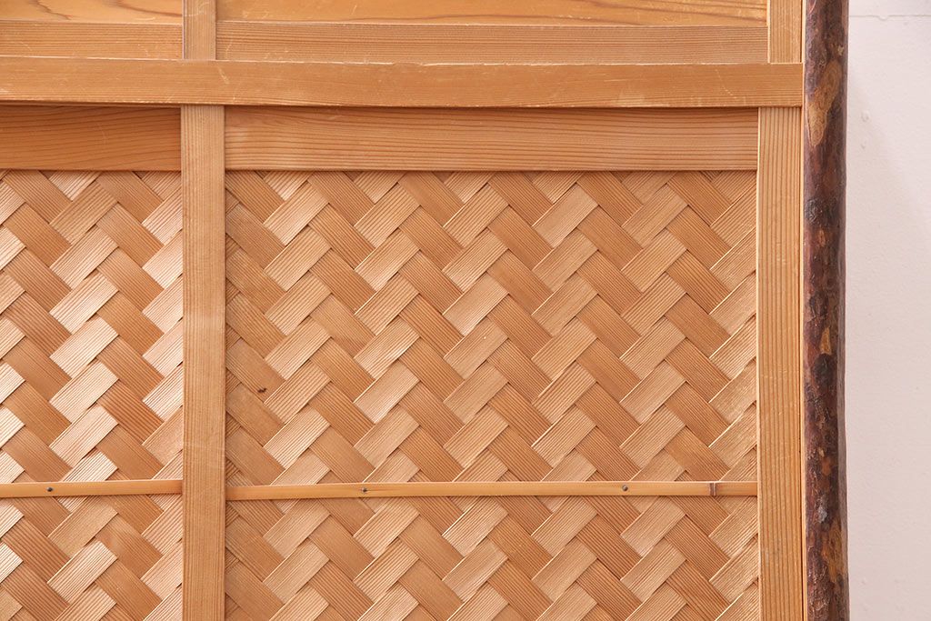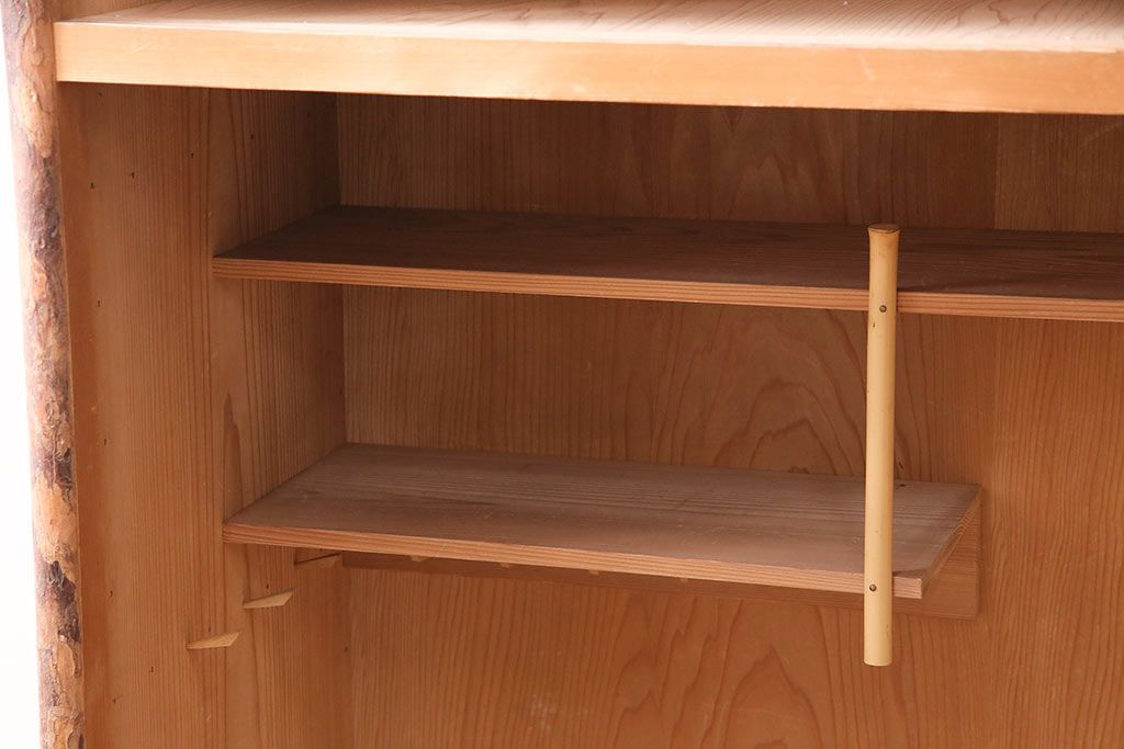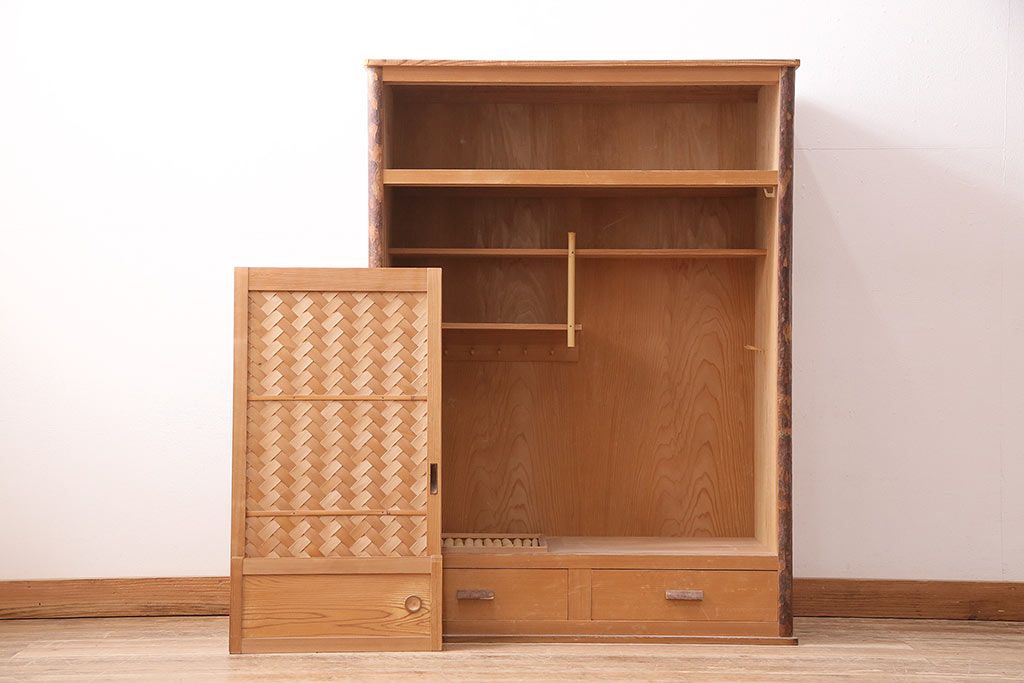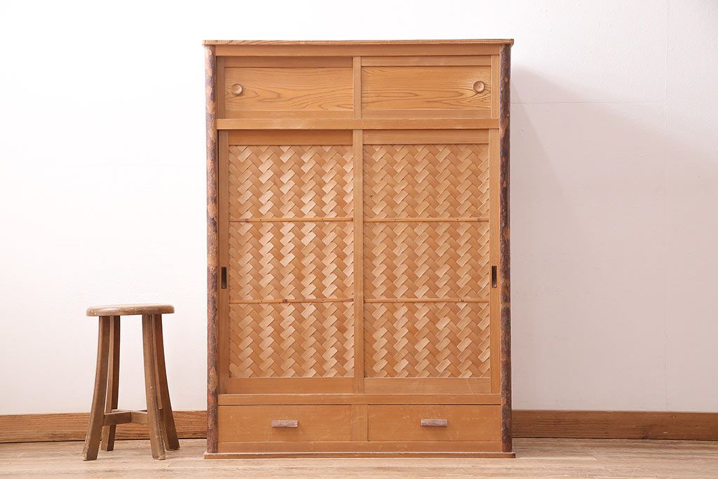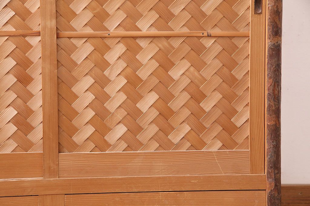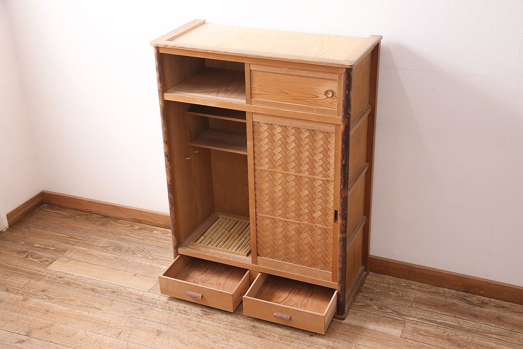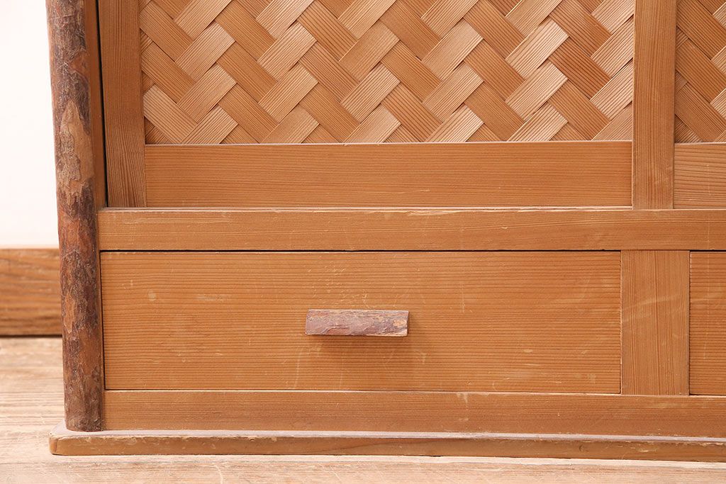 中古 民芸家具 杉材・桜皮 網代引戸が目を引く、手の込んだ造りが魅力の置き水屋(置水屋、茶水屋、茶道具、戸棚)(R-047931)