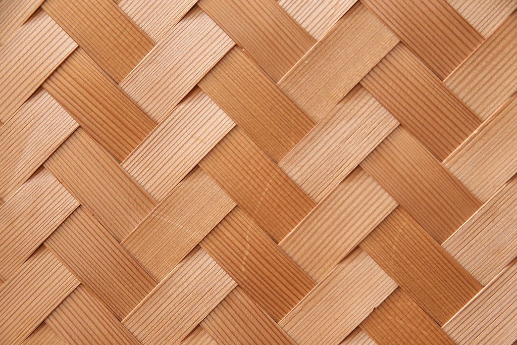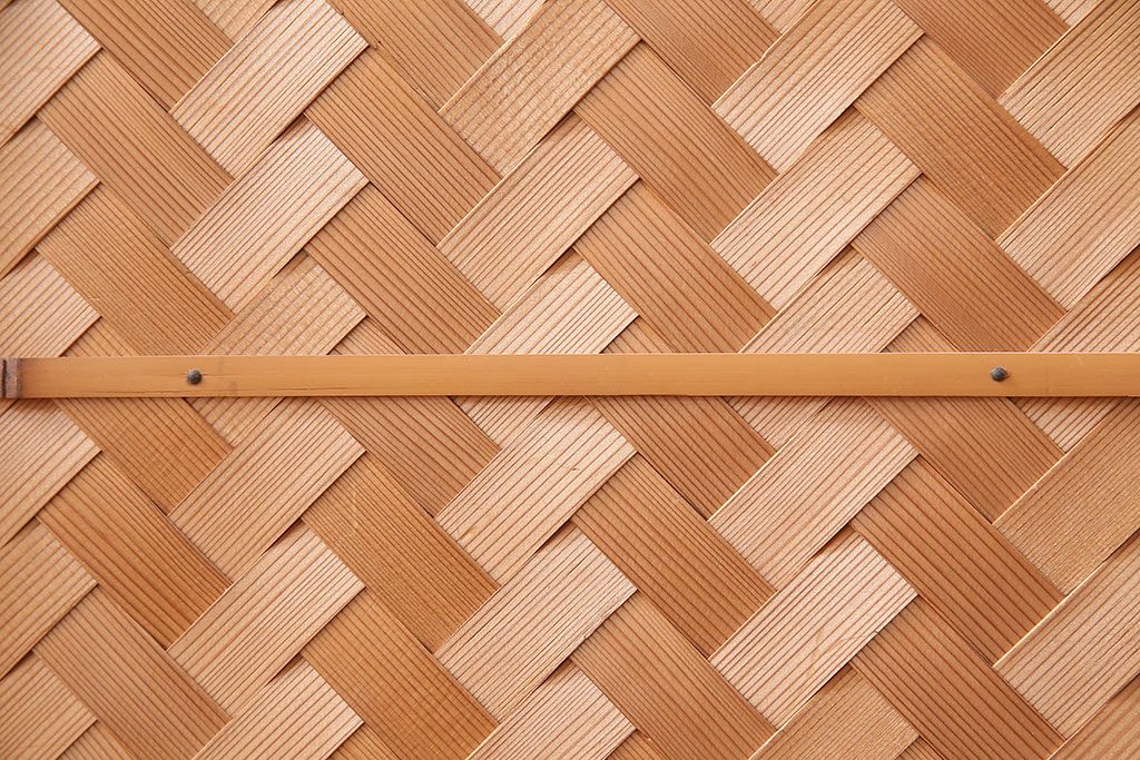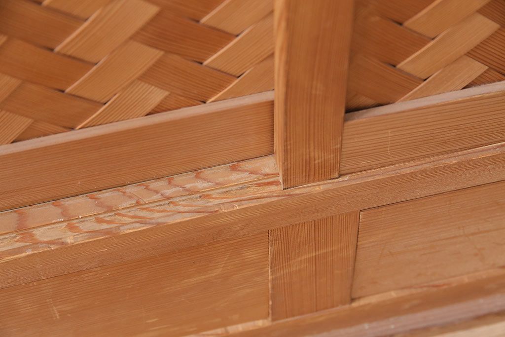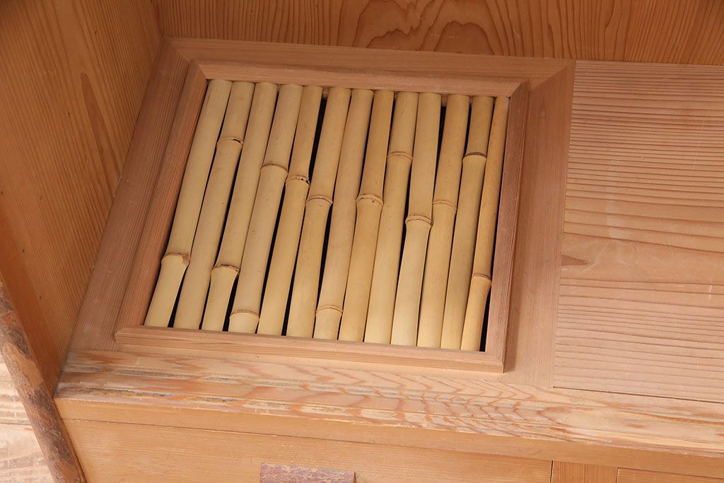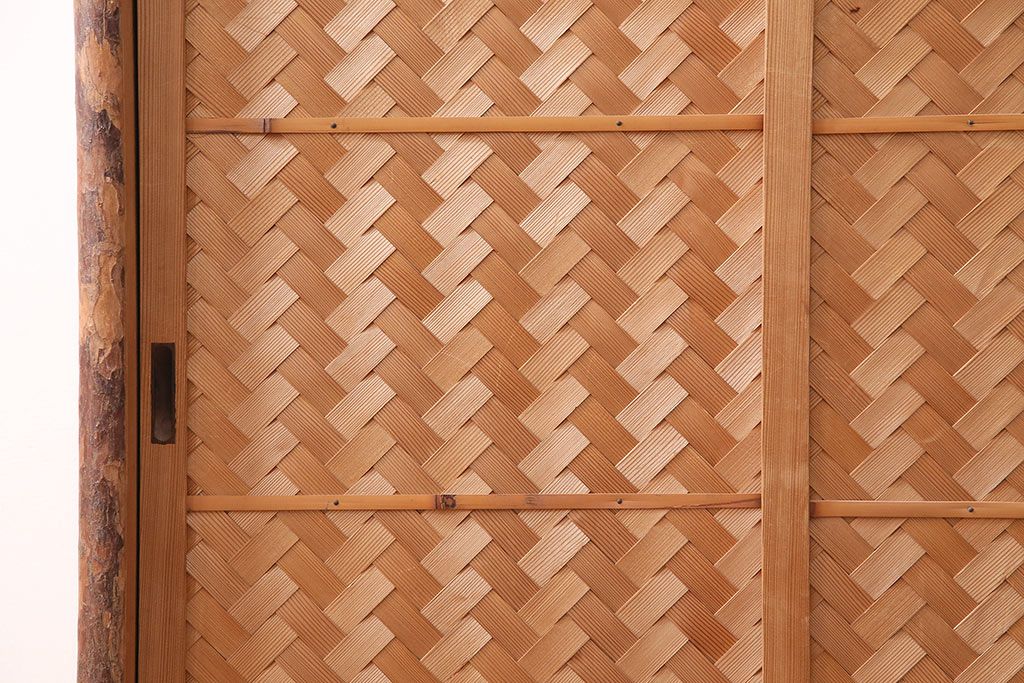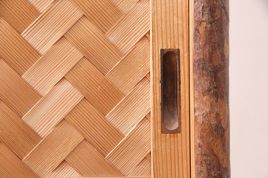 引き戸は網代編み、前面の支柱や取っ手は桜皮で装飾されており、