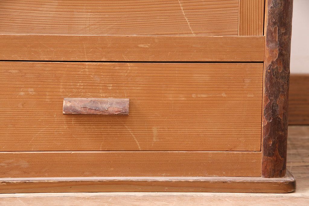 中古 民芸家具 杉材・桜皮 網代引戸が目を引く、手の込んだ造りが魅力の置き水屋(置水屋、茶水屋、茶道具、戸棚)(R-047931)です。
