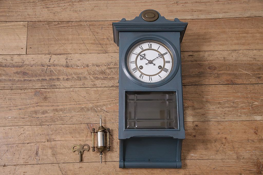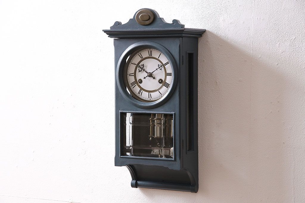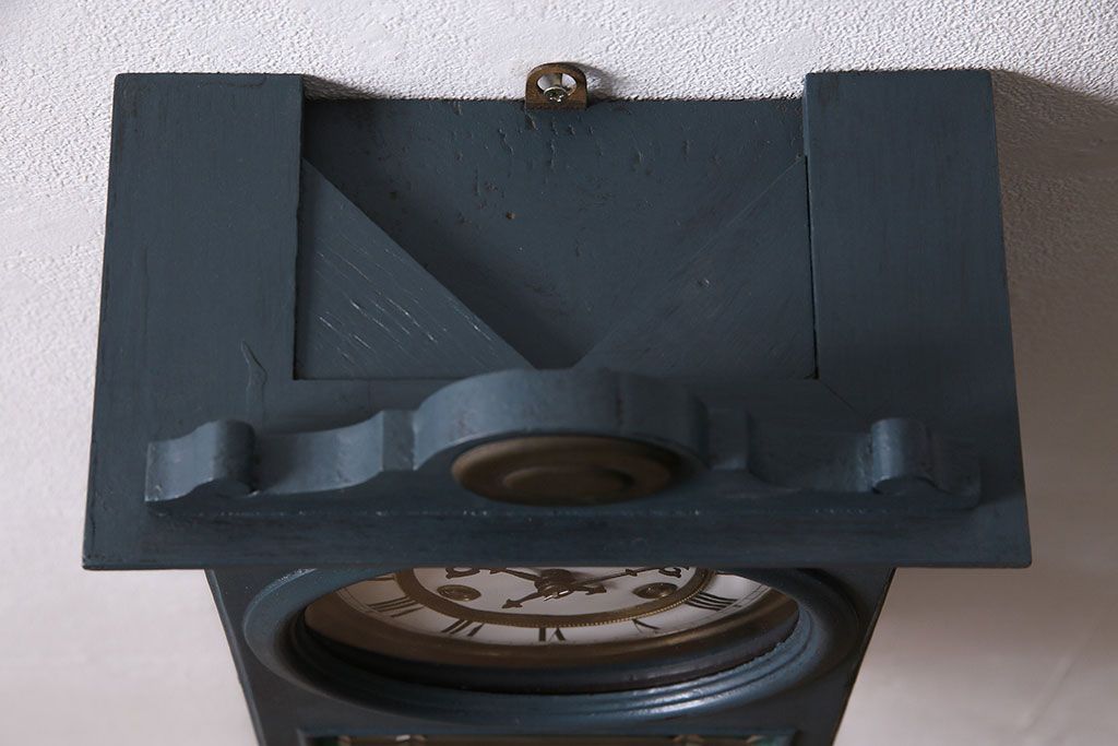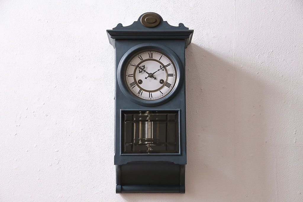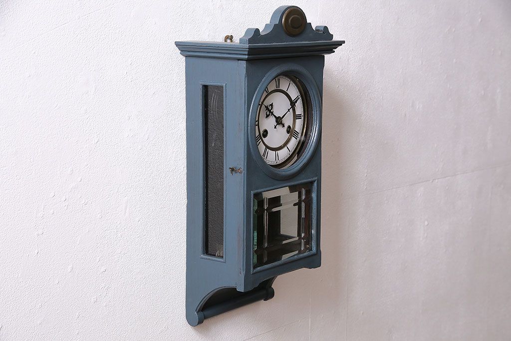 アンティーク時計 戦前 精工舎(セイコー、SEIKOSHA) 当店でネイビーのペイントを施した、筋ガラスがお洒落な掛時計(掛け時計、古時計)(R-047279)