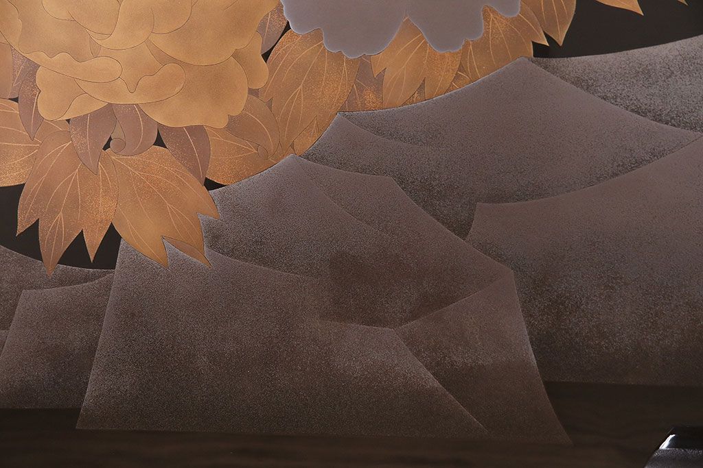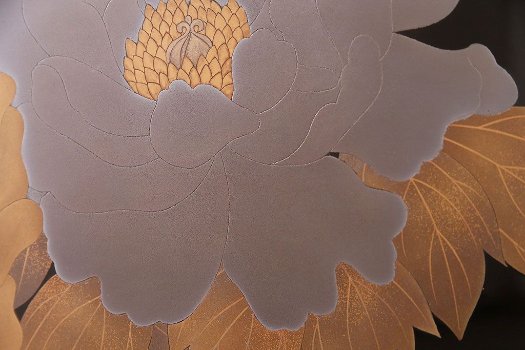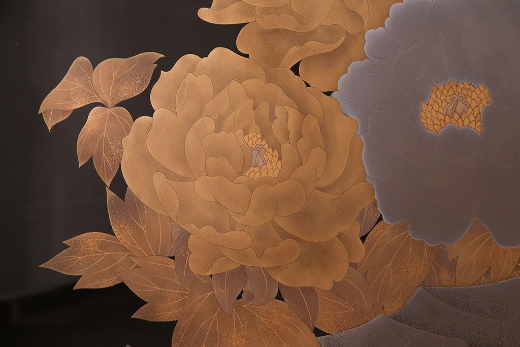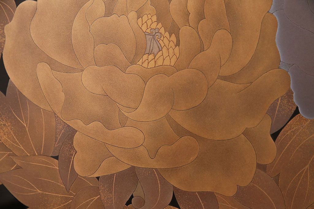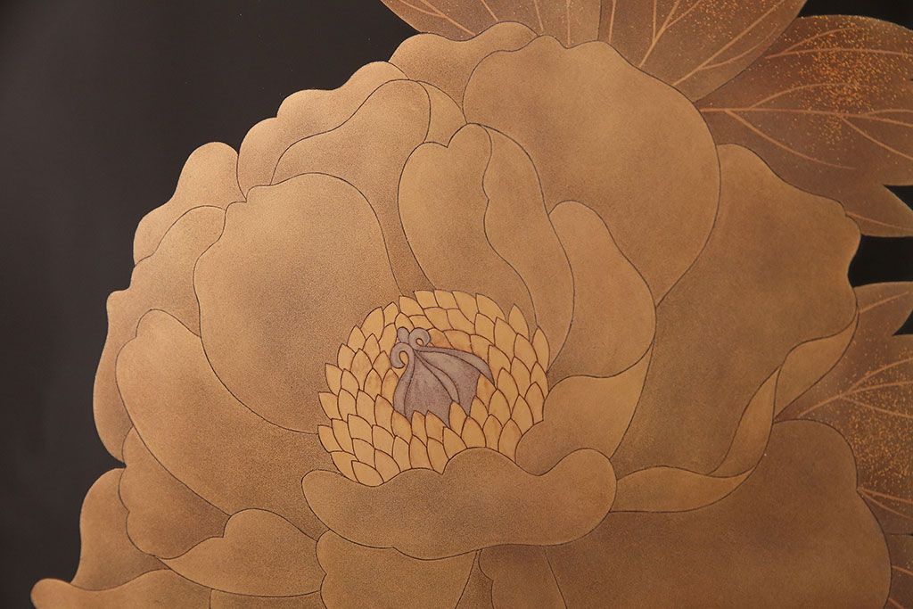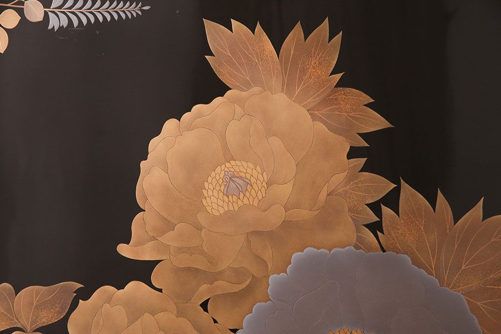 衝立・パーテーション > 中古 美品 民芸家具 輪島塗 井波唯志作 萩に牡丹 金銀蒔絵 蒔絵の意匠が見事な大振りの衝立(定価約450万円)(つい立て)(R-047826)