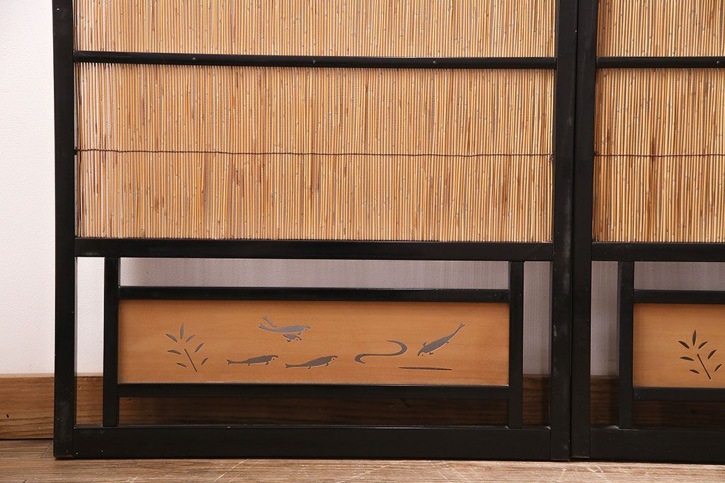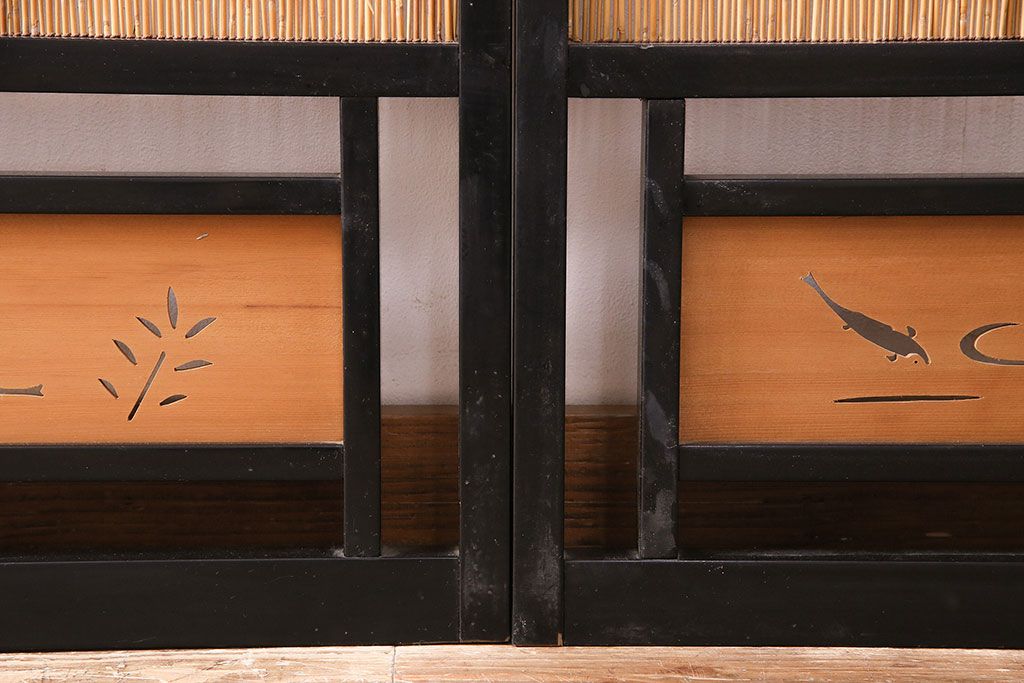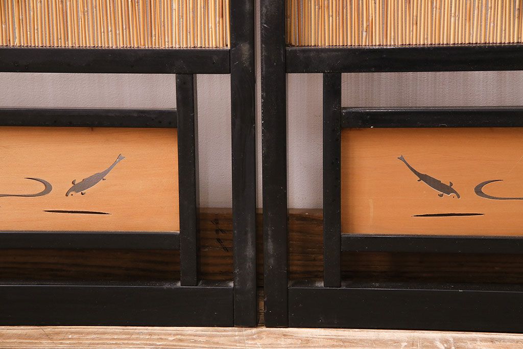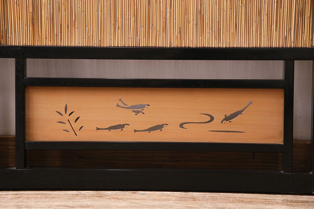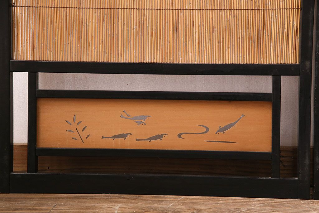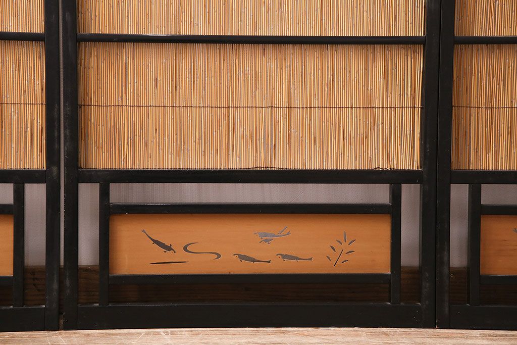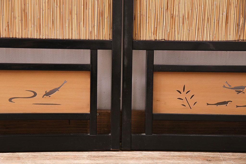 ドア・建具> 引き戸 > ビンテージ建具 上手物 漆塗り 泳ぐ鯉の透かしが風情漂う御簾戸4枚セット(簾戸、簀戸、葭戸、夏障子、夏戸、葦戸)(R-047612)
