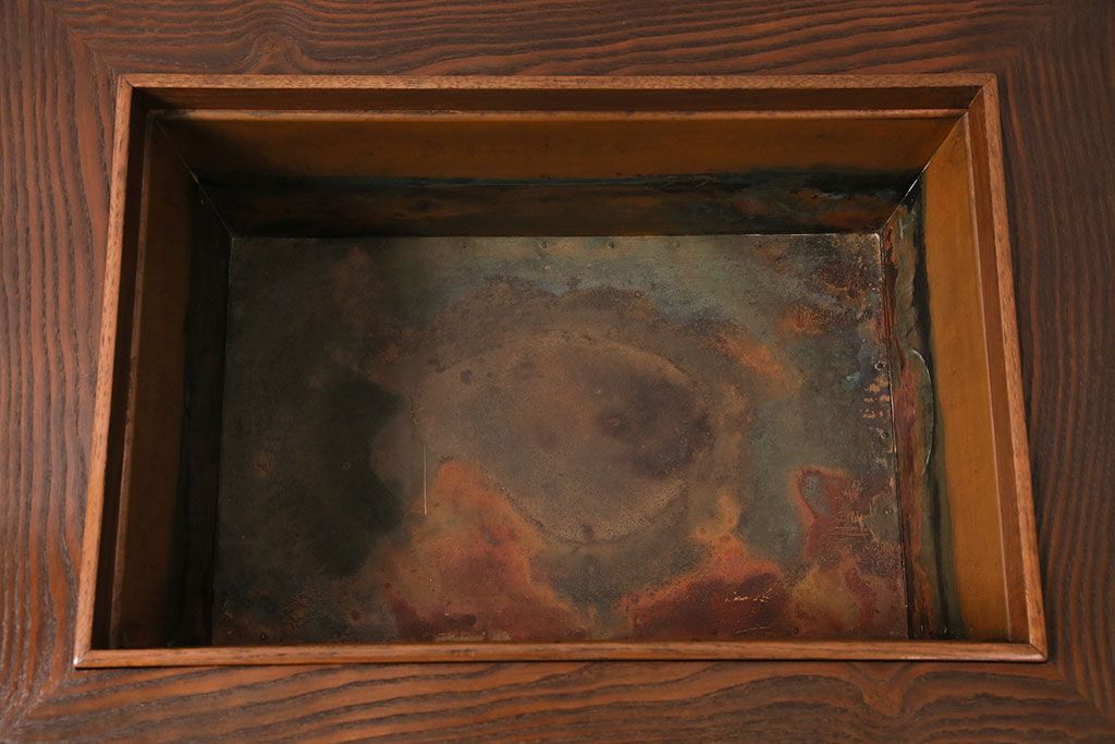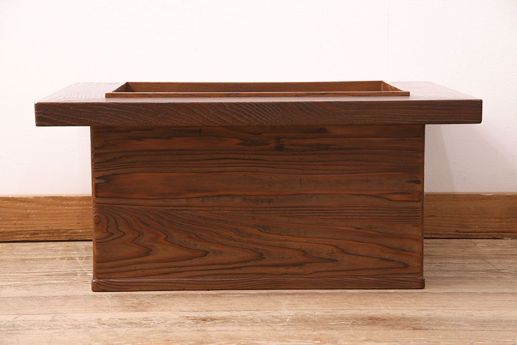 火鉢> 木製火鉢 > 和製アンティーク 指物工芸家具 天板桑材・本体杉材 浮造り仕上げが上質な和の雰囲気を高める木製角火鉢(囲炉裏)(R-048015)