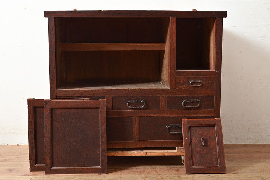 和箪笥> 水屋箪笥 > 和製アンティーク 和の趣たっぷりの前面ケヤキ材製の関東水屋箪笥(収納棚、茶箪笥、キャビネット)(R-047538)