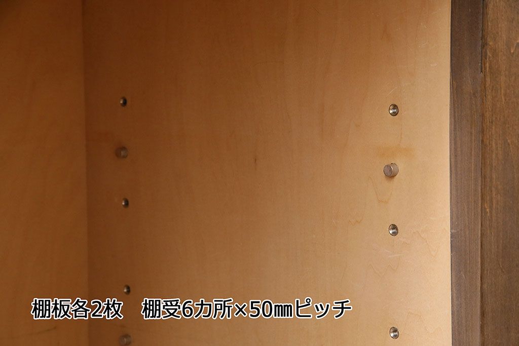 棚板は取り外しできます。棚板は各2枚あります。棚受けは6ヶ所、50mmピッチで調整できます。棚幅サイズのものが1枚の作りです。