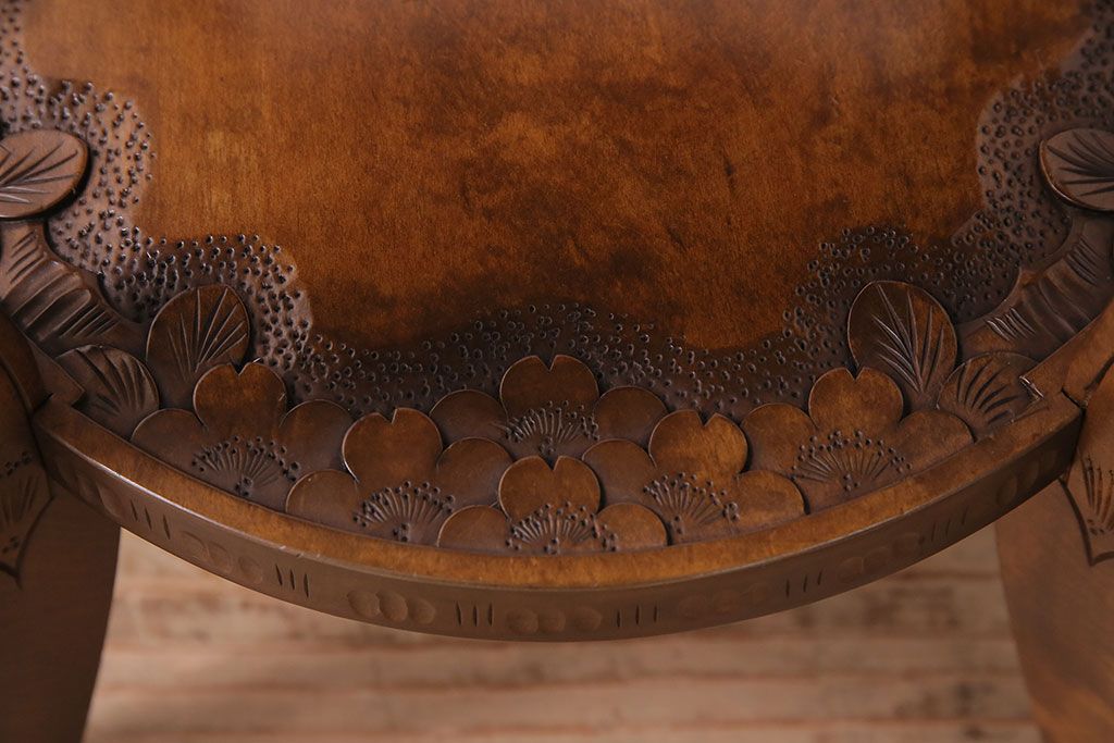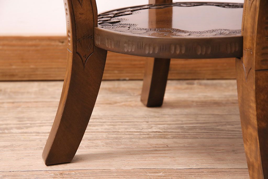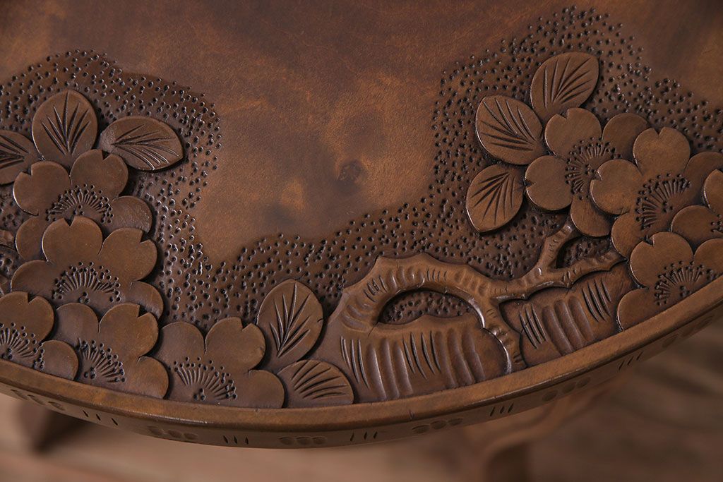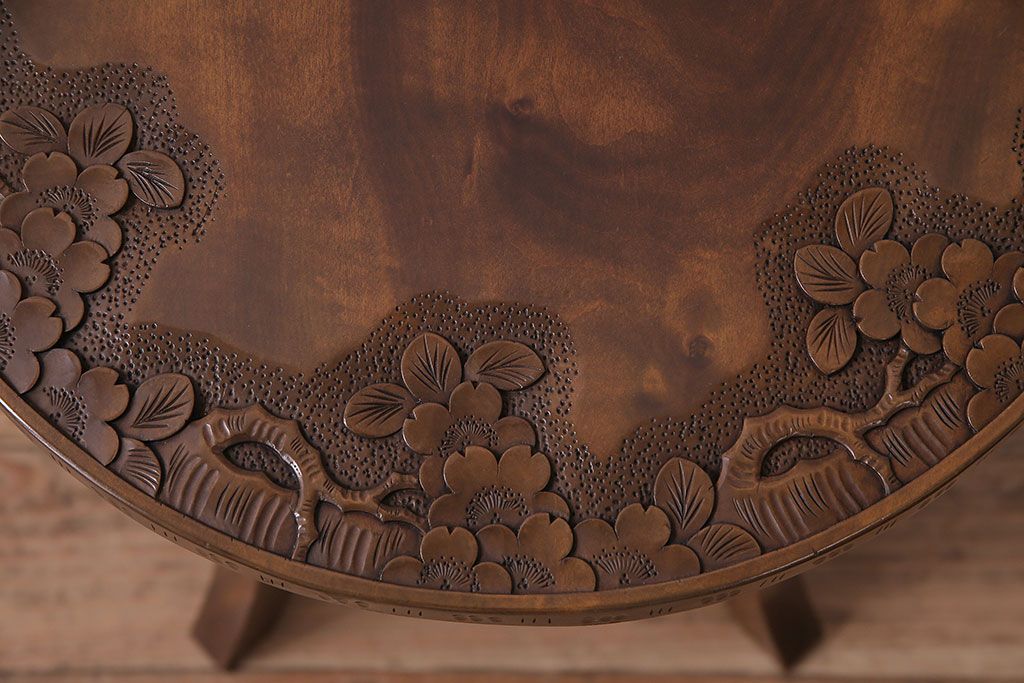 民芸家具 > 中古 伝統工芸 軽井沢彫り 華やかな桜の彫刻が見事なサイドテーブル(丸テーブル、花台、飾り台、カフェテーブル)(R-047635)
