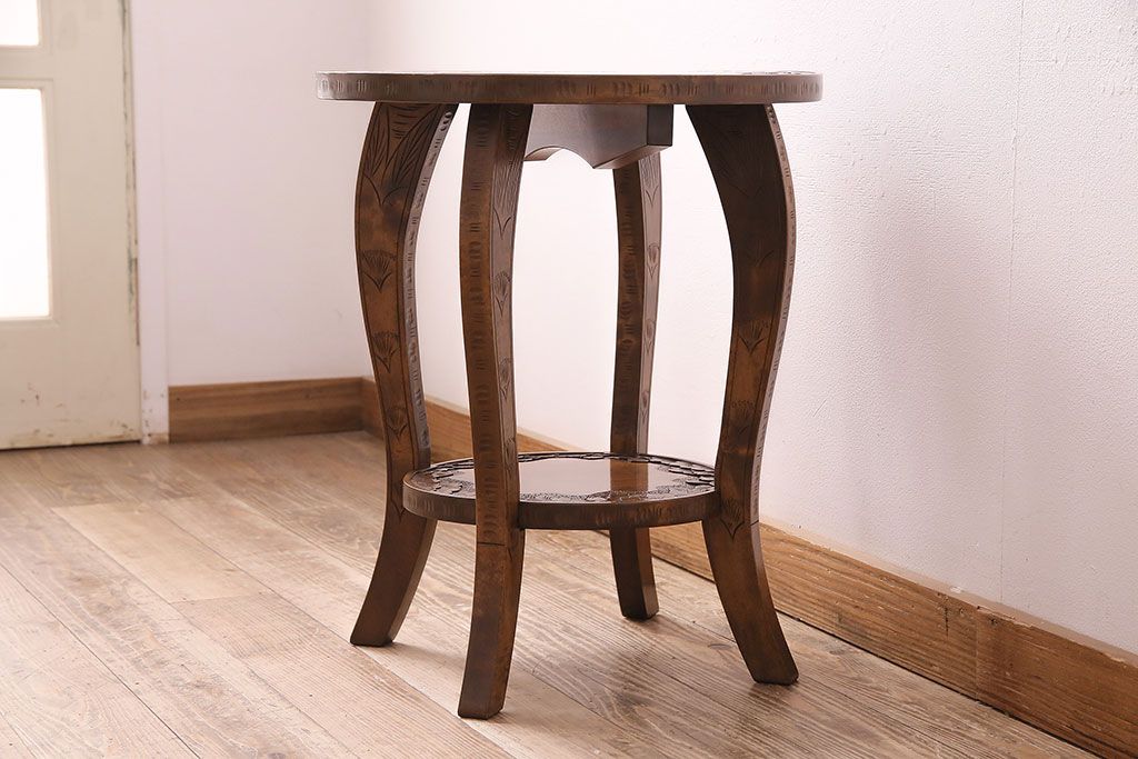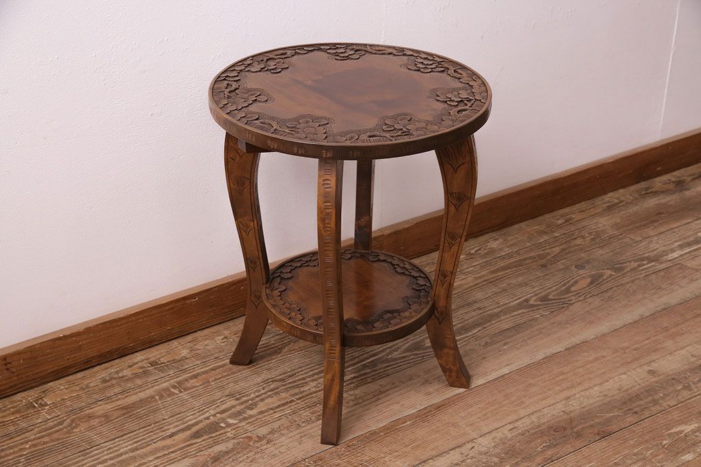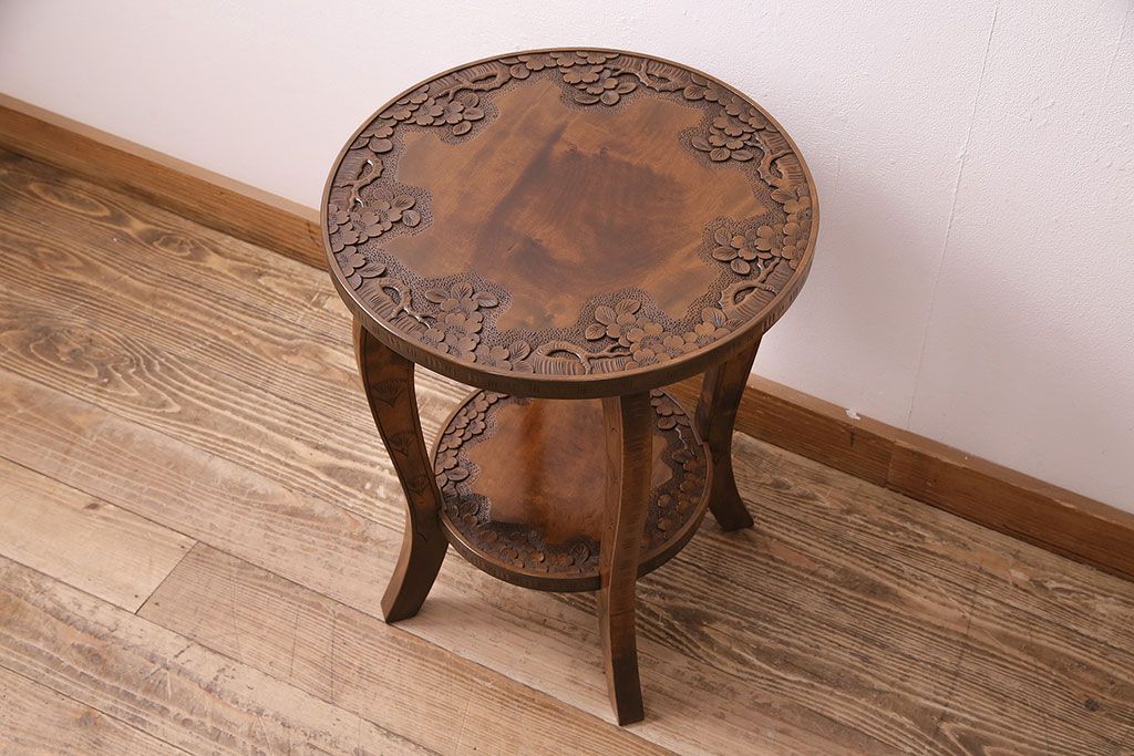 テーブル> サイドテーブル > 中古 伝統工芸 軽井沢彫り 華やかな桜の彫刻が見事なサイドテーブル(丸テーブル、花台、飾り台、カフェテーブル)(R-047635)