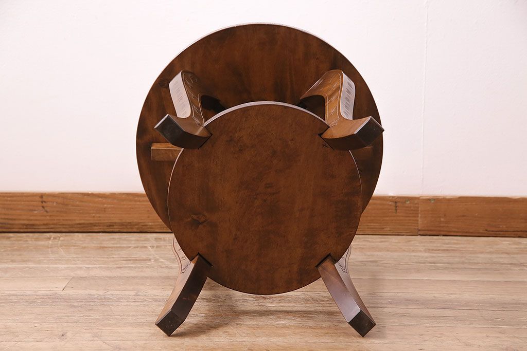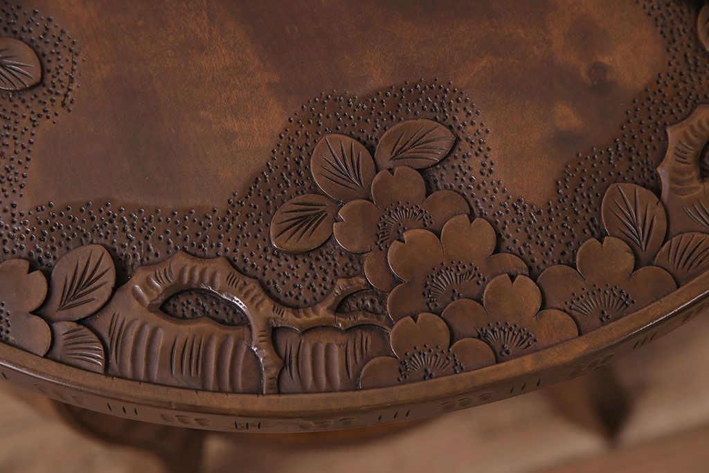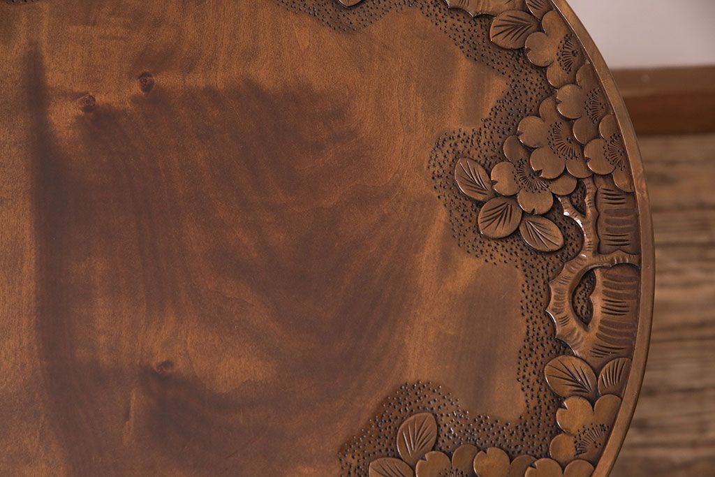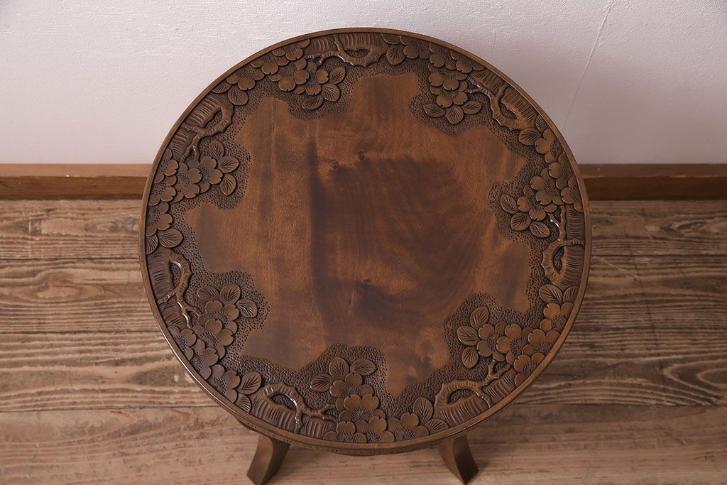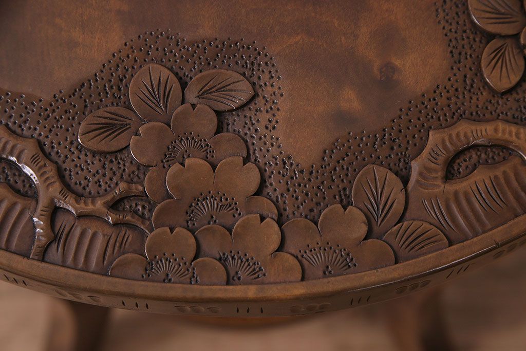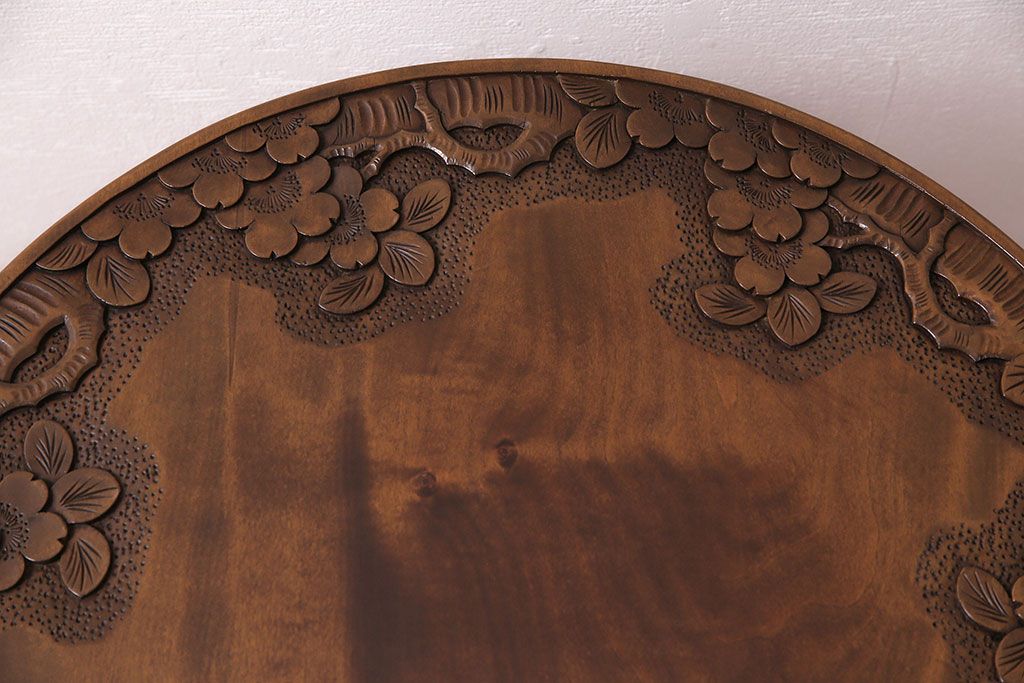 テーブル> カフェテーブル・コーヒーテーブル > 中古 伝統工芸 軽井沢彫り 華やかな桜の彫刻が見事なサイドテーブル(丸テーブル、花台、飾り台、カフェテーブル)(R-047635)