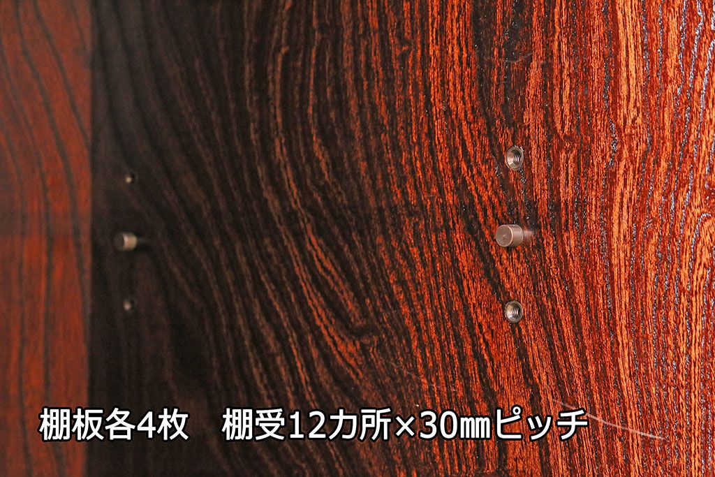 棚板は取り外しできます。棚板は各4枚あります。棚受けは各12ヶ所、30mmピッチで調整できます。棚幅サイズのものが1枚の作りです。