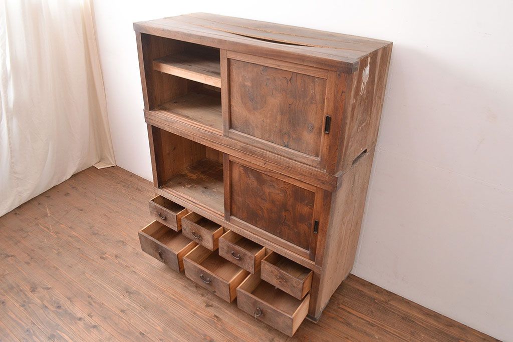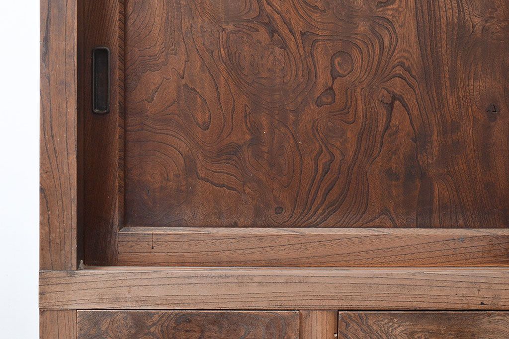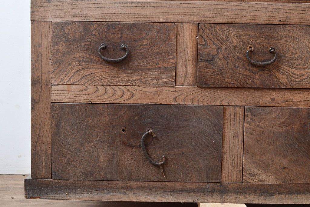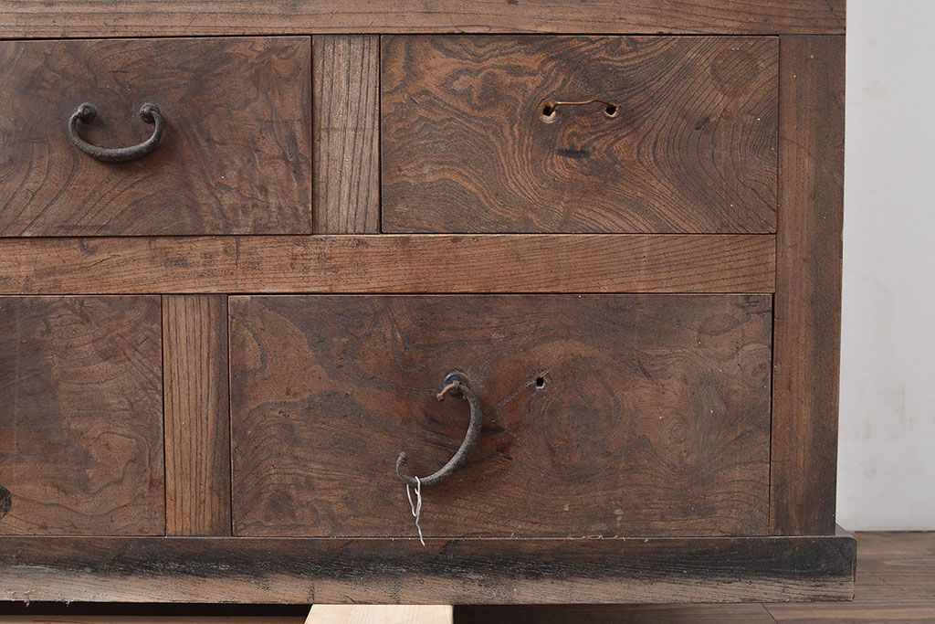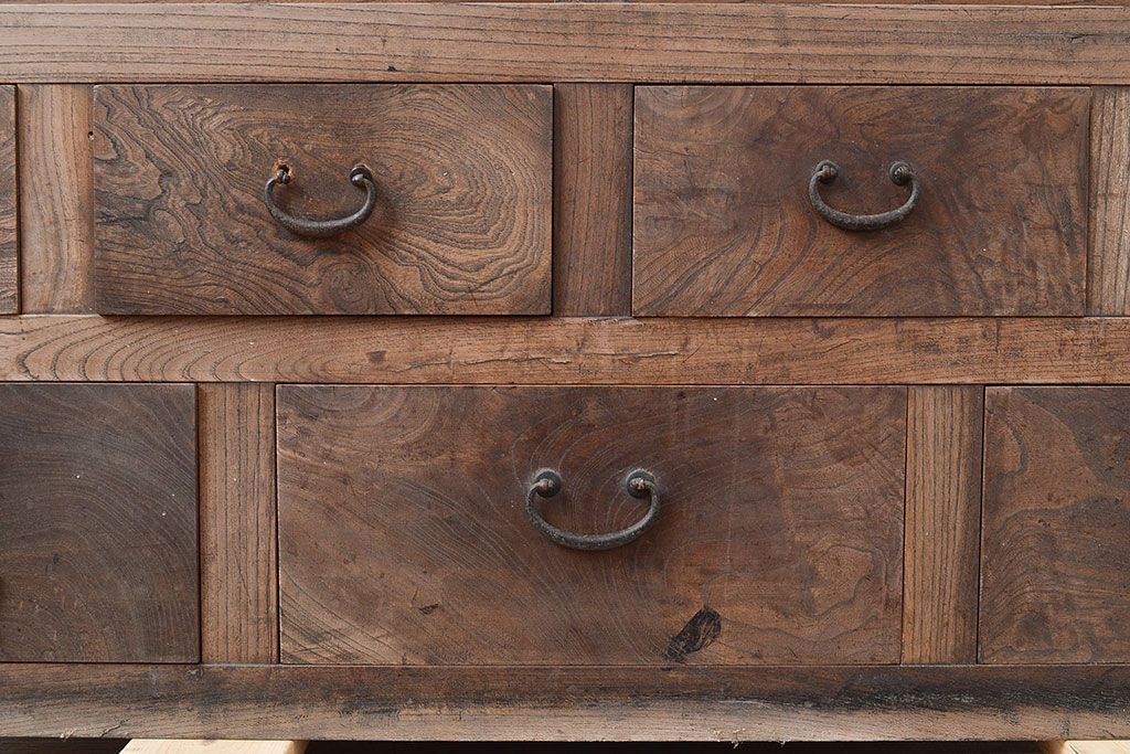 和箪笥 > 和製アンティーク 前面ケヤキ材 引き出し付き 味のある木肌と力強い杢目が魅力的な箪笥サイドボード(時代箪笥、収納棚)(R-047860)