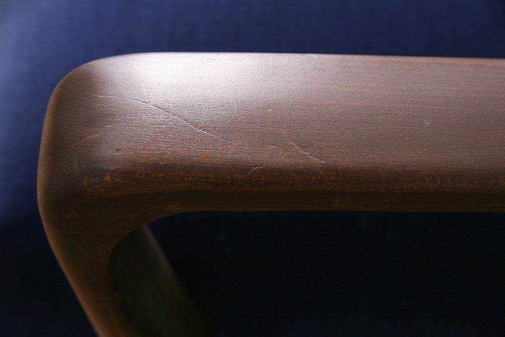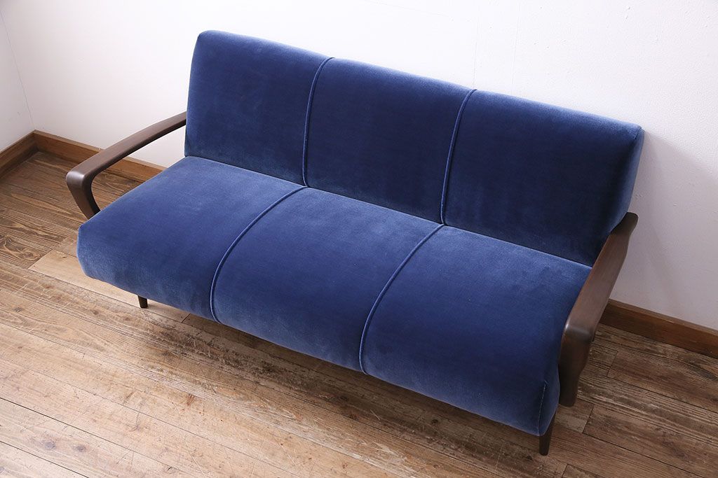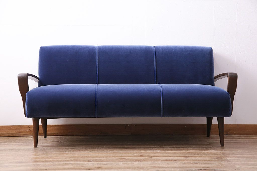 木製フレームの3人掛けソファをリペア&カスタム!生地を張り替え、3分割に縫い目を付けて鋲で仕上げ。フレームはブラウンに着色。(3Pソファ、トリプルソファ)