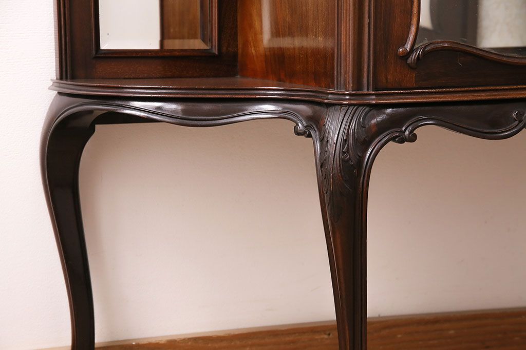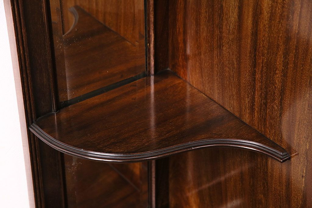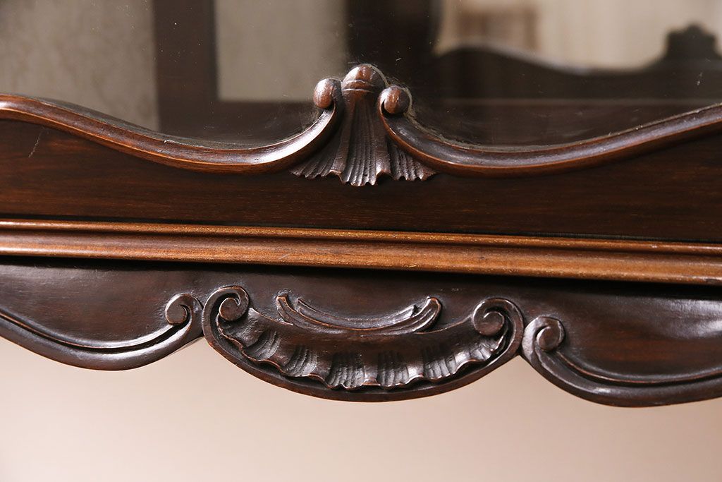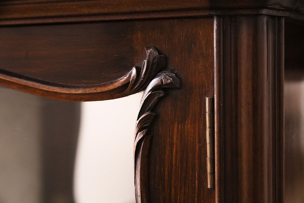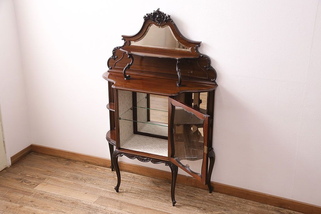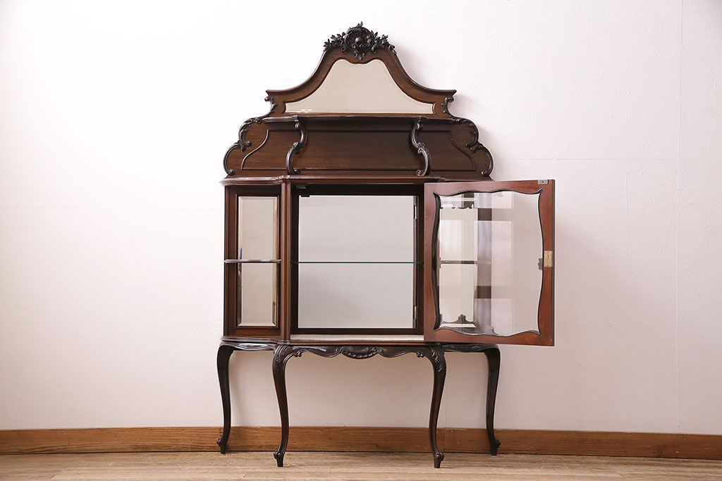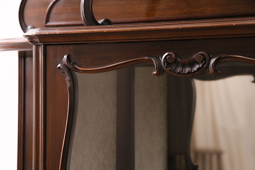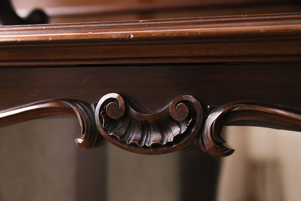 イギリスアンティーク 高級品!マホガニー材の艶やかな木肌と凝った彫刻が美しいパーラーキャビネット(飾り棚)(R-047614)です。