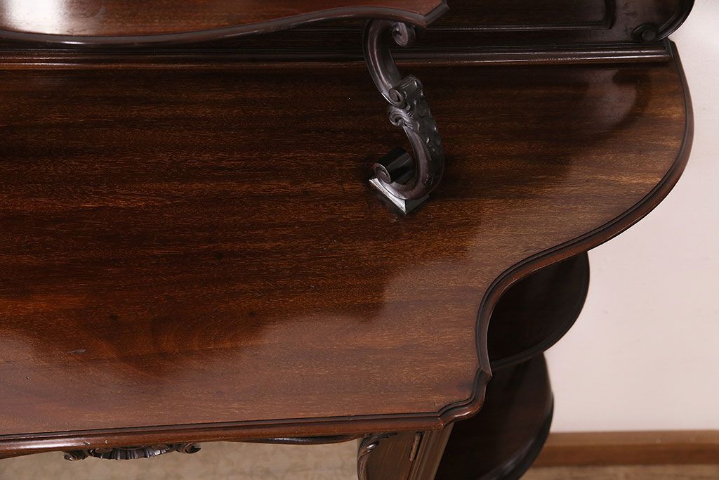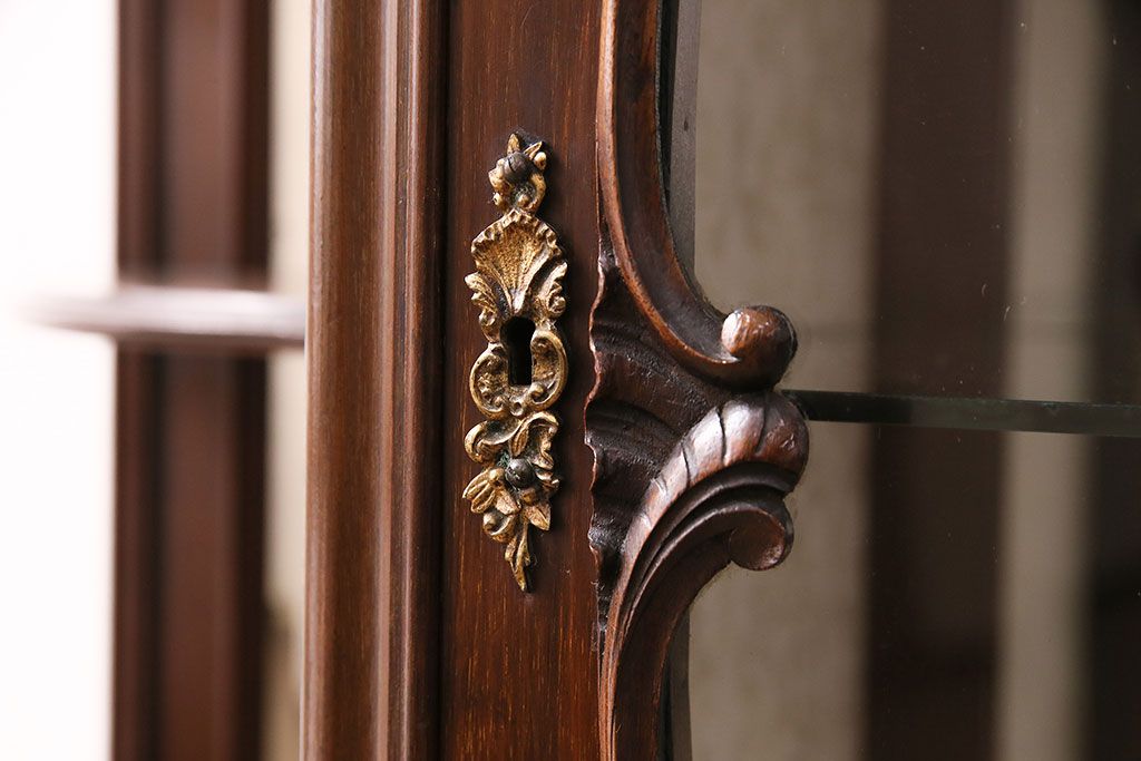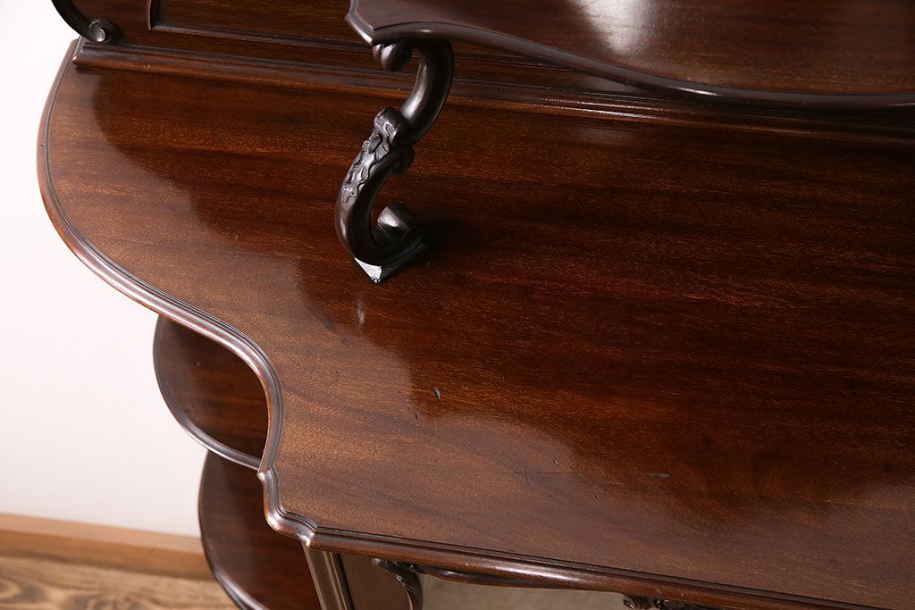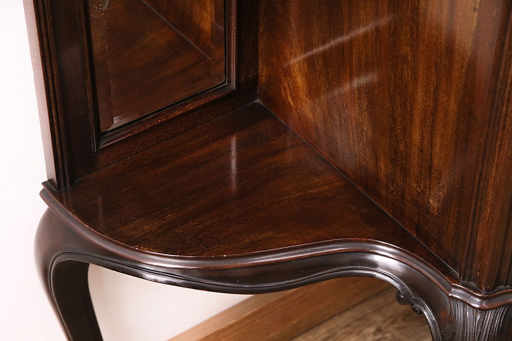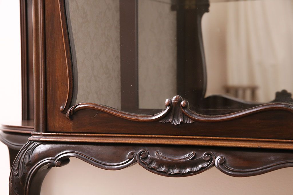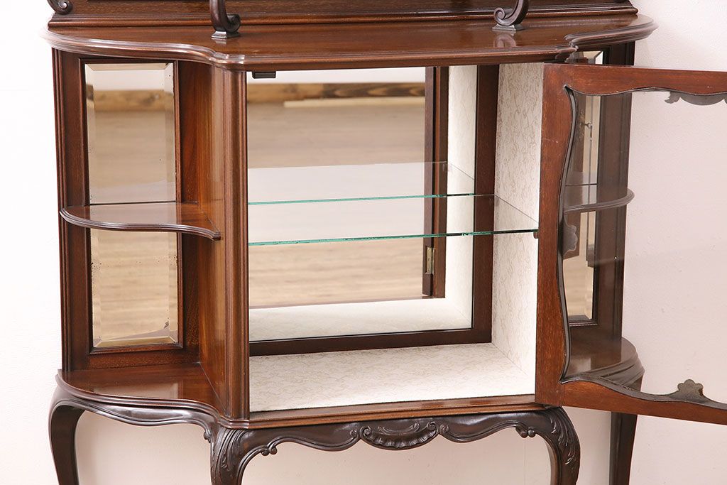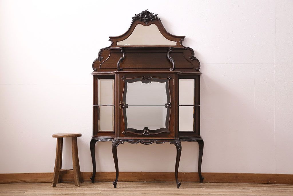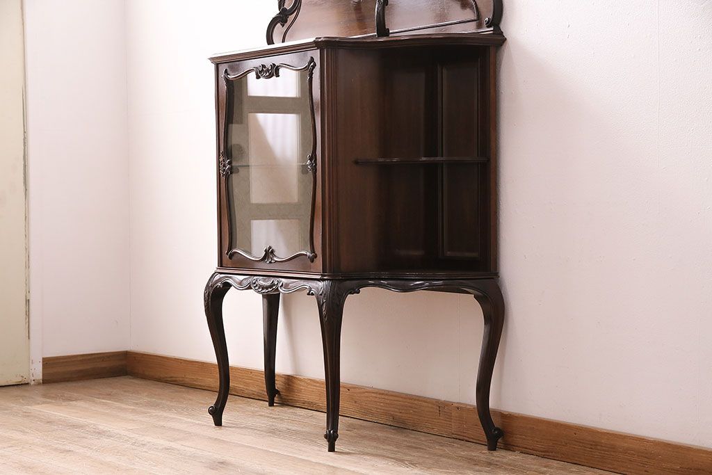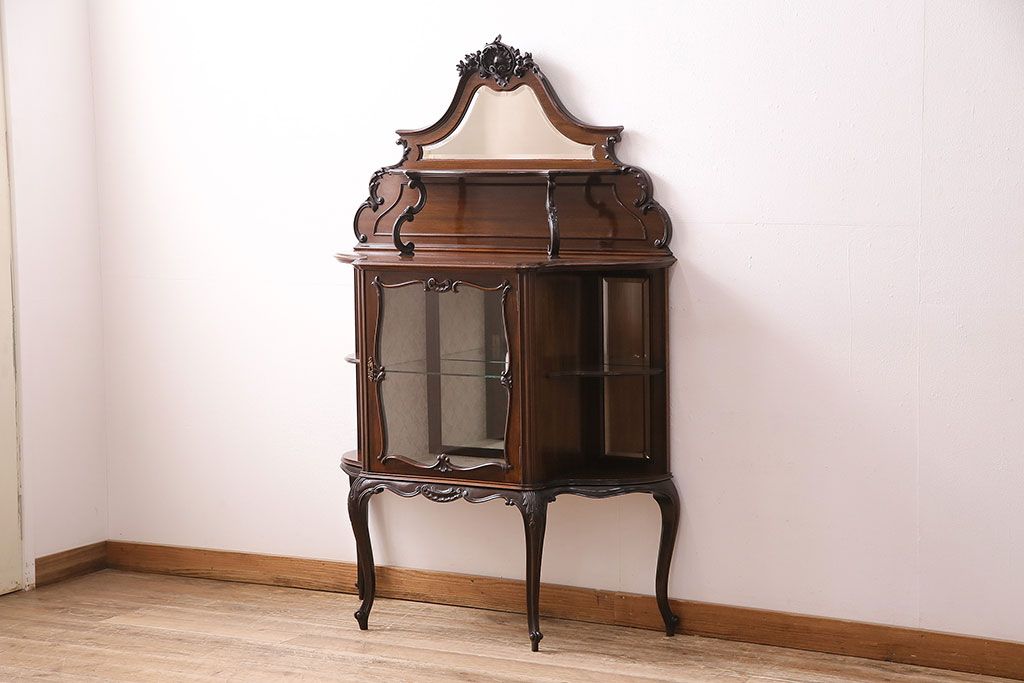 イギリスアンティーク 高級品!マホガニー材の艶やかな木肌と凝った彫刻が美しいパーラーキャビネット(飾り棚)(R-047614)です。