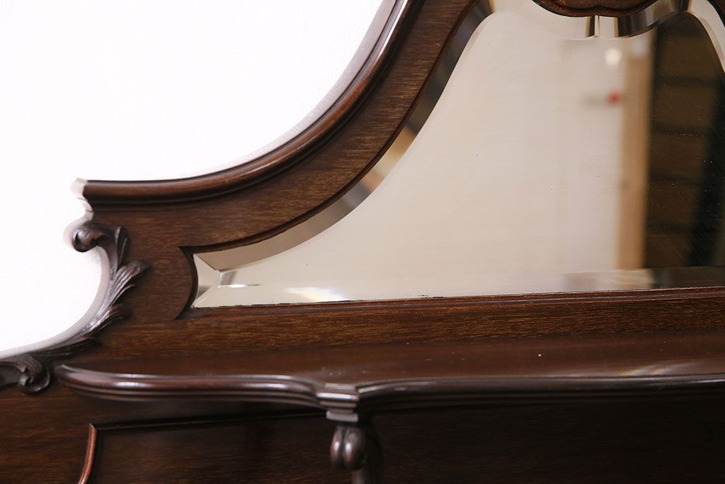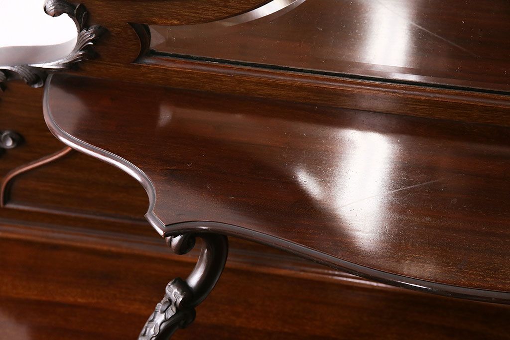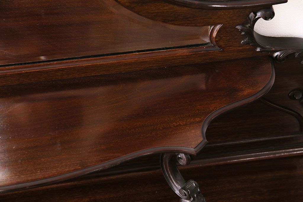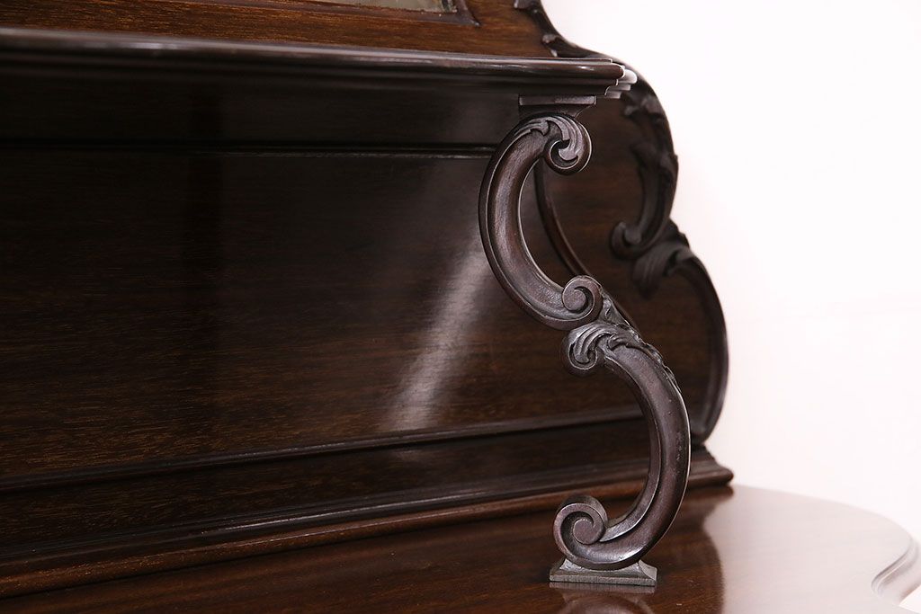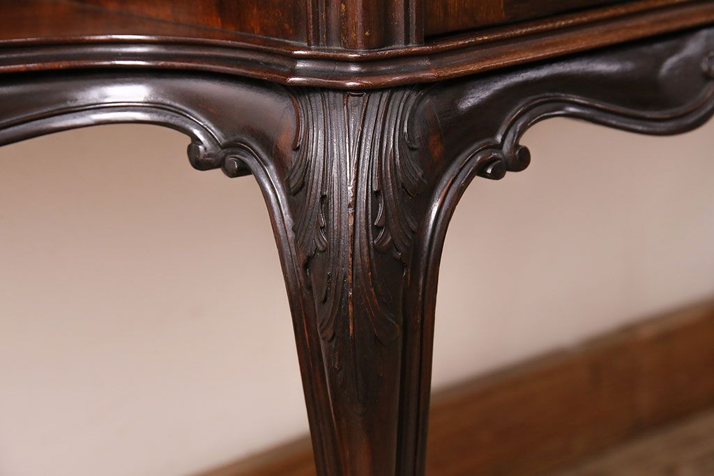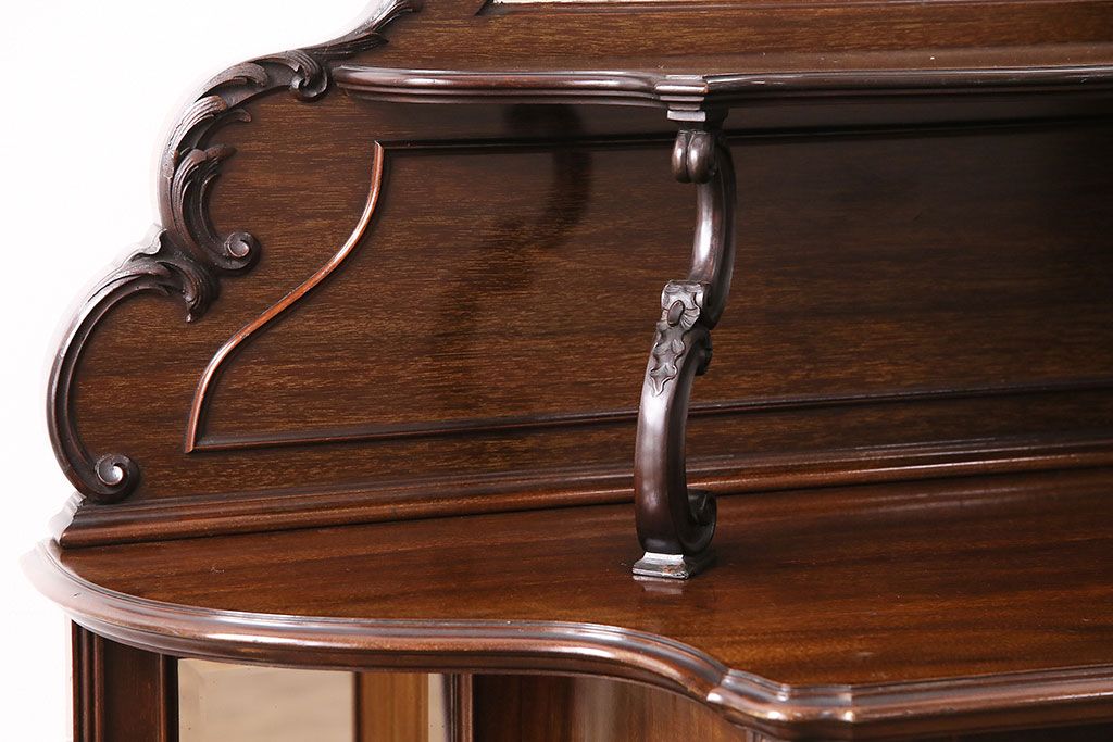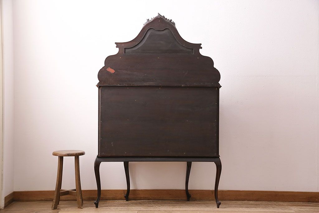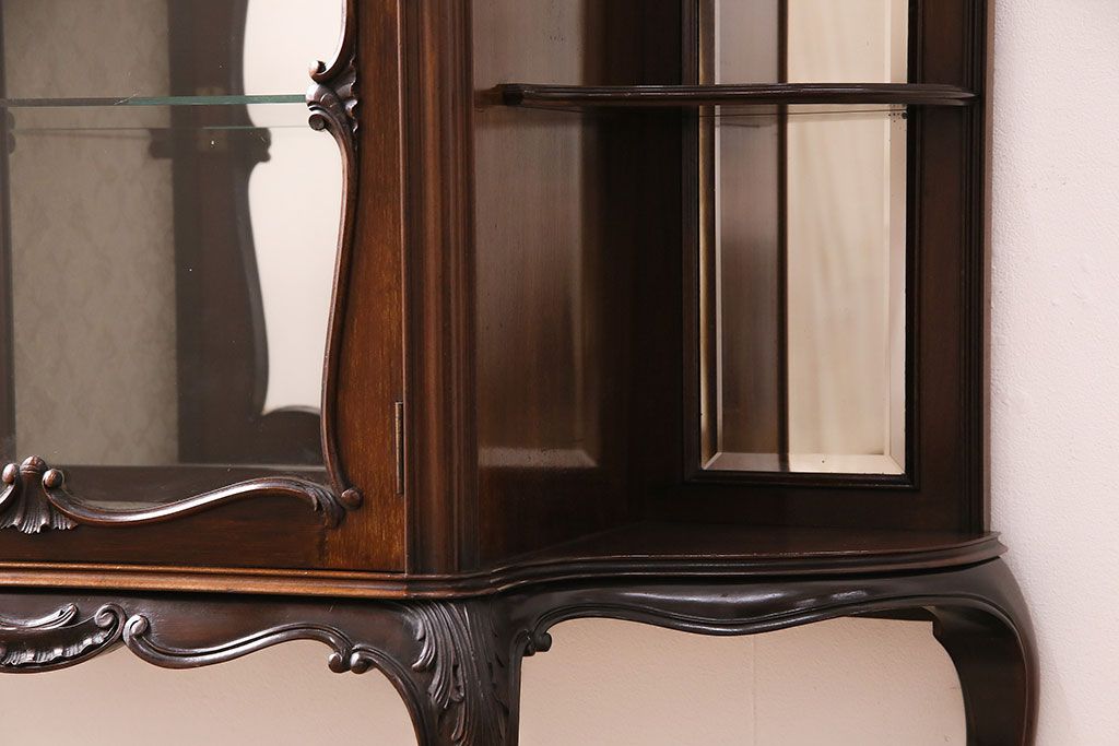 イギリスアンティーク 高級品!マホガニー材の艶やかな木肌と凝った彫刻が美しいパーラーキャビネット(飾り棚)(R-047614)です。