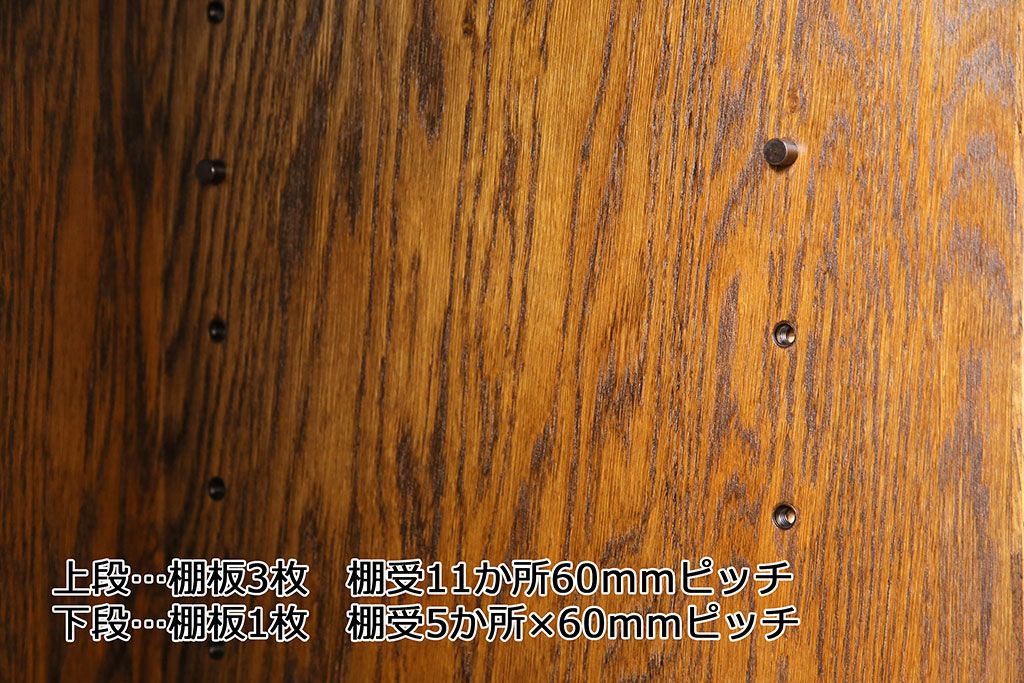 棚板は取り外しできます。上段の棚板は3枚あります。棚受けは11ヶ所、60mmピッチで調整できます。下段の棚板は1枚あります。棚受けは5ヶ所、60mmピッチで調整できます。棚幅サイズのものが1枚の作りです。